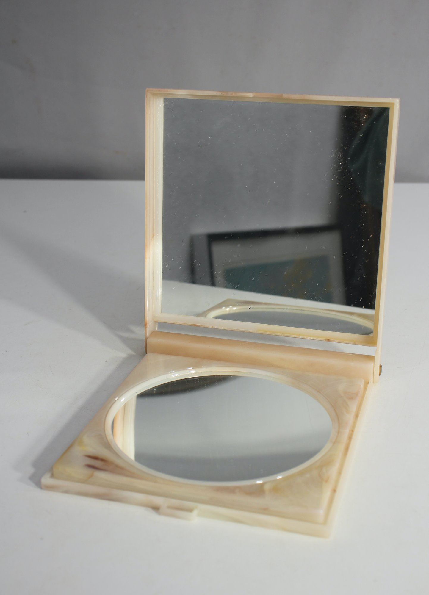 This listing features a beautiful vintage compact made of faux tortoiseshell. The compact includes two mirrors: one standard and one magnifying, enclosed in a sleek and elegant case. Perfect for collectors or as a functional accessory for on-the-go touch-ups.