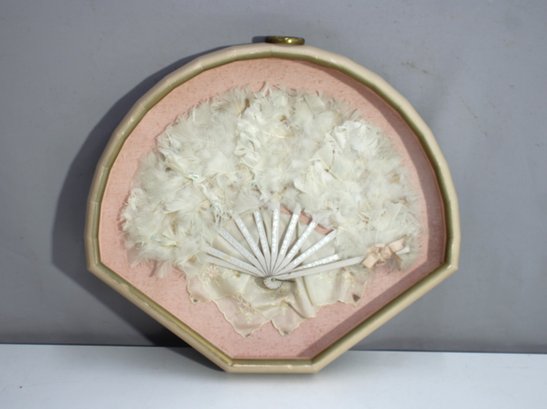 vintage feather hand fan displayed in a custom octagonal shadowbox frame. The fan features soft white feathers with a delicate ribbed structure, beautifully arranged against a pale pink fabric backing. The frame is finished in a cream tone with gold trim and includes a hanging loop for easy wall display.