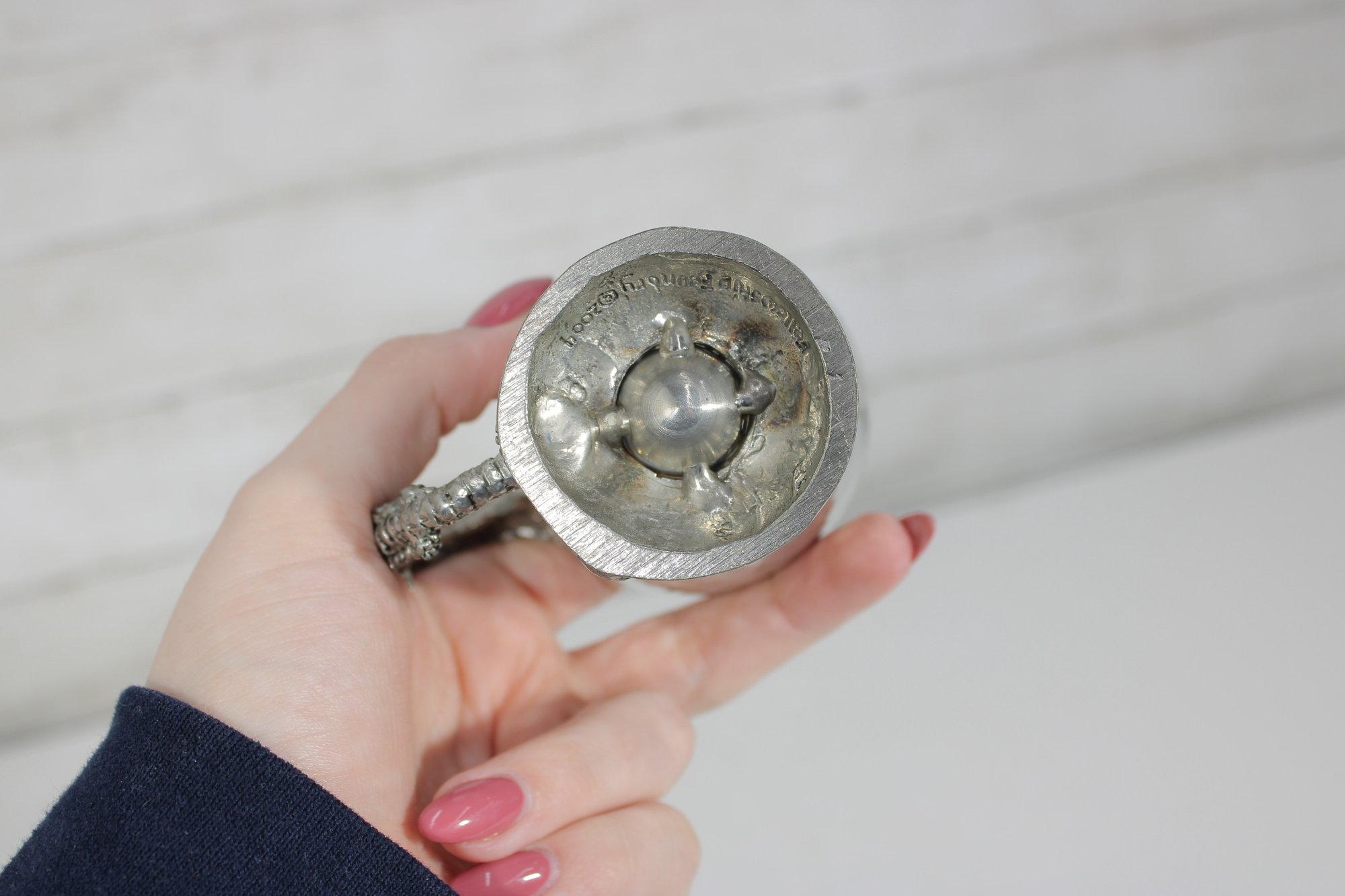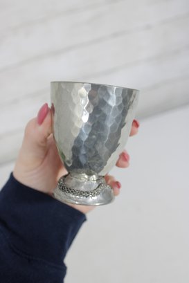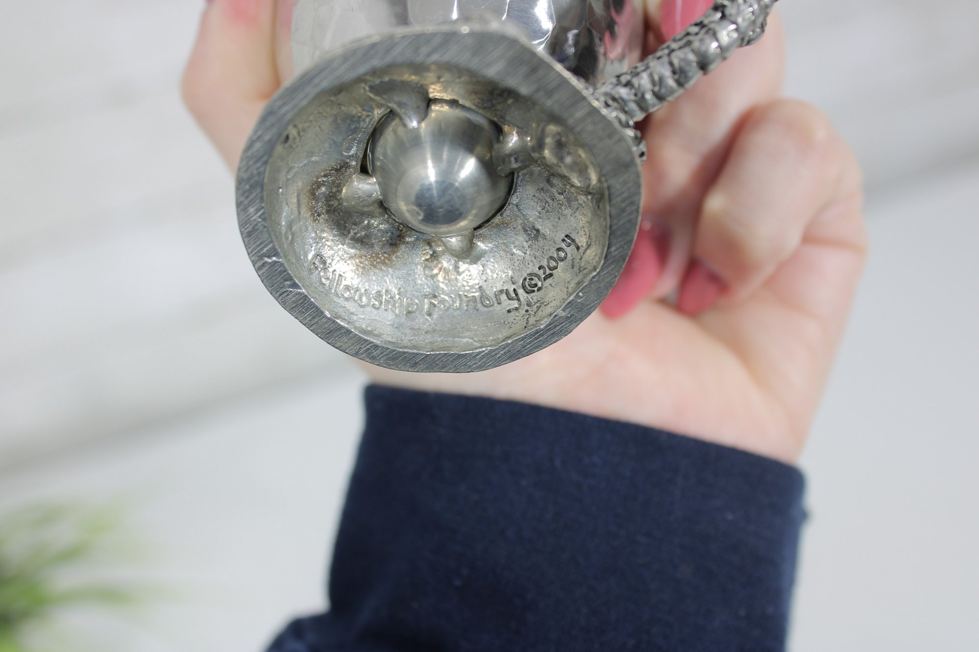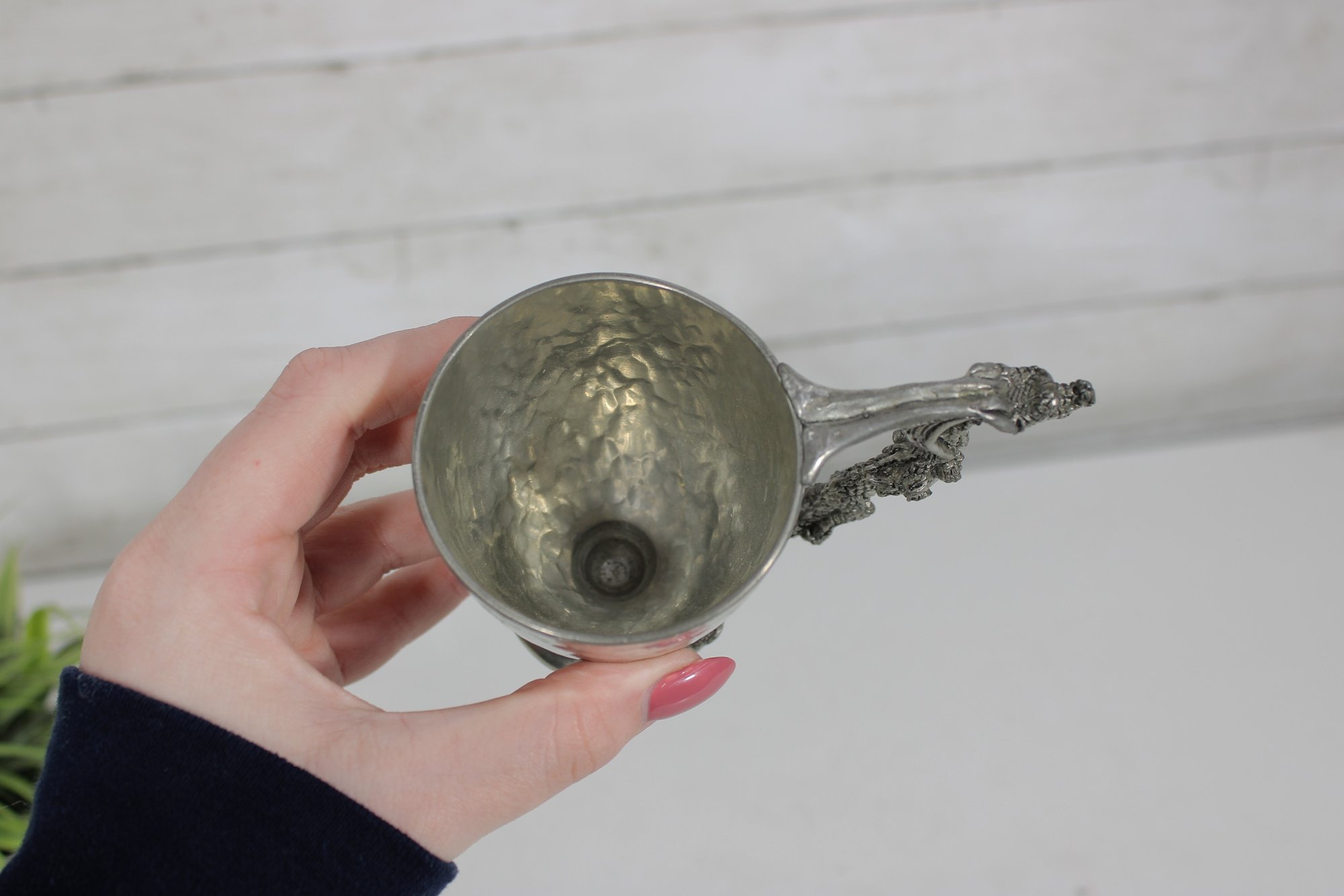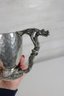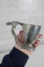 The cup has a hammered pewter body that catches the light nicely, paired with an ornate sculpted base and handle. The dragon handle wraps elegantly from rim to base, showcasing fine textural detail throughout. The underside is clearly marked “Fellowship Foundry 2004,” confirming its authenticity.