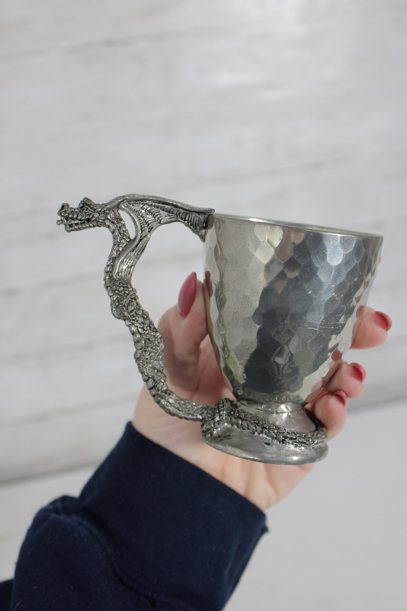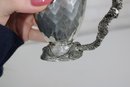 Add a touch of fantasy and craftsmanship to your collection with this vintage pewter cup from Fellowship Foundry, dated 2004. This unique mug features a beautifully detailed dragon-form handle, giving it a striking medieval or mythical aesthetic.