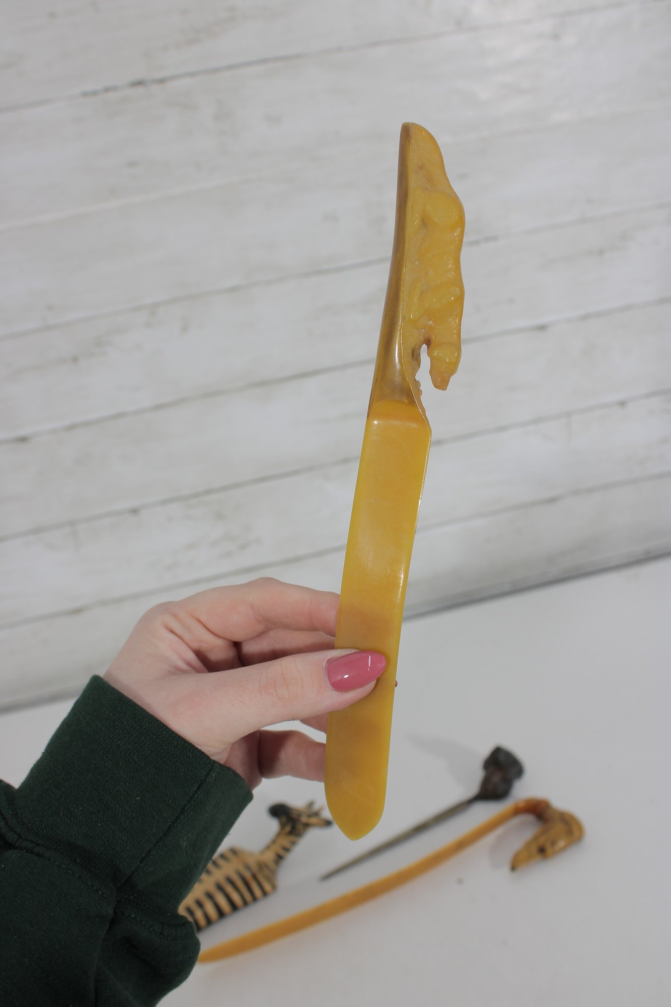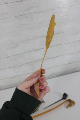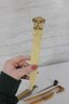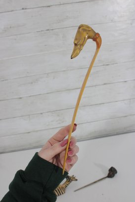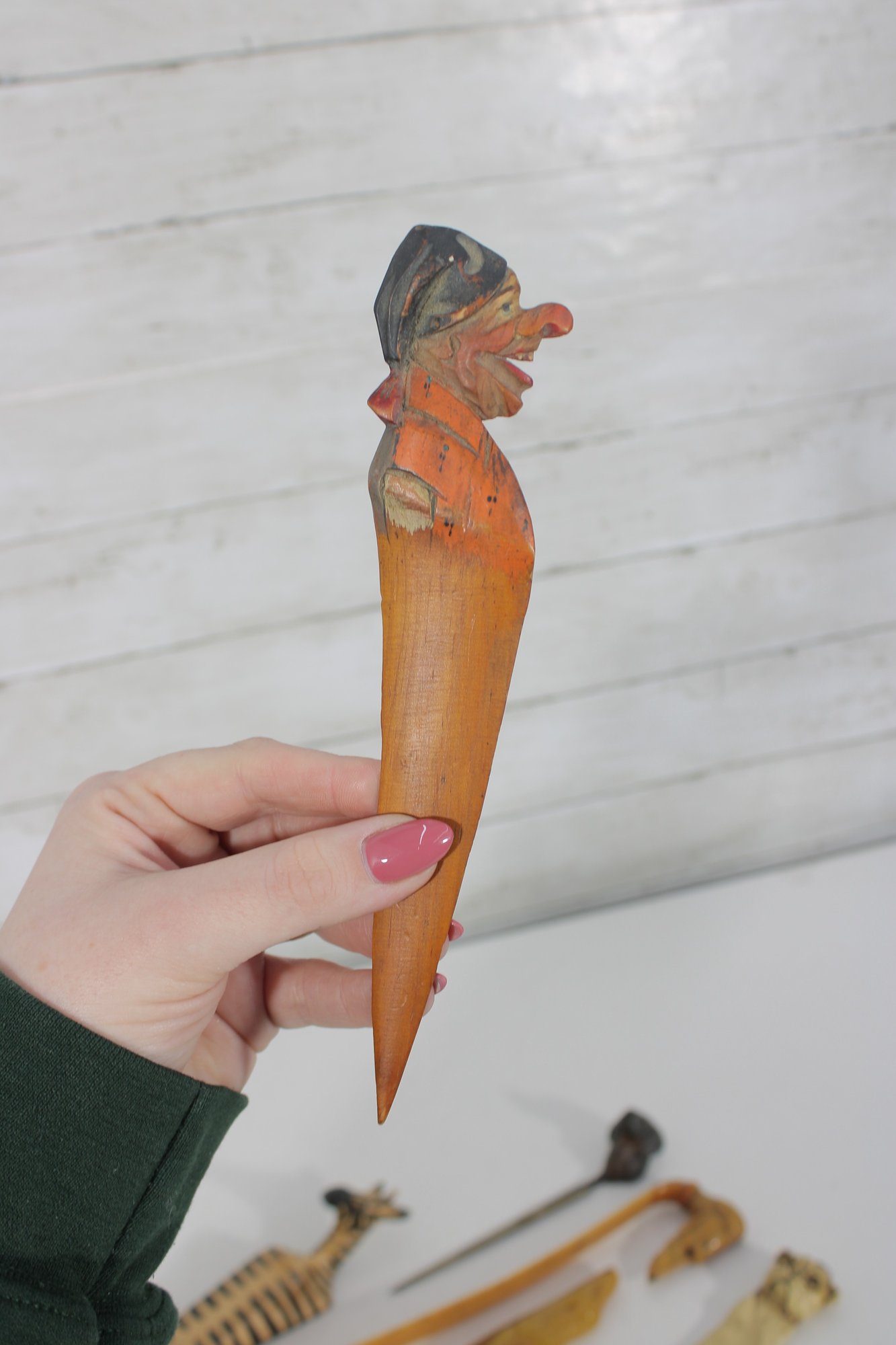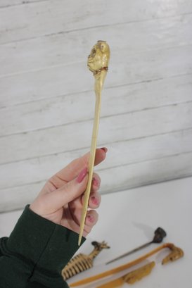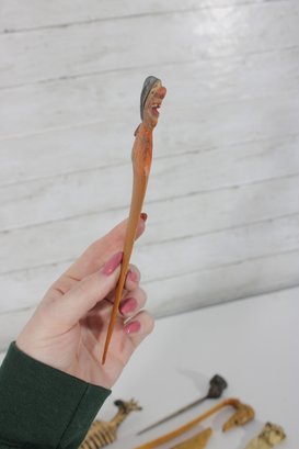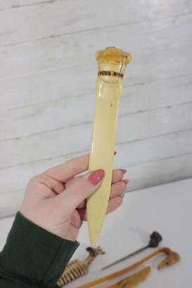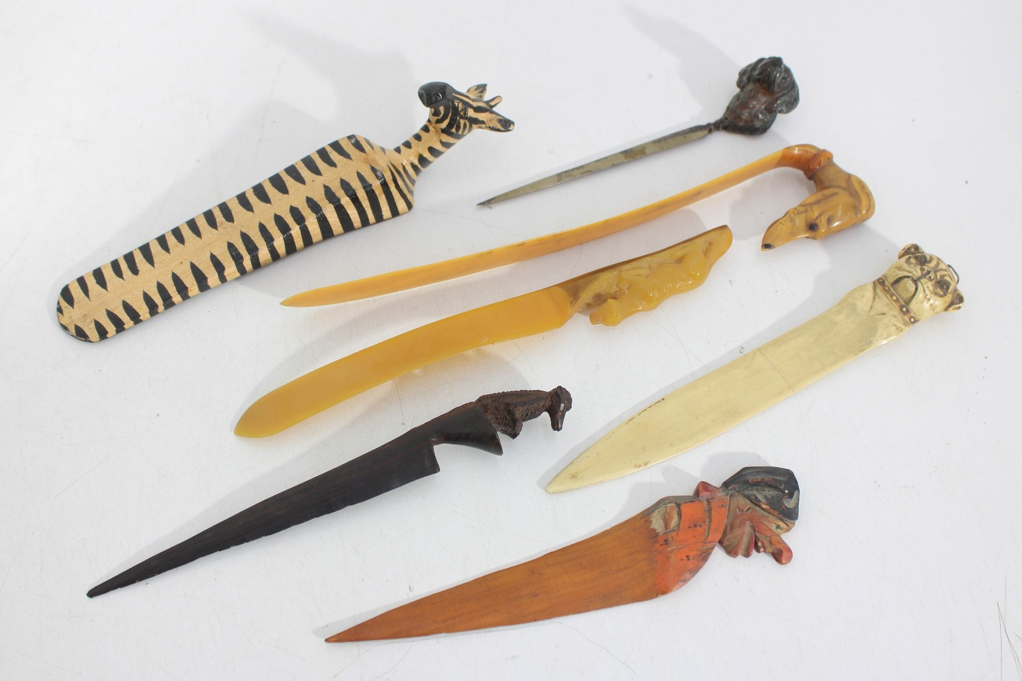 The lot includes 7 pieces total, each with a distinctive design such as carved animals, character heads, and decorative handles. Materials appear to include carved wood, bone or faux bone, metal, and celluloid or plastic, typical of mid-century novelty desk accessories.