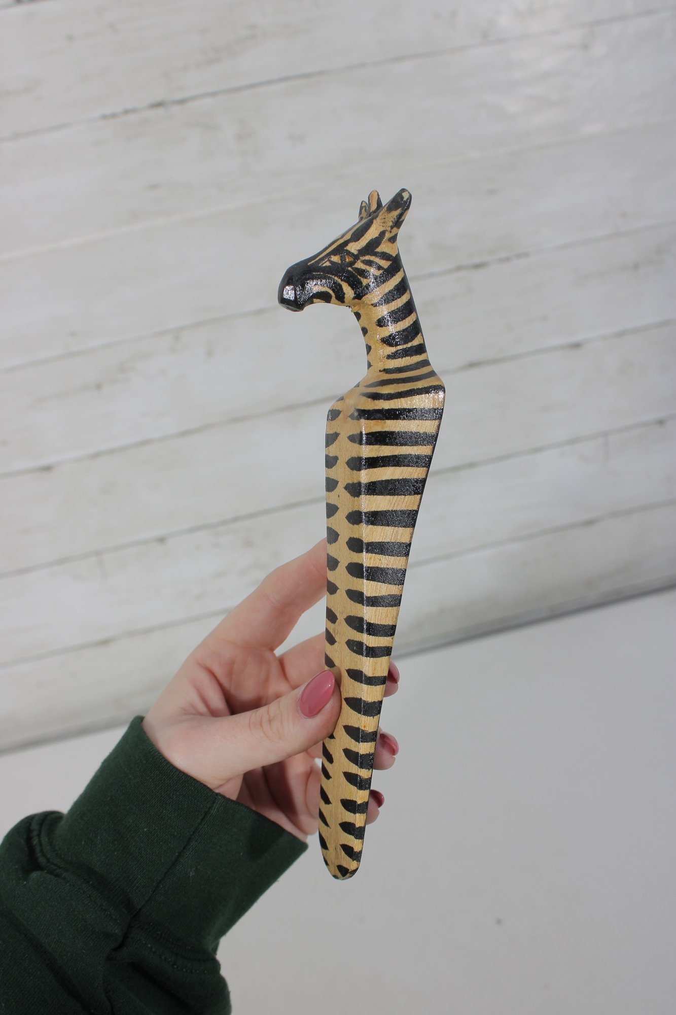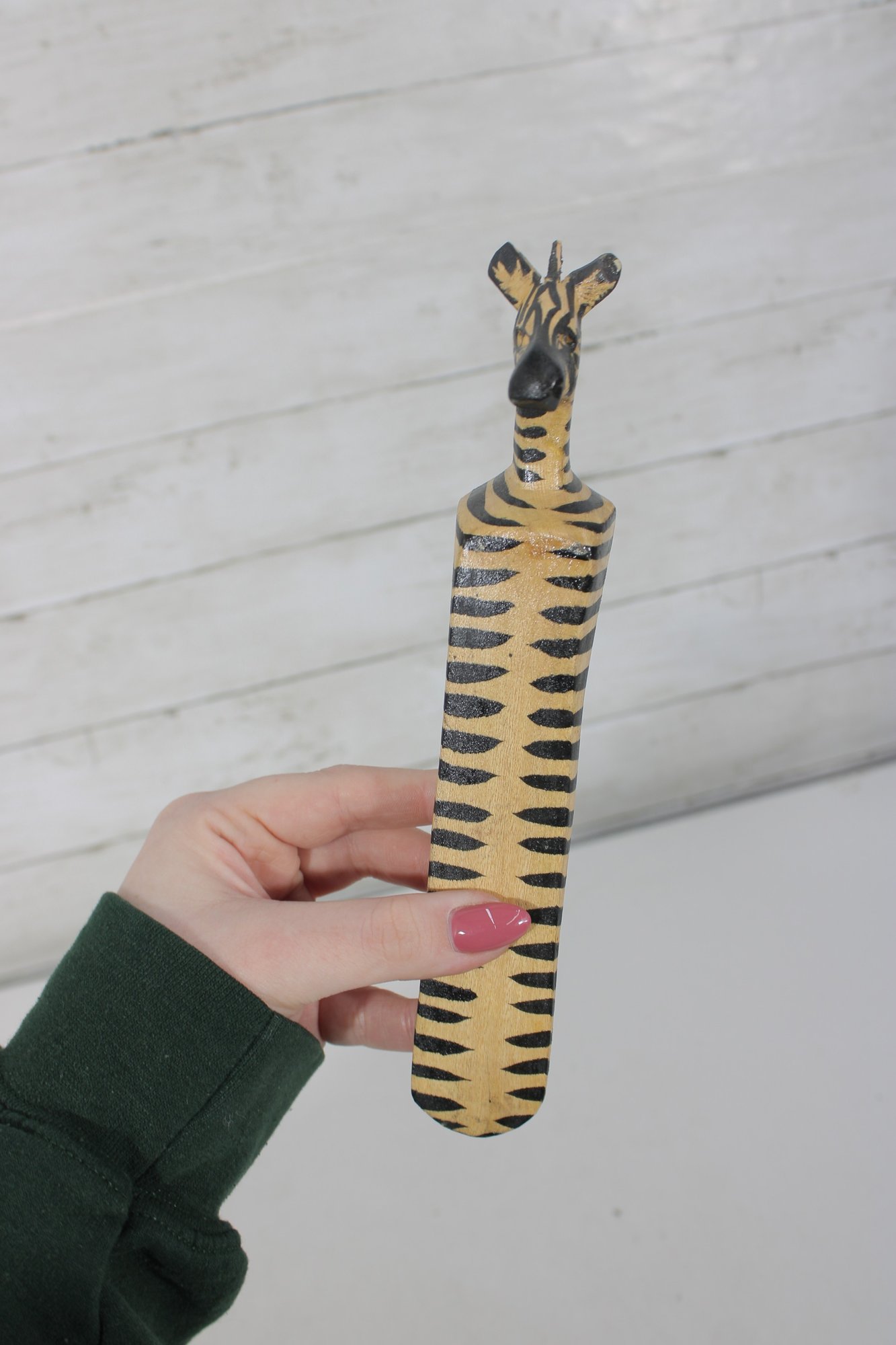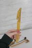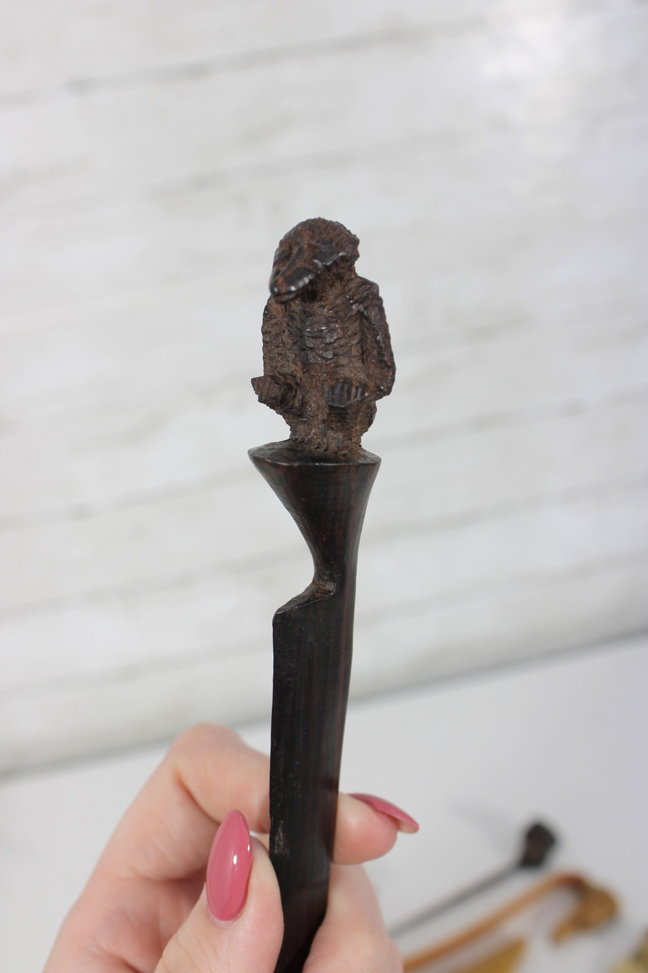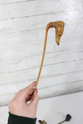 The lot includes 7 pieces total, each with a distinctive design such as carved animals, character heads, and decorative handles. Materials appear to include carved wood, bone or faux bone, metal, and celluloid or plastic, typical of mid-century novelty desk accessories.