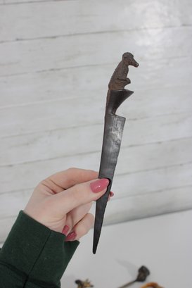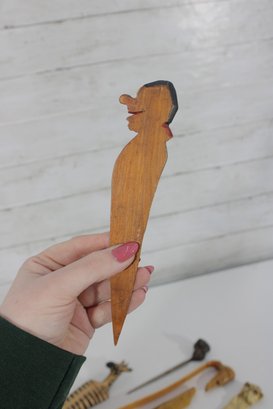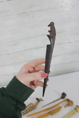 Unique vintage lot of figural letter openers and bookmarks, featuring a variety of decorative carved handles with animal and character motifs. These collectible desk accessories showcase interesting craftsmanship and a mix of materials, making them perfect for collectors or decorative desk displays.