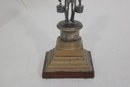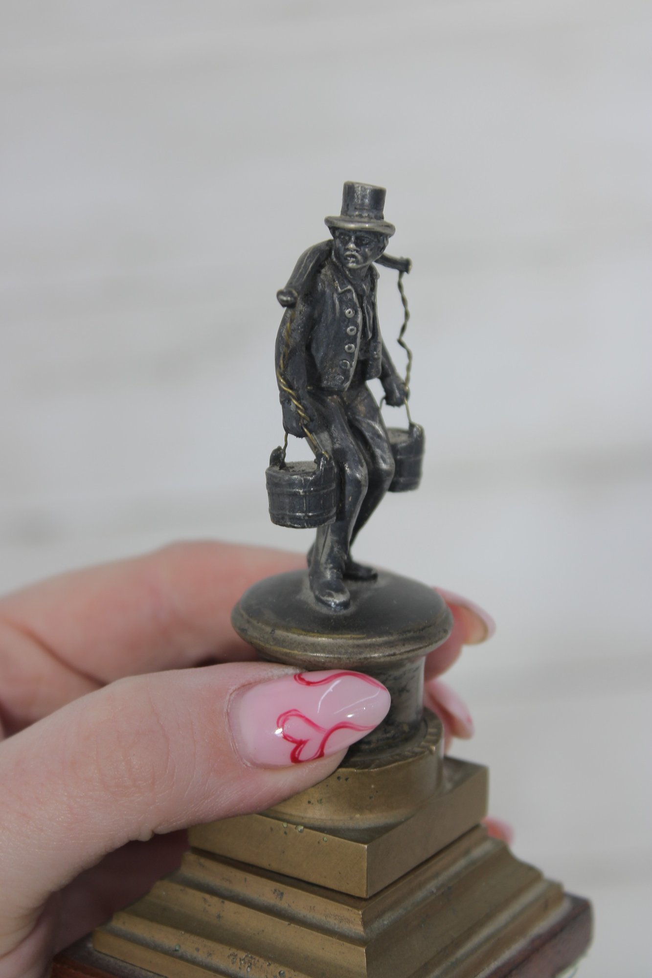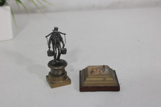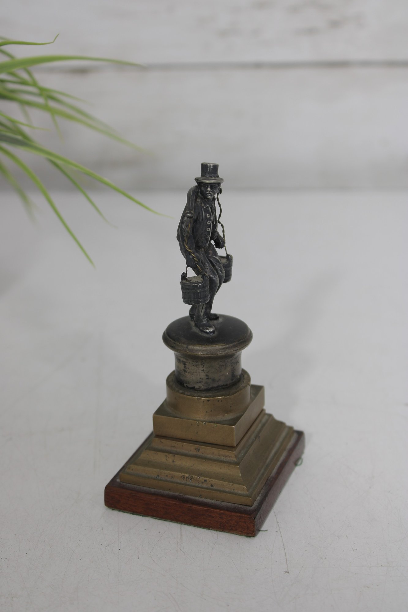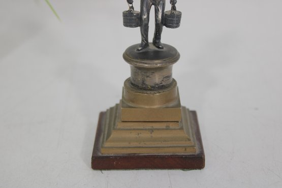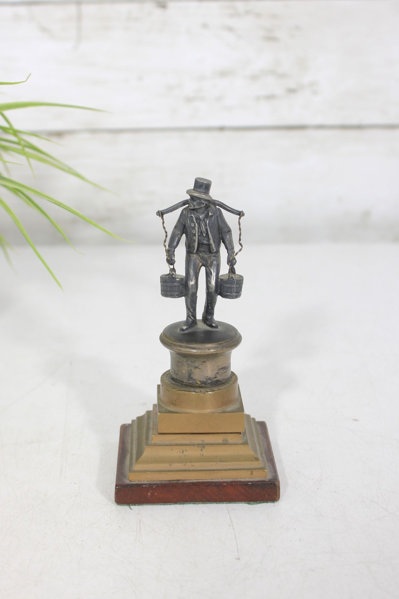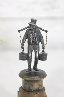 vintage figural metal sculpture depicting a porter or water carrier balancing buckets on a shoulder yoke. The figure is finely detailed, showing period clothing, hat, and expressive stance, and is mounted on a tiered metal and wood base that gives the piece strong architectural presence.