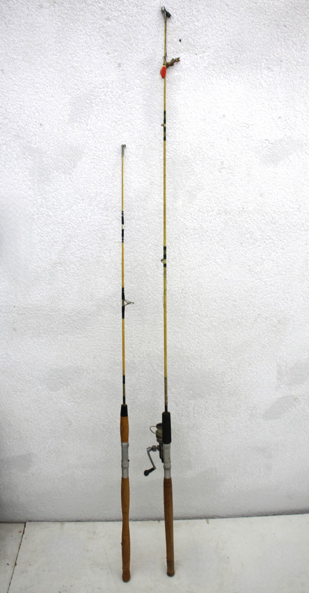 This lot includes two vintage fishing rods, measuring 57 inches and 71 inches in length. Both rods are equipped with reels, adding to their charm and utility. The rods have wooden handles and metal fittings, showing signs of age and use that add to their vintage appeal. Ideal for collectors or fishing enthusiasts looking to add classic rods to their collection.