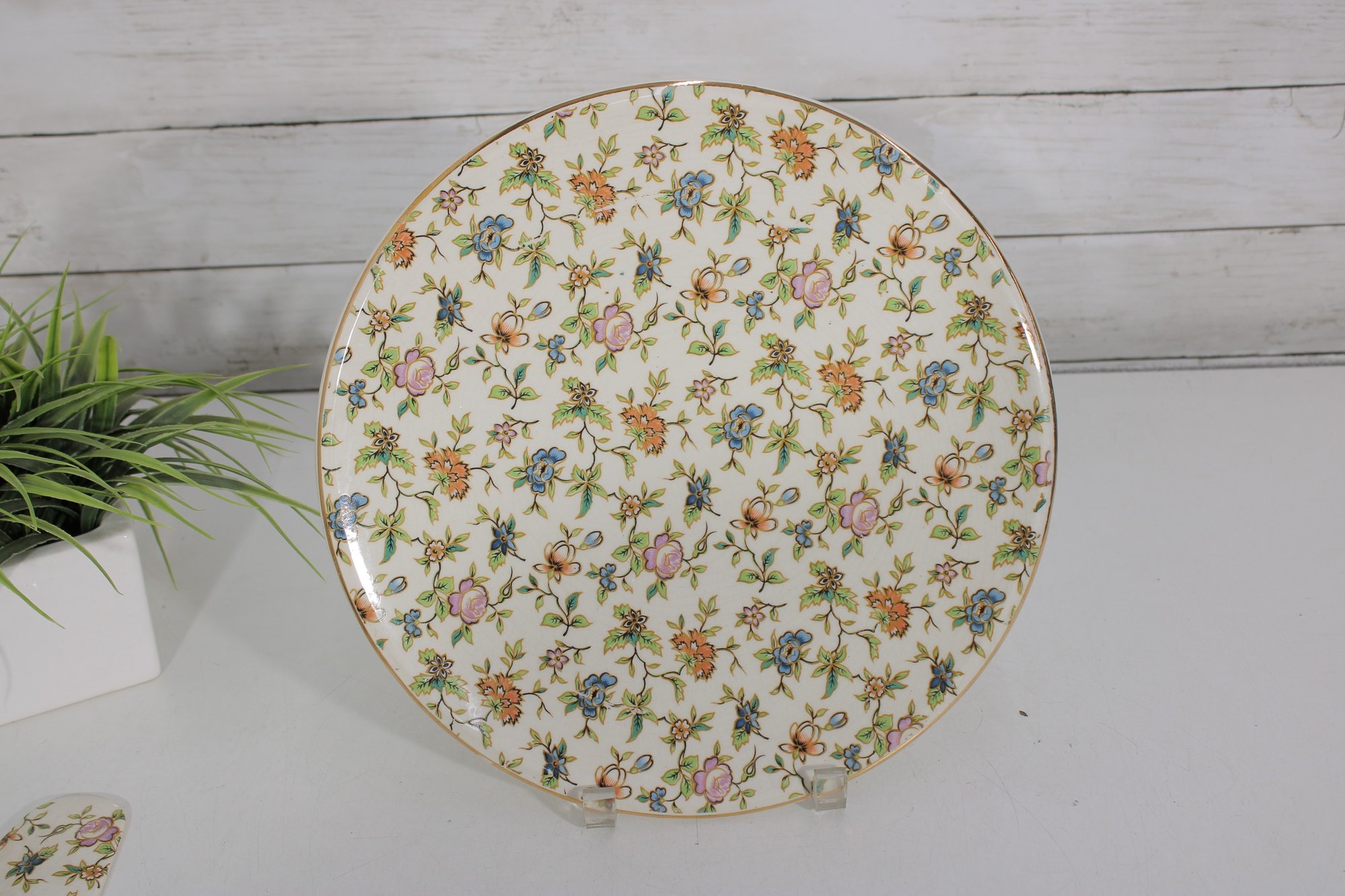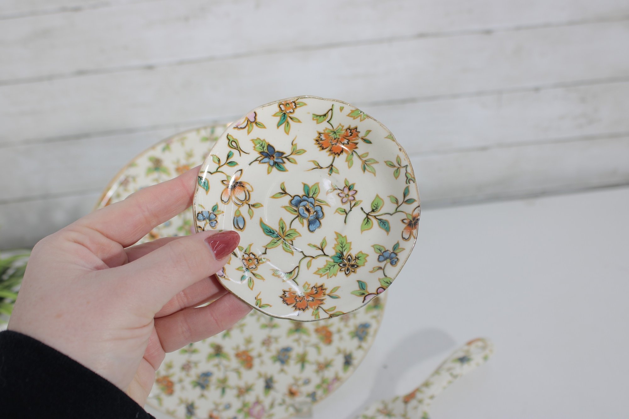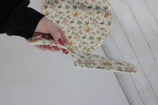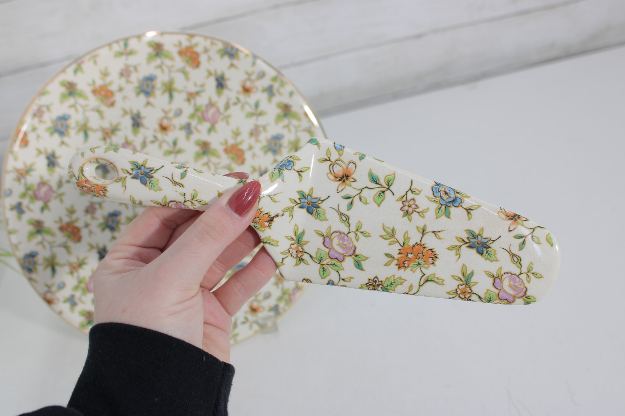 Each piece features a fine floral motif with detailed blossoms and greenery scattered across a cream background, finished with a subtle gold-tone rim. The server has a coordinating pattern on the handle and blade, making this a beautifully matched set โ perfect for entertaining or display.