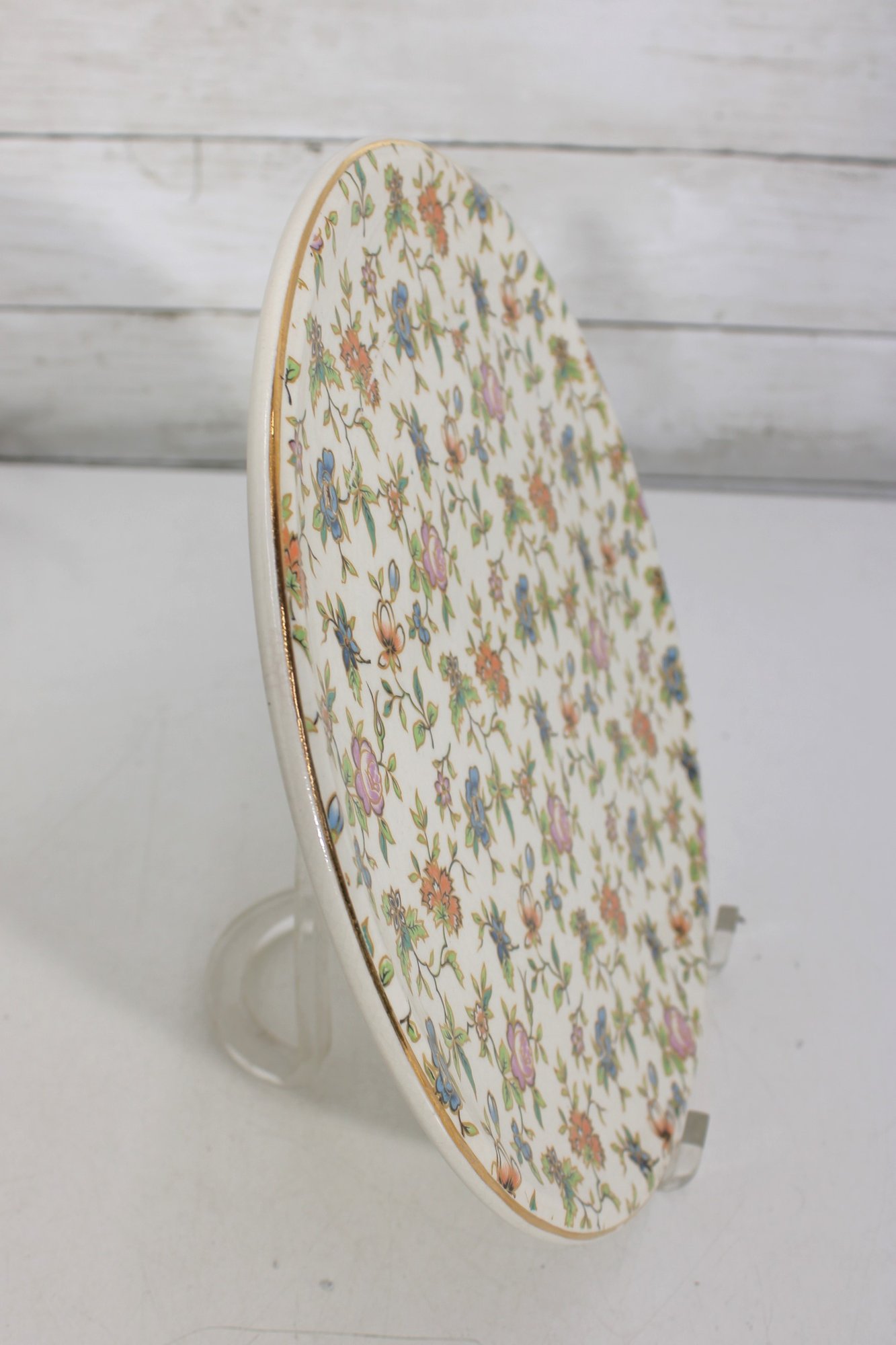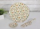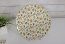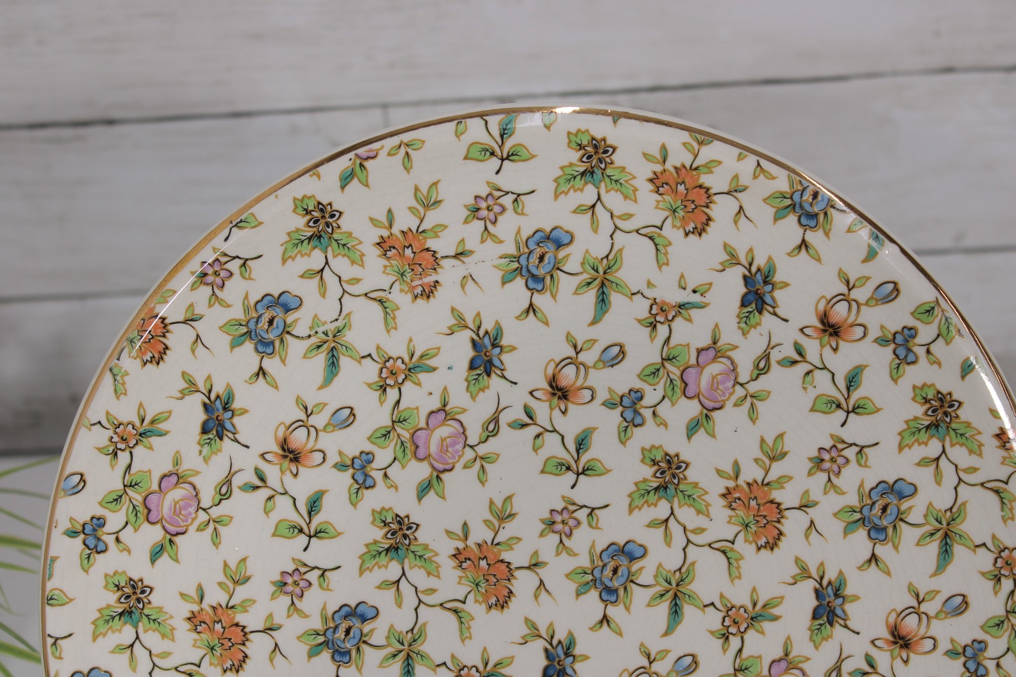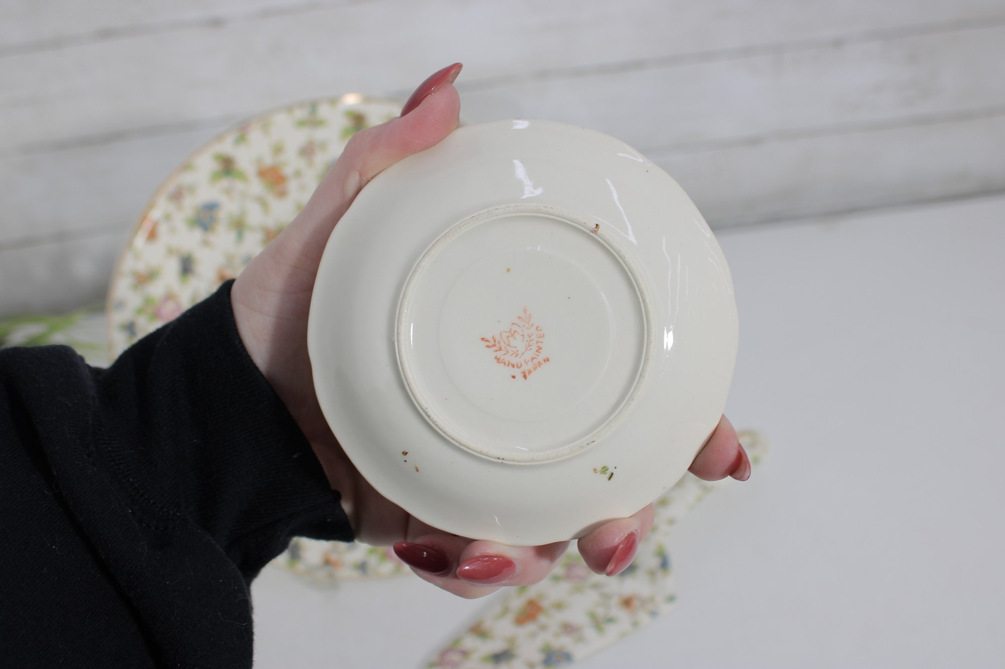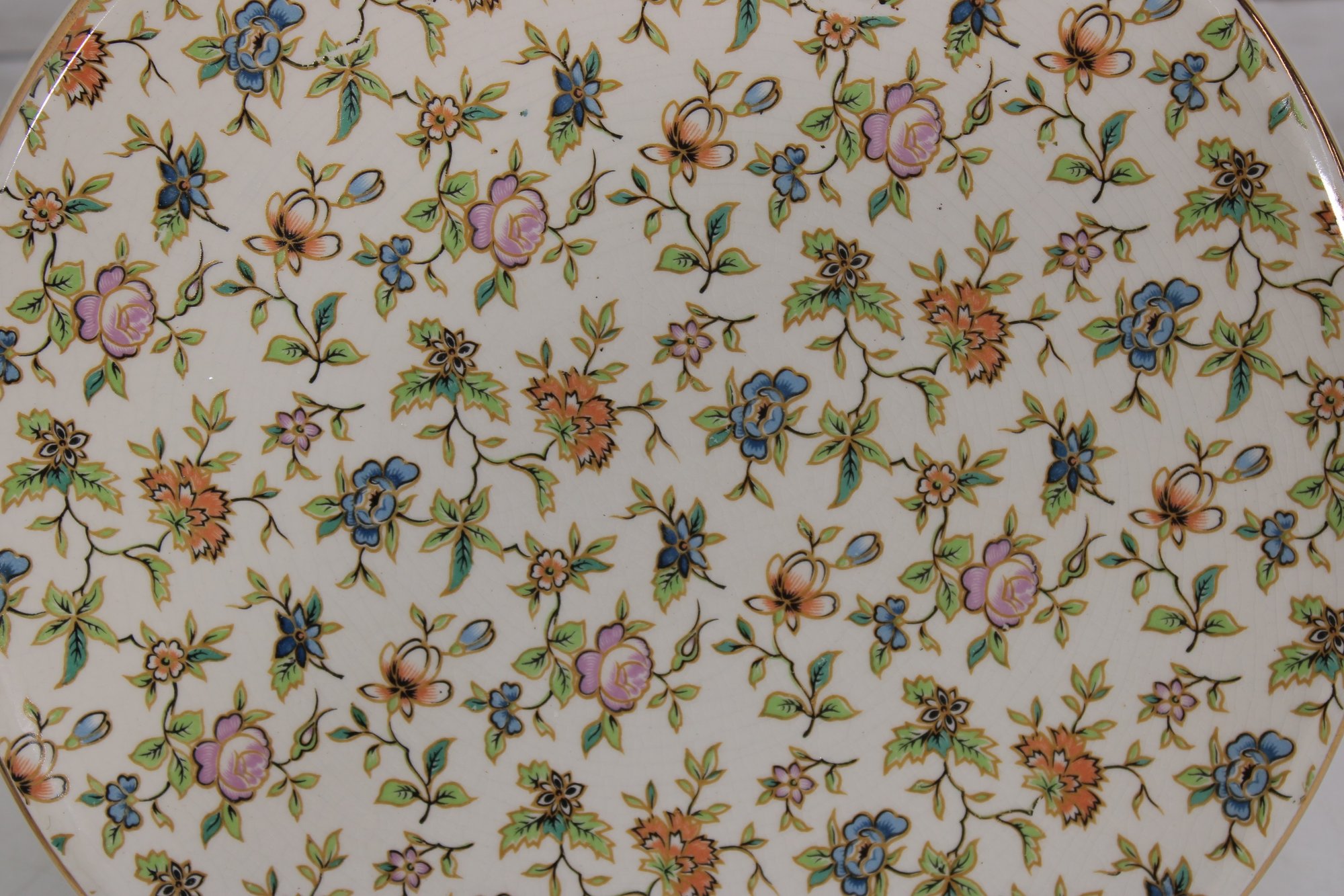 Each piece features a fine floral motif with detailed blossoms and greenery scattered across a cream background, finished with a subtle gold-tone rim. The server has a coordinating pattern on the handle and blade, making this a beautifully matched set โ perfect for entertaining or display.