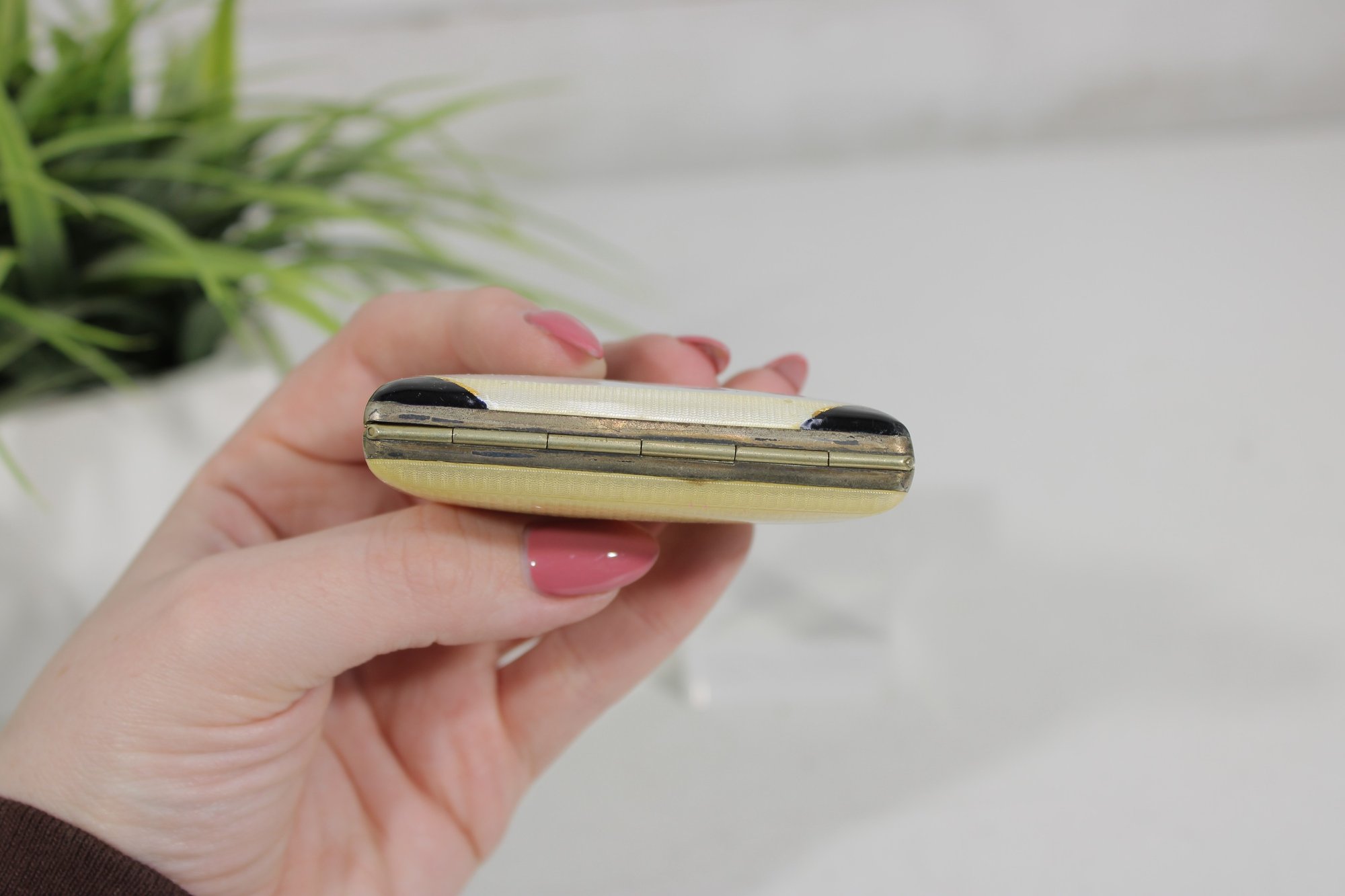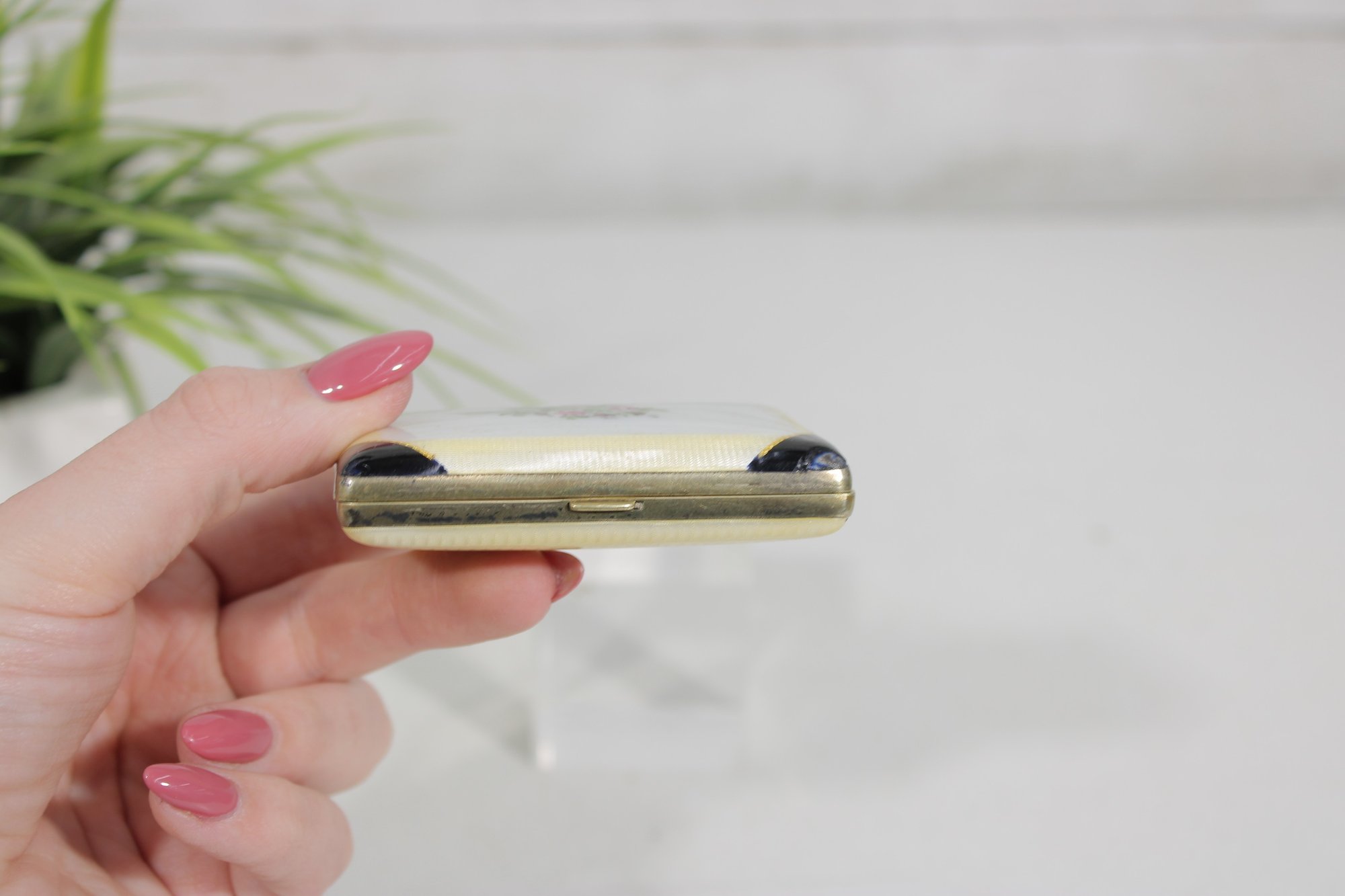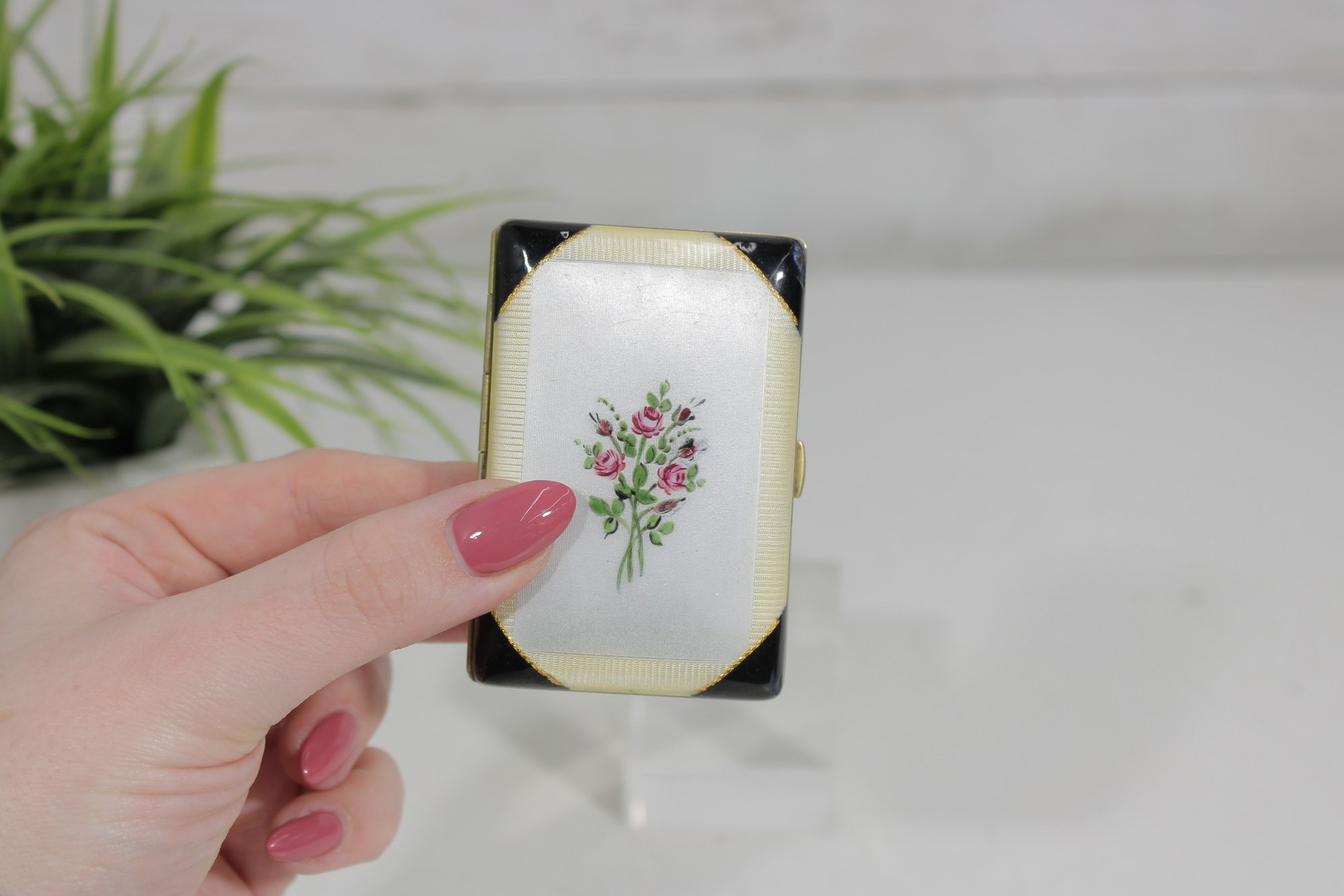 a beautiful vintage cigarette case holder featuring an elegant floral porcelain-style panel on the front accented by black corner details. The delicate bouquet design gives this compact case a charming vintage look.