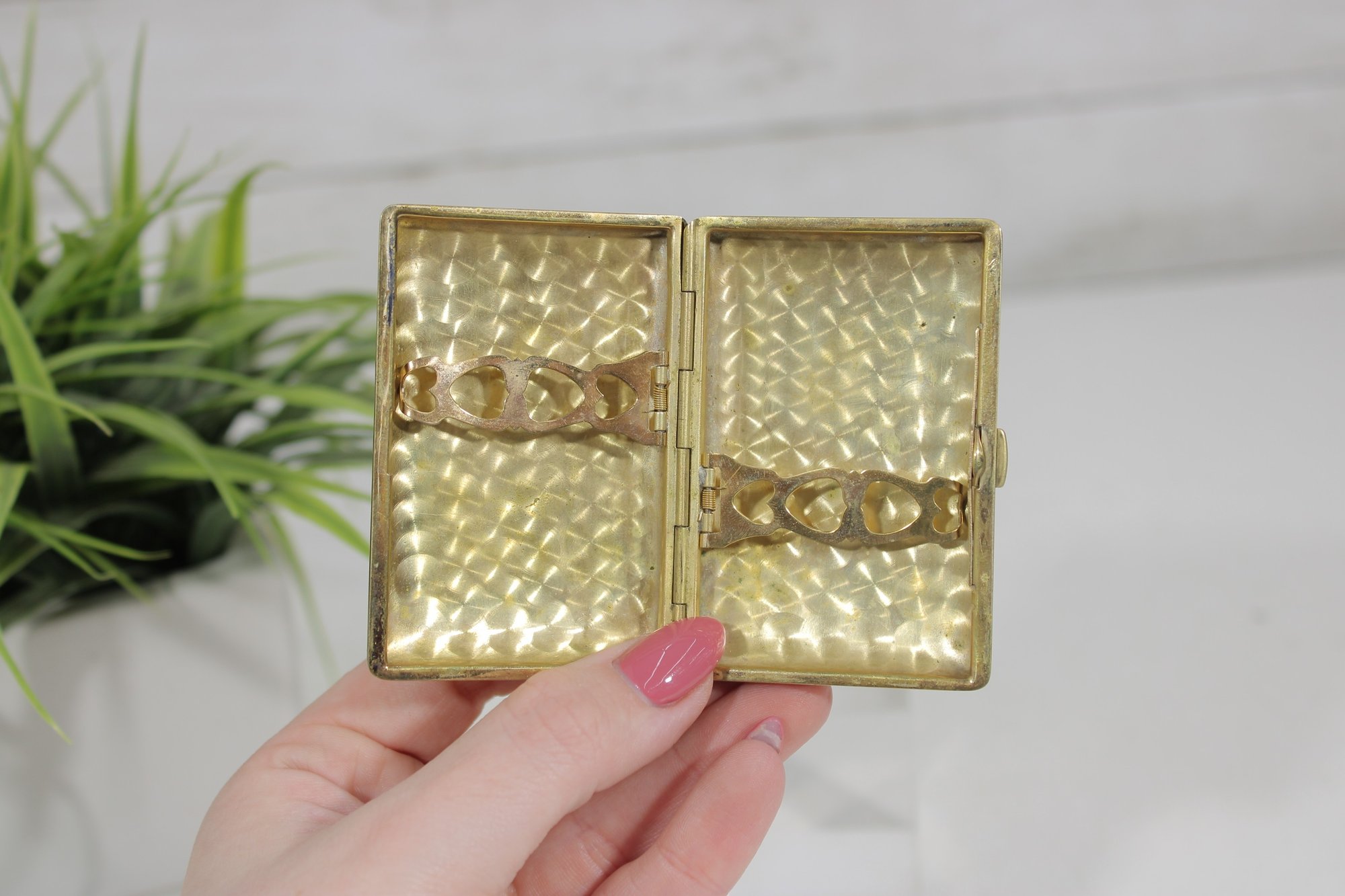 The case opens to reveal a gold-tone interior with elastic retaining bands designed to hold cigarettes securely in place. The exterior back features a textured gold-tone finish, adding to its classic mid-century style.📌Please be sure to review all photos carefully before bidding, as they are part of the description.
