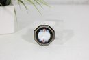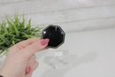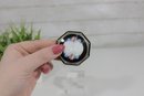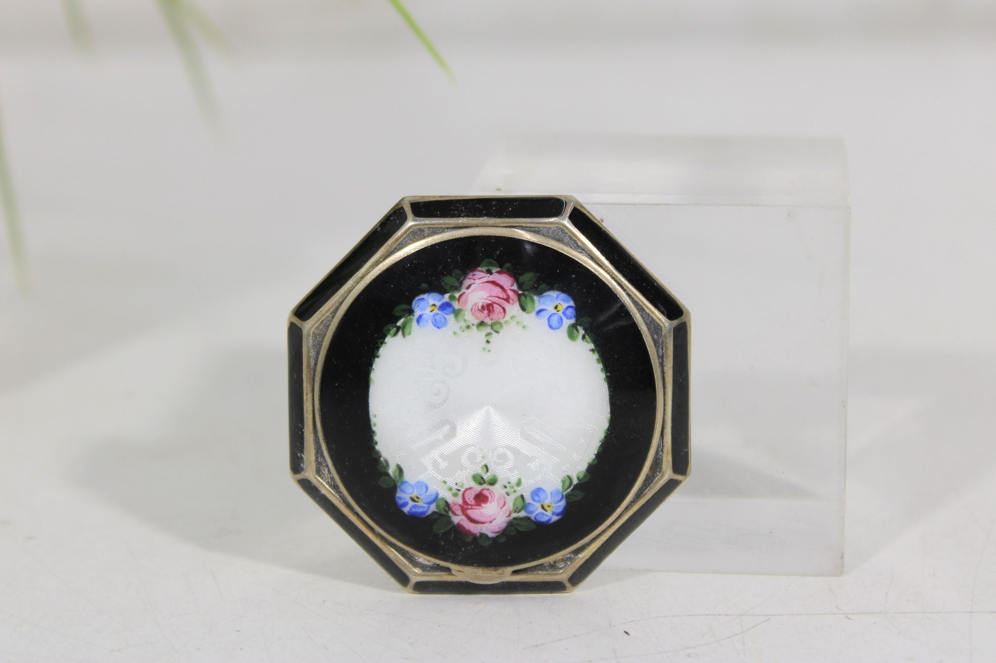 beautiful vintage octagonal powder compact featuring a black enamel lid with a delicate floral guilloché-style center panel. The design includes soft pink roses and small blue flowers surrounding an elegant white center, giving the compact a charming and classic vintage look.