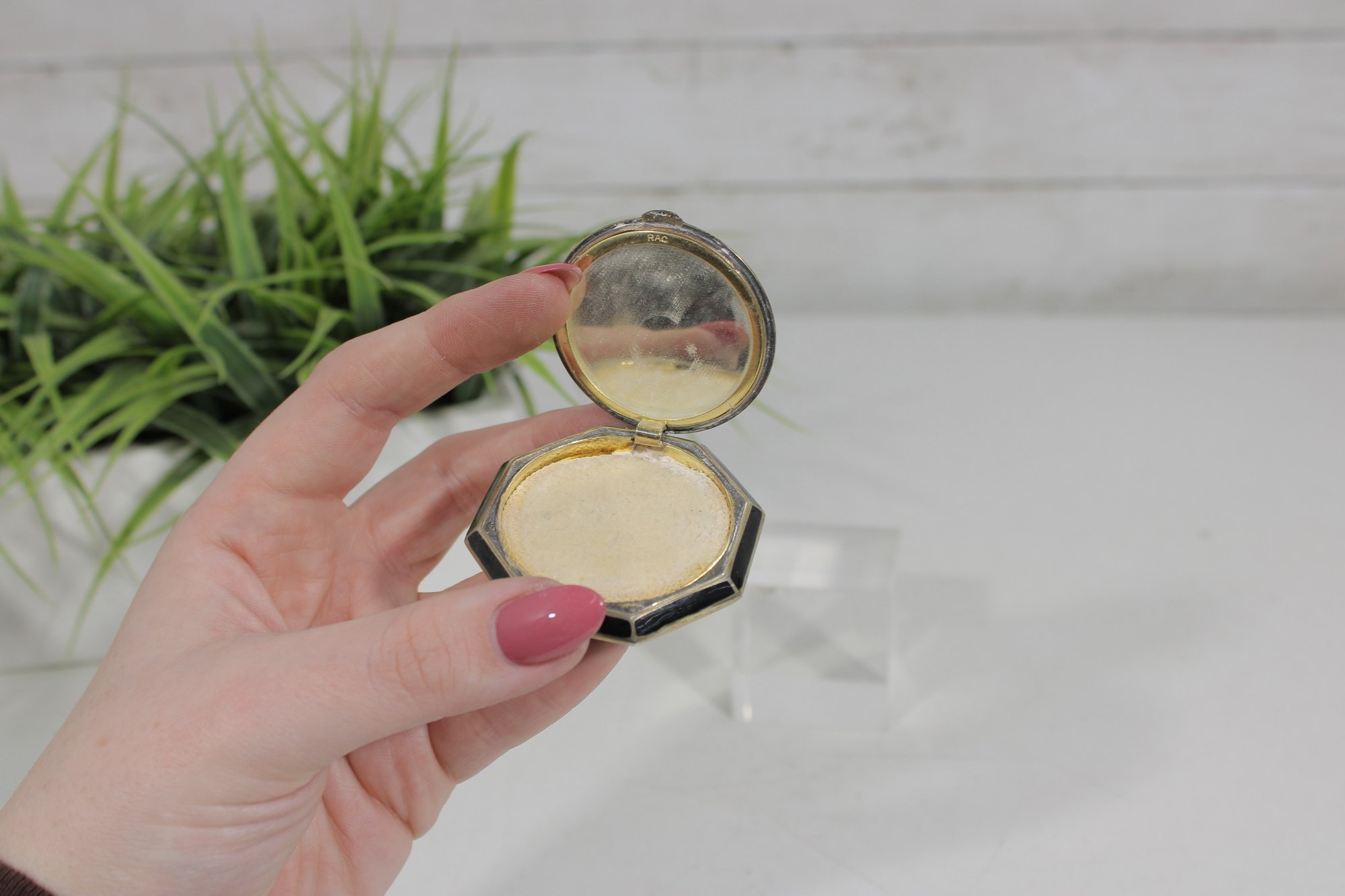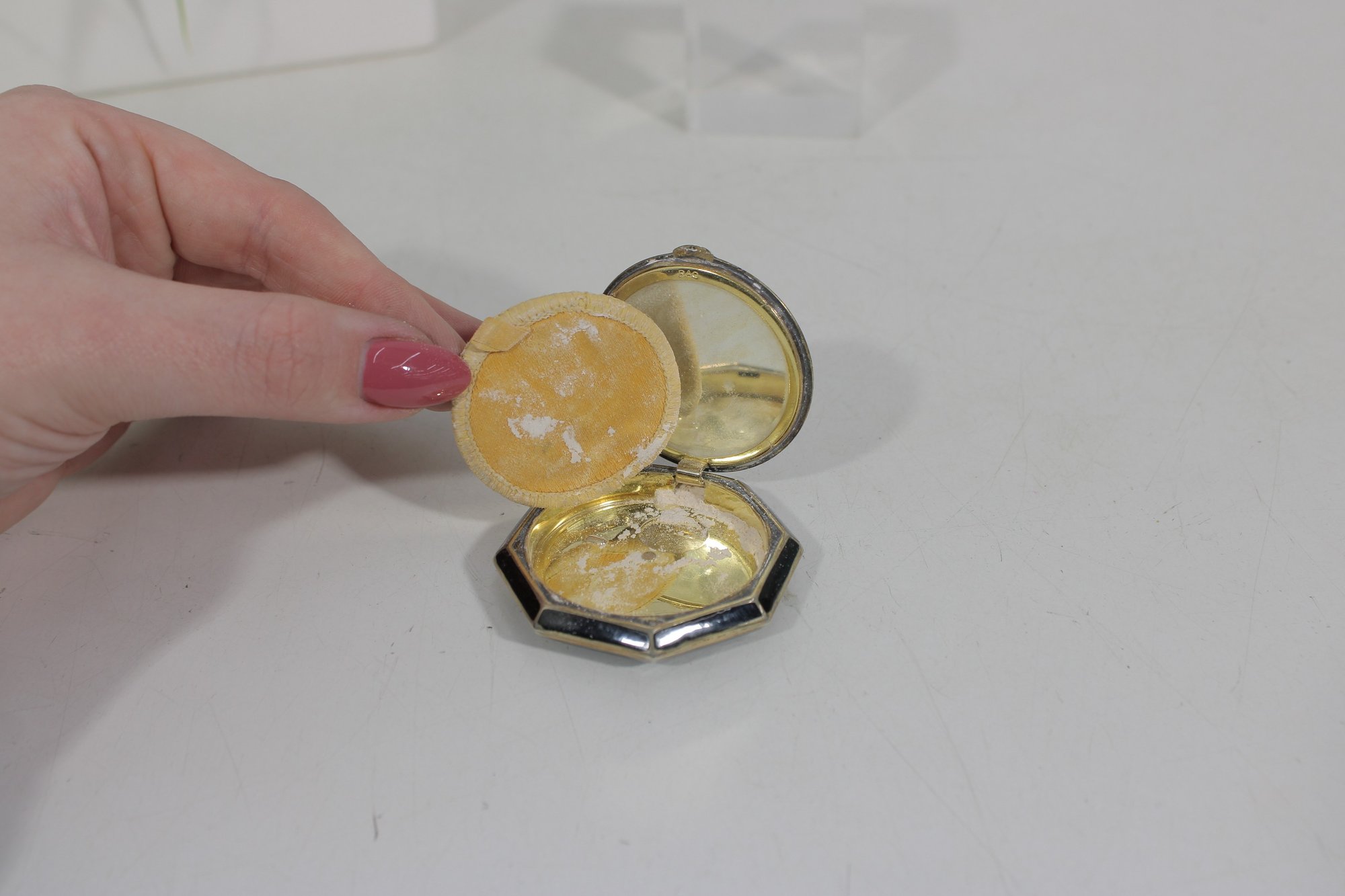 The compact opens to reveal a mirror and powder compartment with screen insert, still retaining traces of vintage powder. The gold-tone interior and geometric octagonal shape add to its attractive mid-century vanity style.