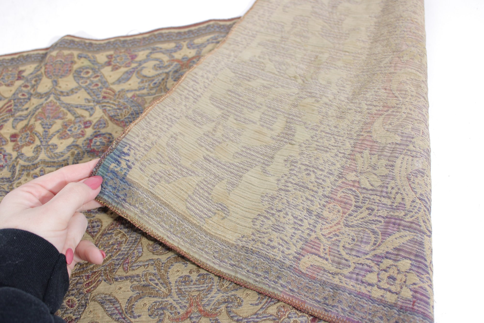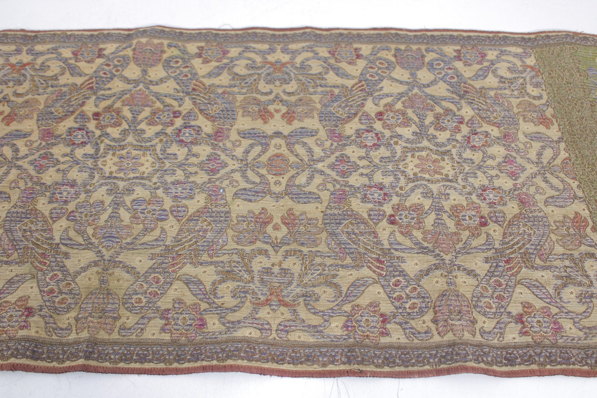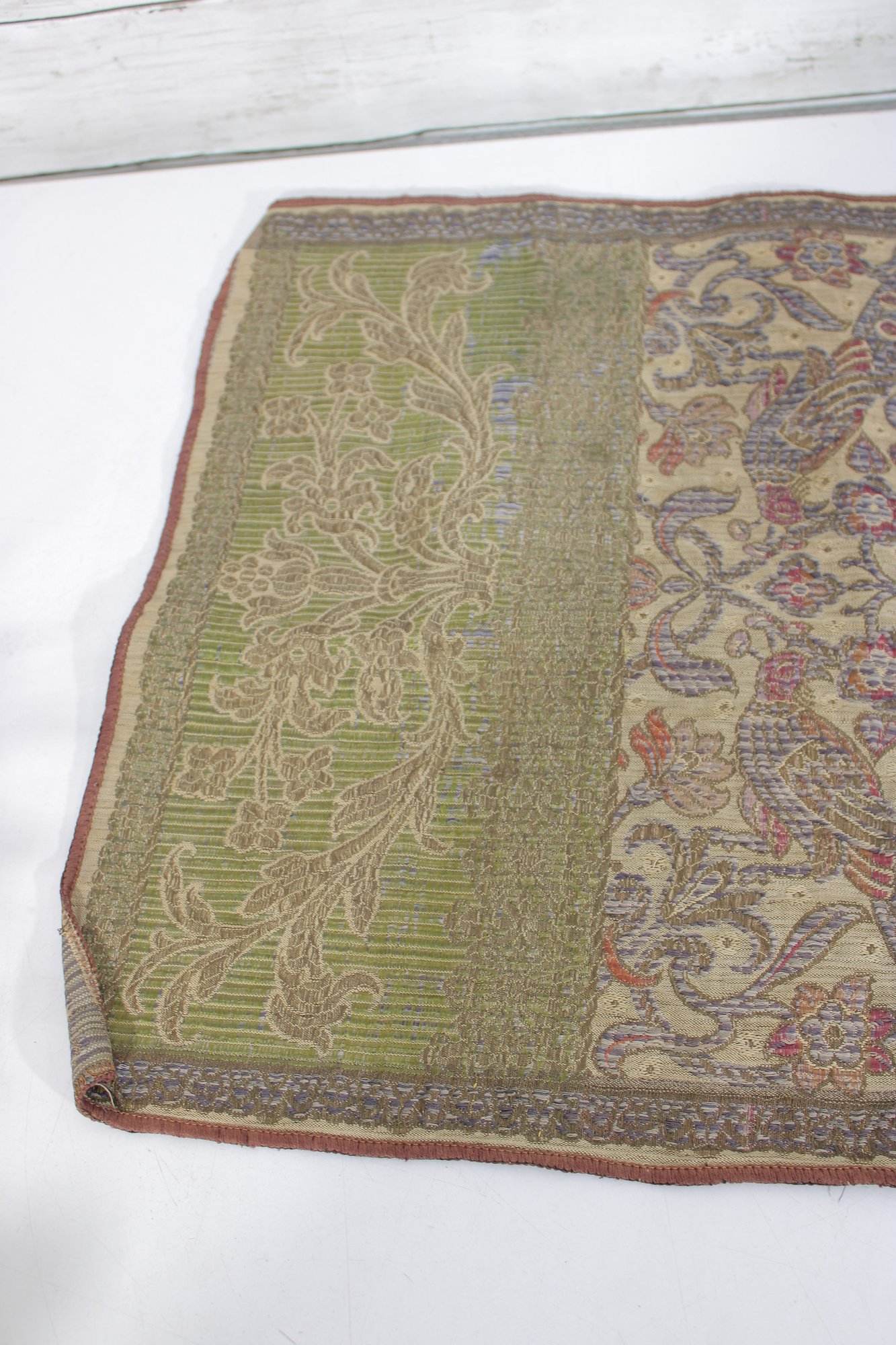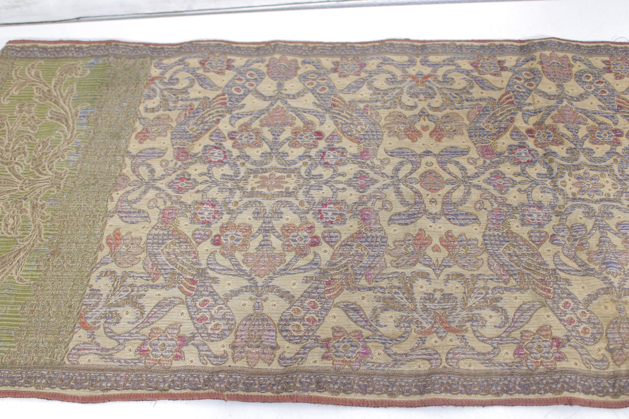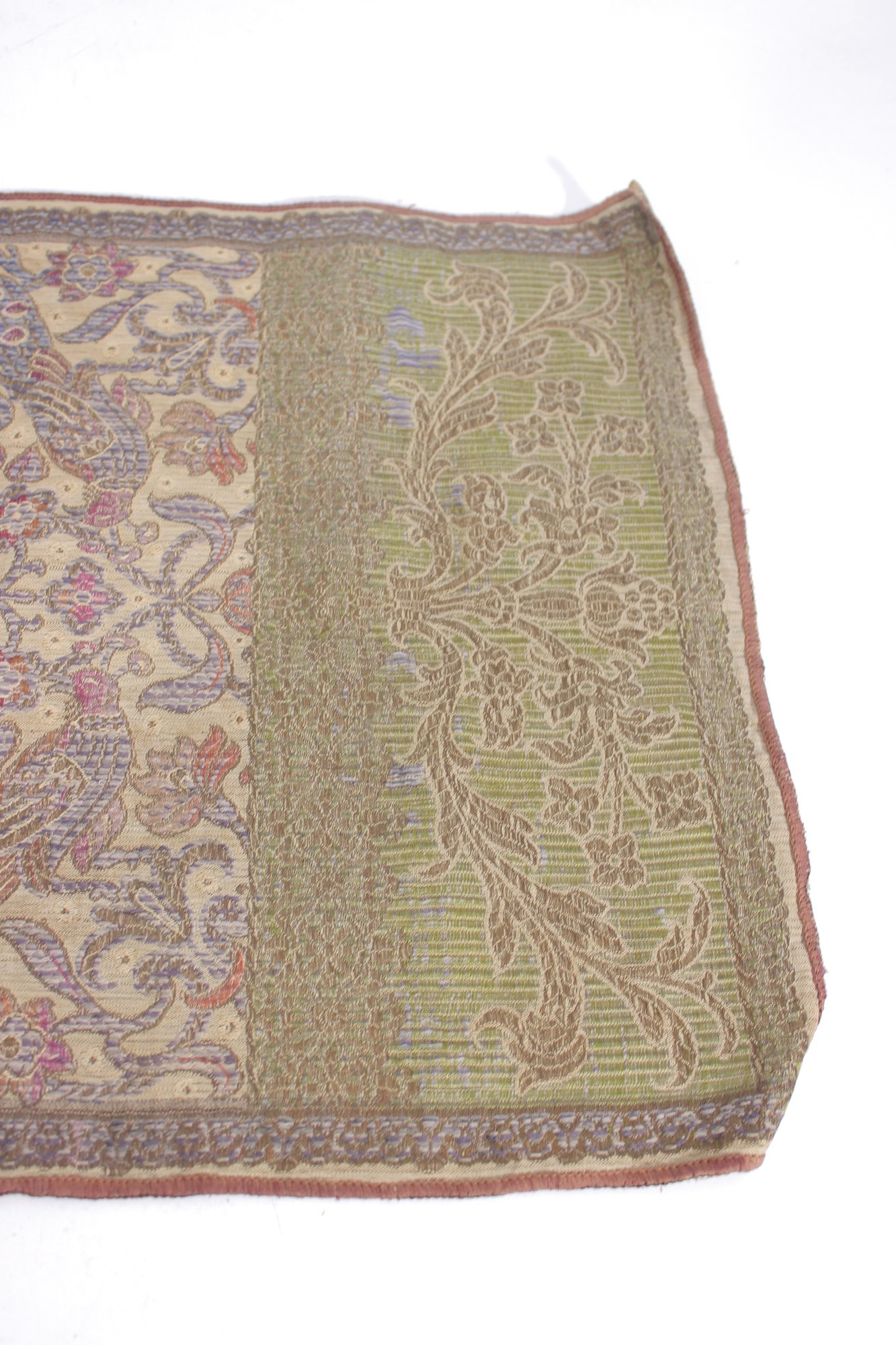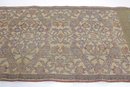 Beautiful vintage decorative textile table runner featuring an intricate floral and scrolling pattern in muted tones of gold, green, lavender, and tan. The detailed woven design and border panels give the piece a classic traditional tapestry-style appearance.