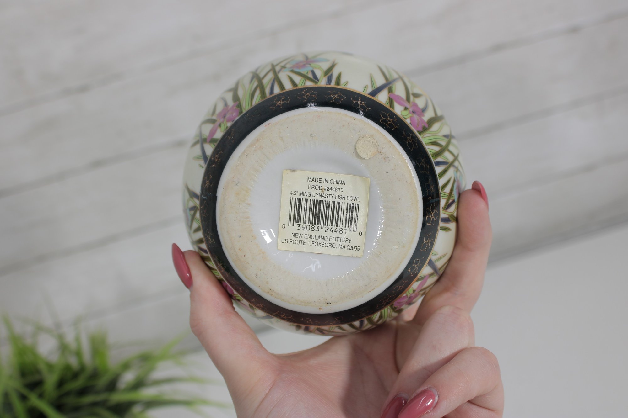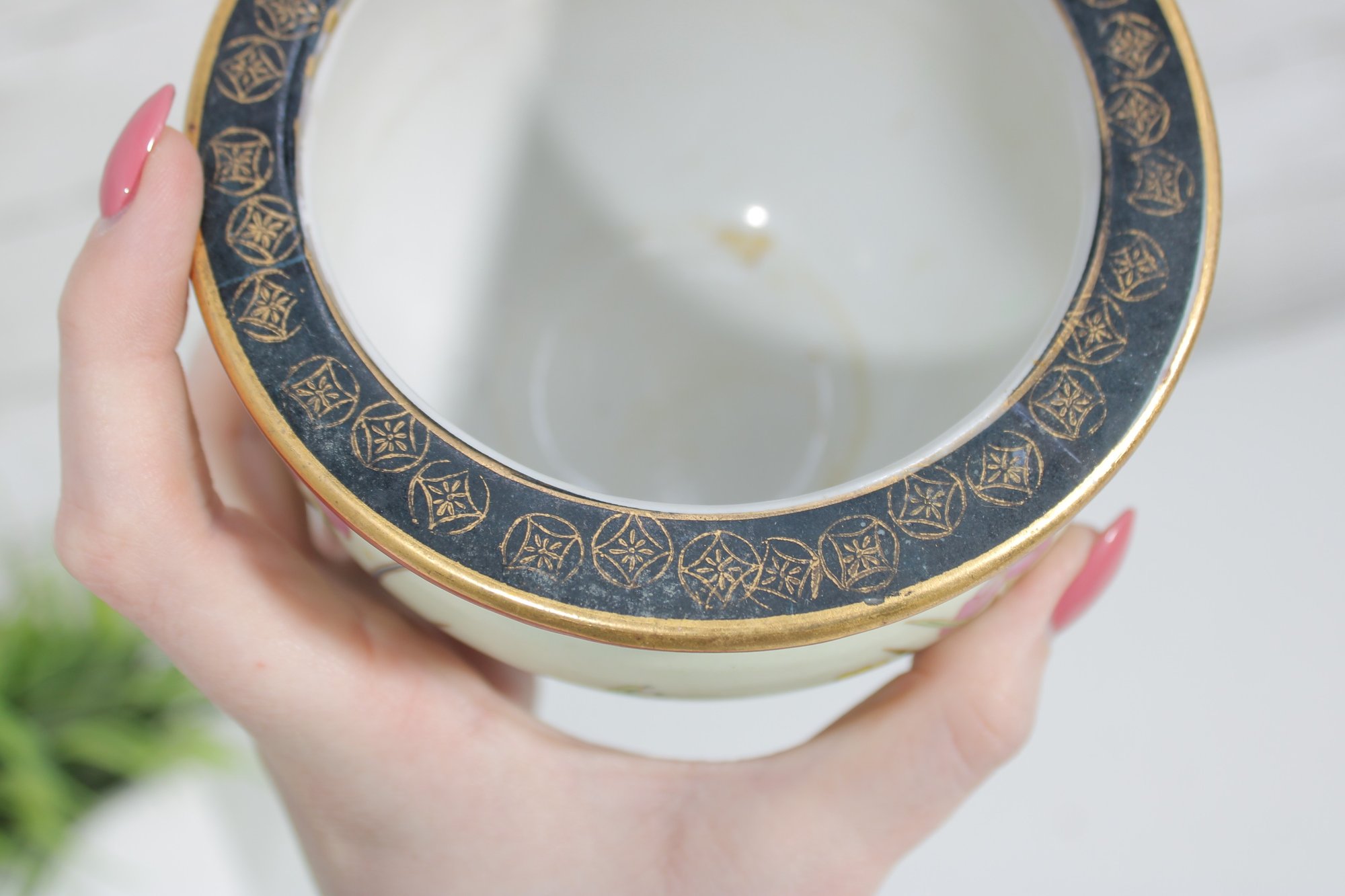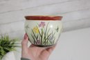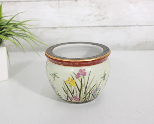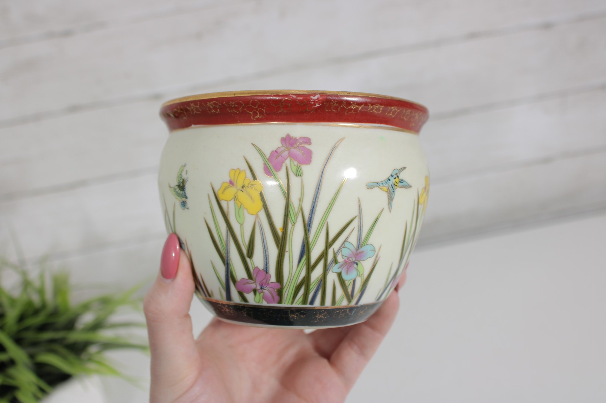 Charming vintage porcelain cachepot/planter featuring a delicate hand-painted floral motif. The exterior showcases colorful flowers with green stems set against a soft cream background, while the rim is accented with a rich burgundy band and gold detailing for an elegant finish.