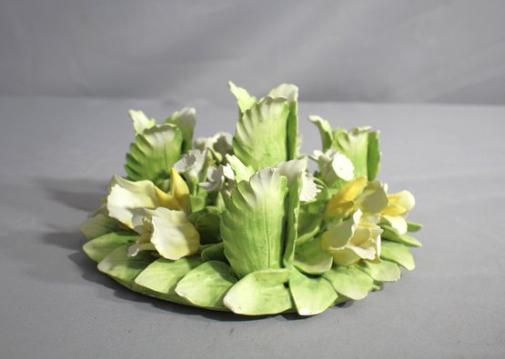 Presenting a beautifully sculpted vintage porcelain candle holder that exudes charm and character. Adorned with a ring of delicately rendered flowers and leaves, this piece brings a touch of spring to any room