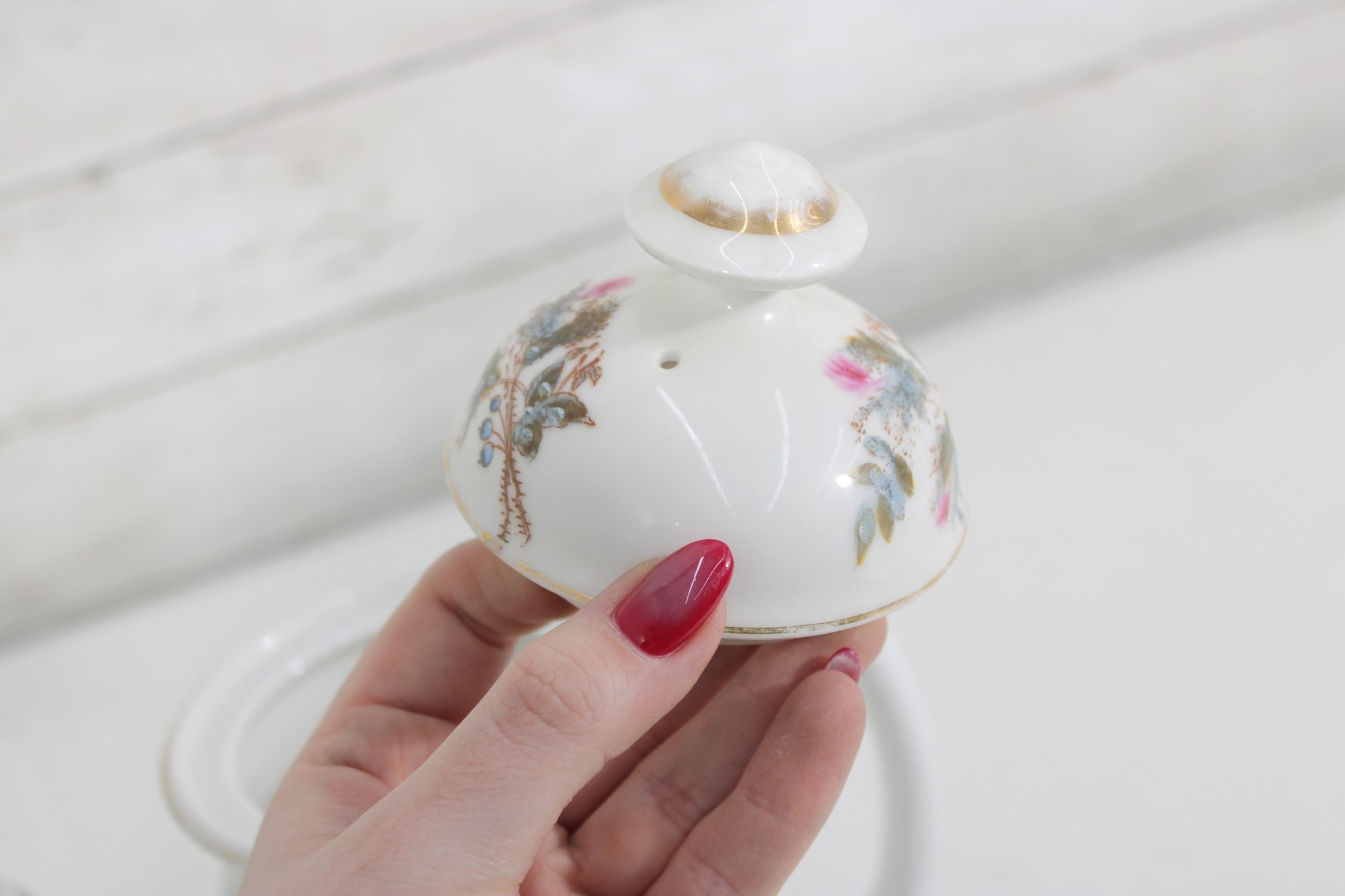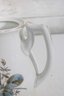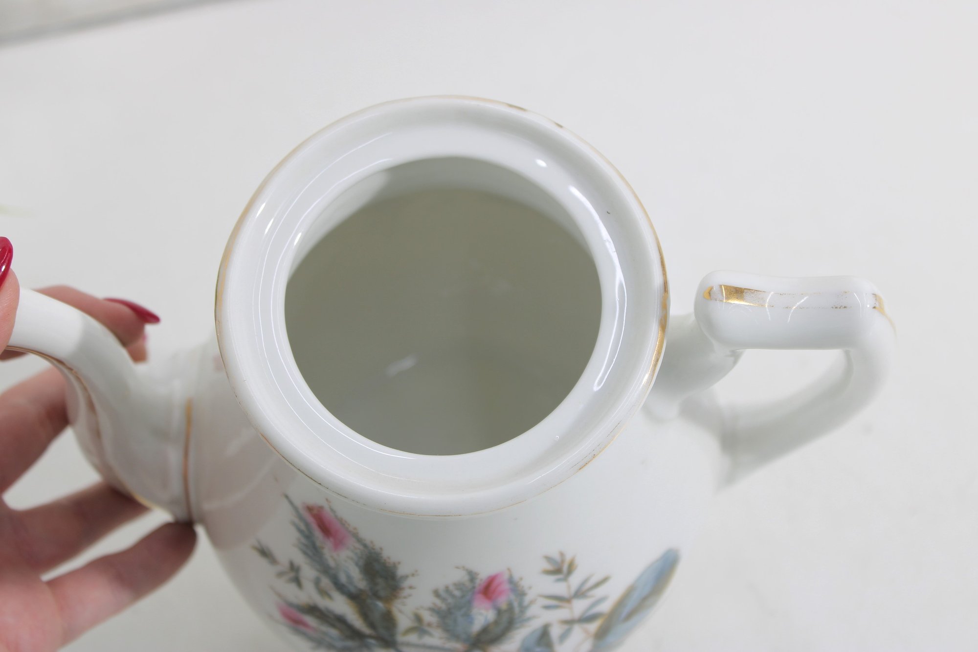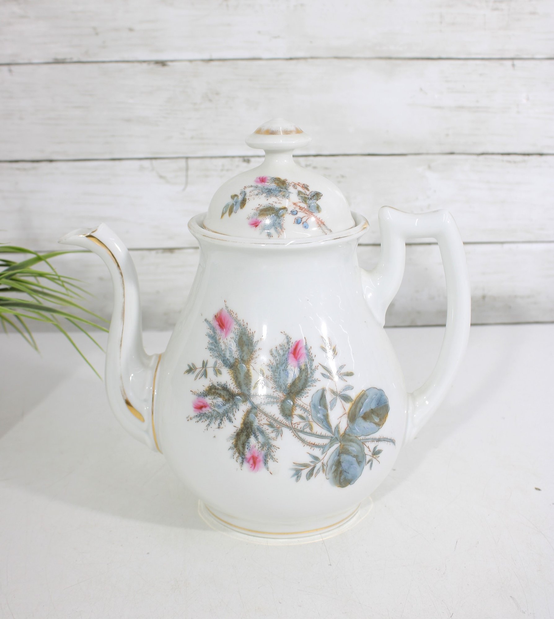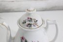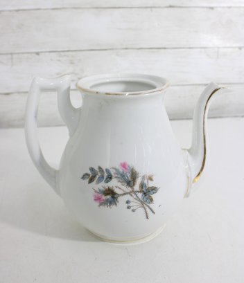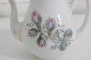 vintage porcelain teapot features a beautifully detailed botanical design, showcasing delicate thistle flowers accented with soft pink blooms and a graceful butterfly in flight. The artwork is finely rendered, giving the piece a refined and timeless appeal.