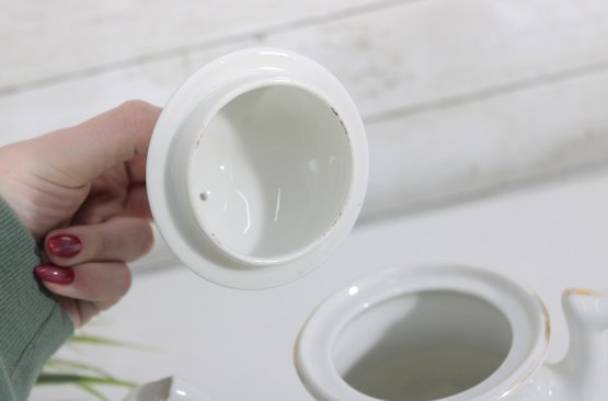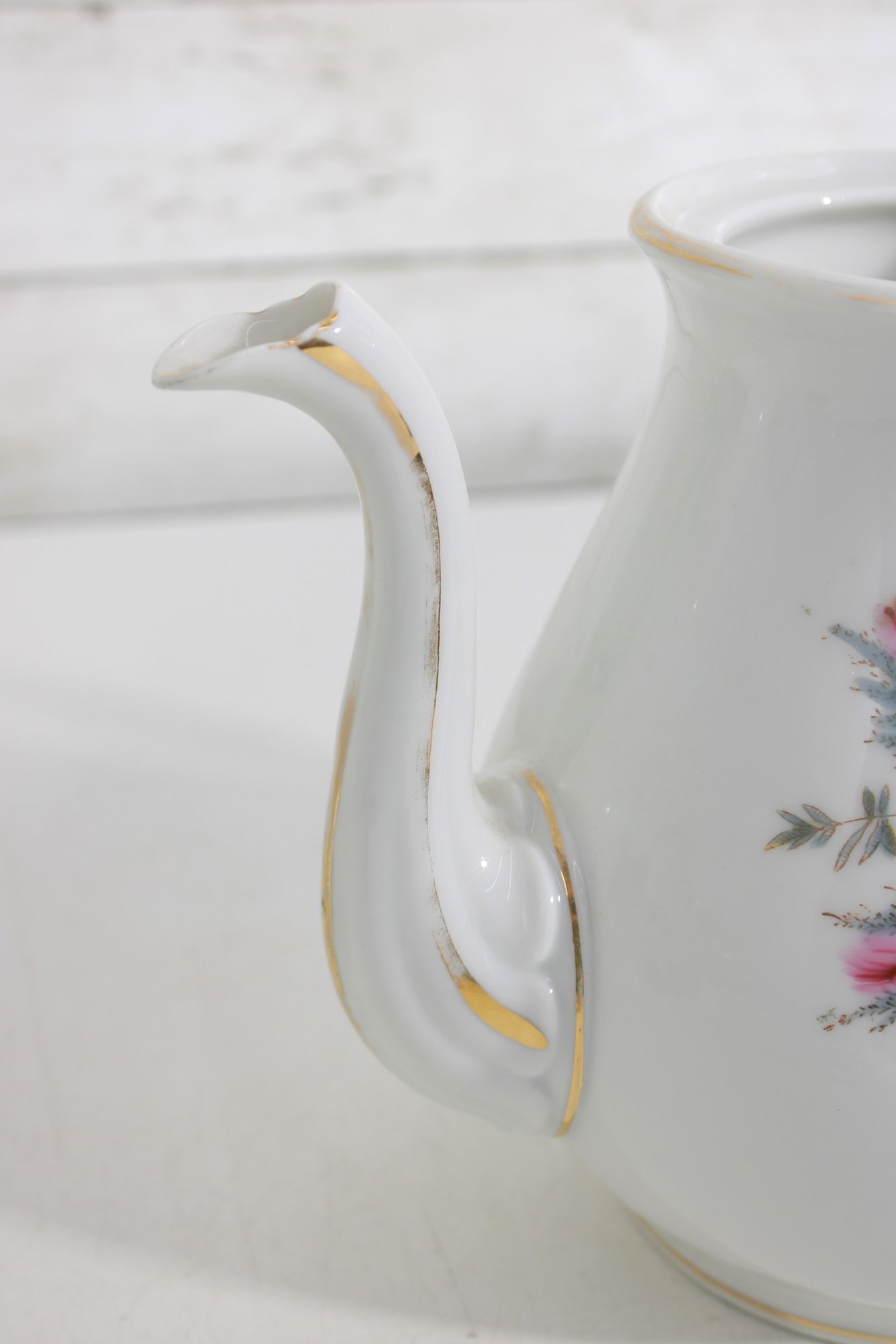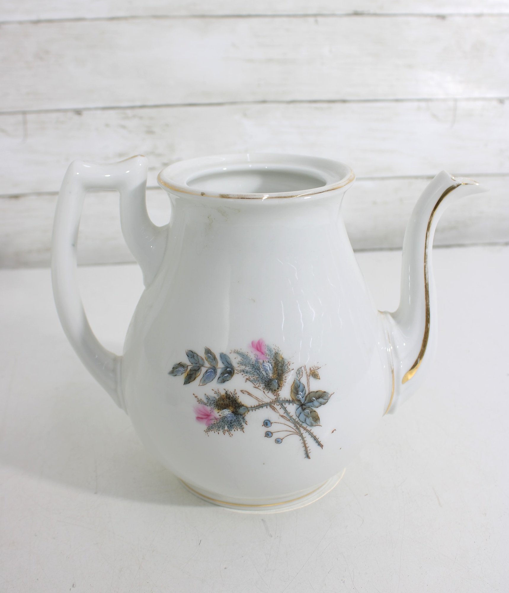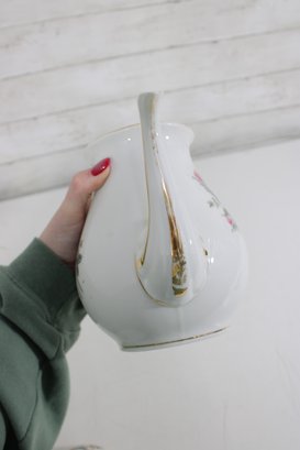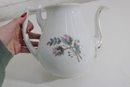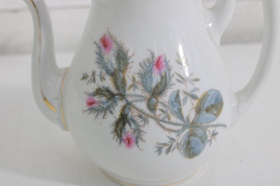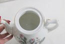 Standing approximately 9.5 inches tall, the teapot has a classic silhouette with a gently curved handle and elongated spout, both accented with subtle gold trim. The matching lid continues the floral motif, adding to its cohesive and decorative charm.