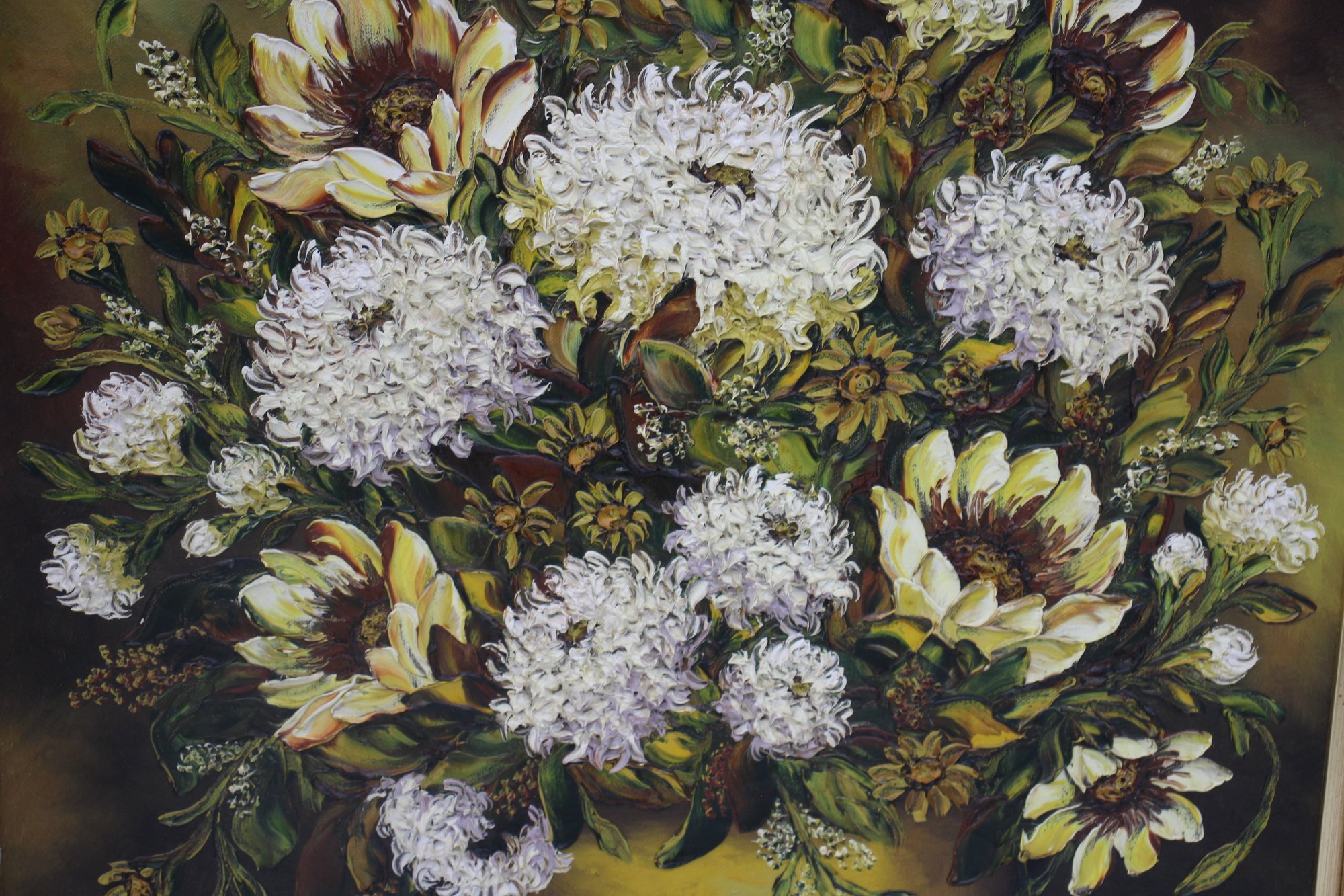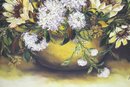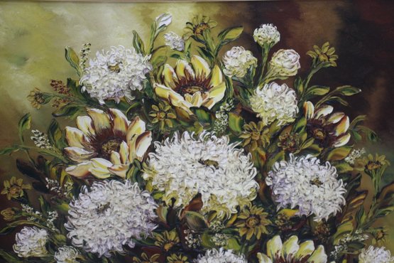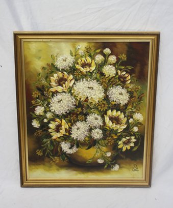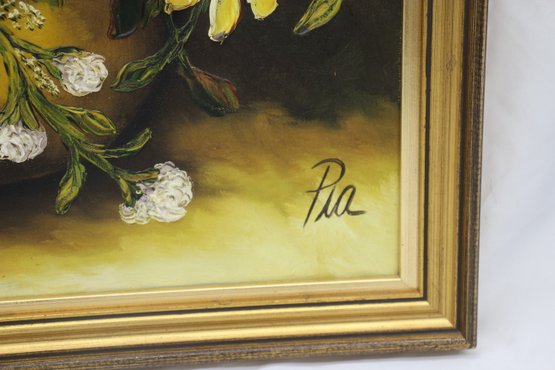 vintage floral still life painting, signed by the artist "Pia," beautifully captures a lush bouquet of white and yellow flowers in a golden-hued vase. The rich color palette of warm yellows, deep greens, and soft whites creates an inviting and timeless aesthetic.