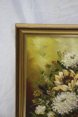 Measuring 27 inches in height and 23 inches in width, this painting is elegantly framed in a classic gold-tone frame that enhances its vintage charm. The artist’s detailed brushwork and textured petals bring the flowers to life, making this piece an elegant addition to any traditional, vintage, or shabby-chic decor.