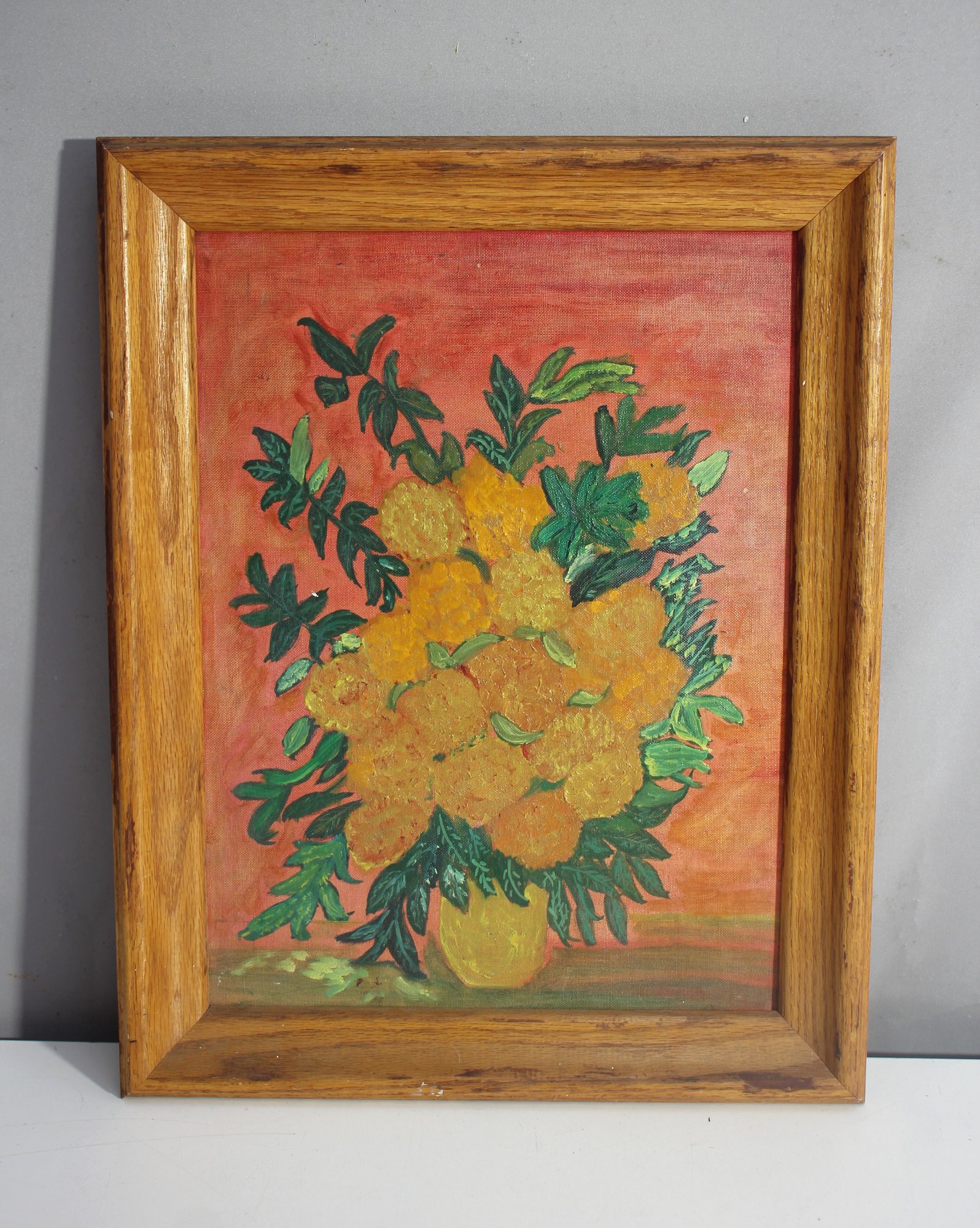 This vibrant floral still life painting on board showcases a stunning bouquet of golden-yellow flowers set against a rich, warm-toned background. Measuring 19 inches in height by 15 inches in width, this artwork exudes a charming, expressive quality with bold brushstrokes and textured details.
