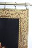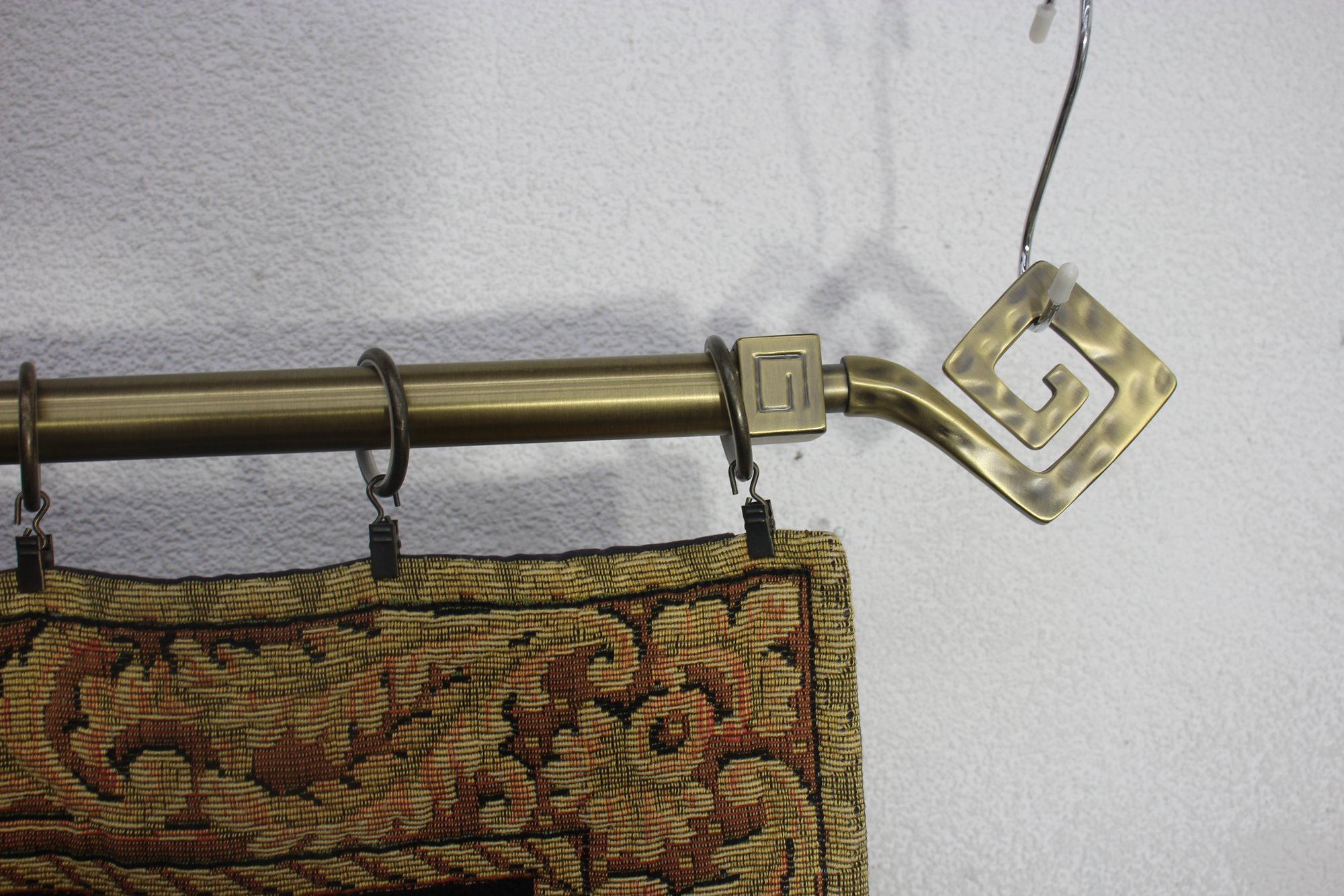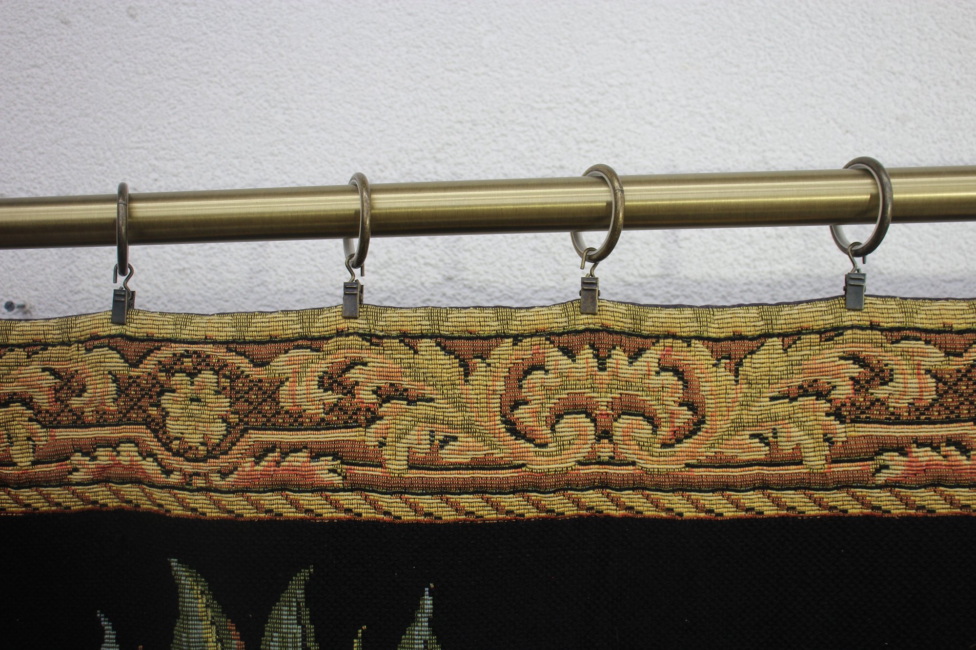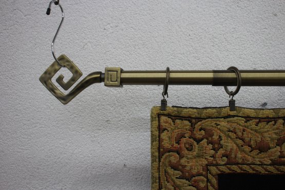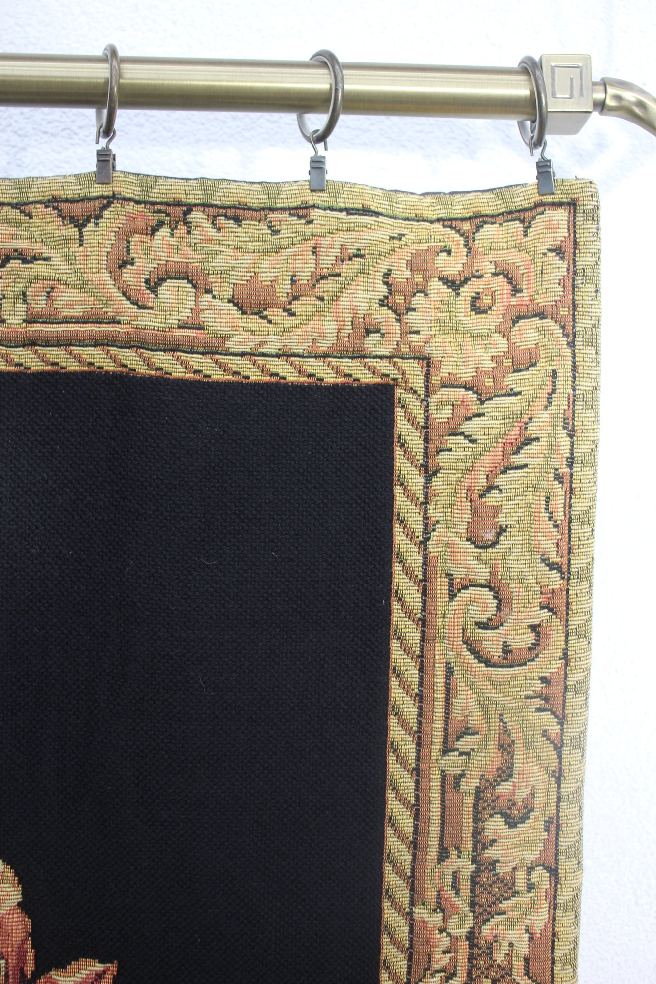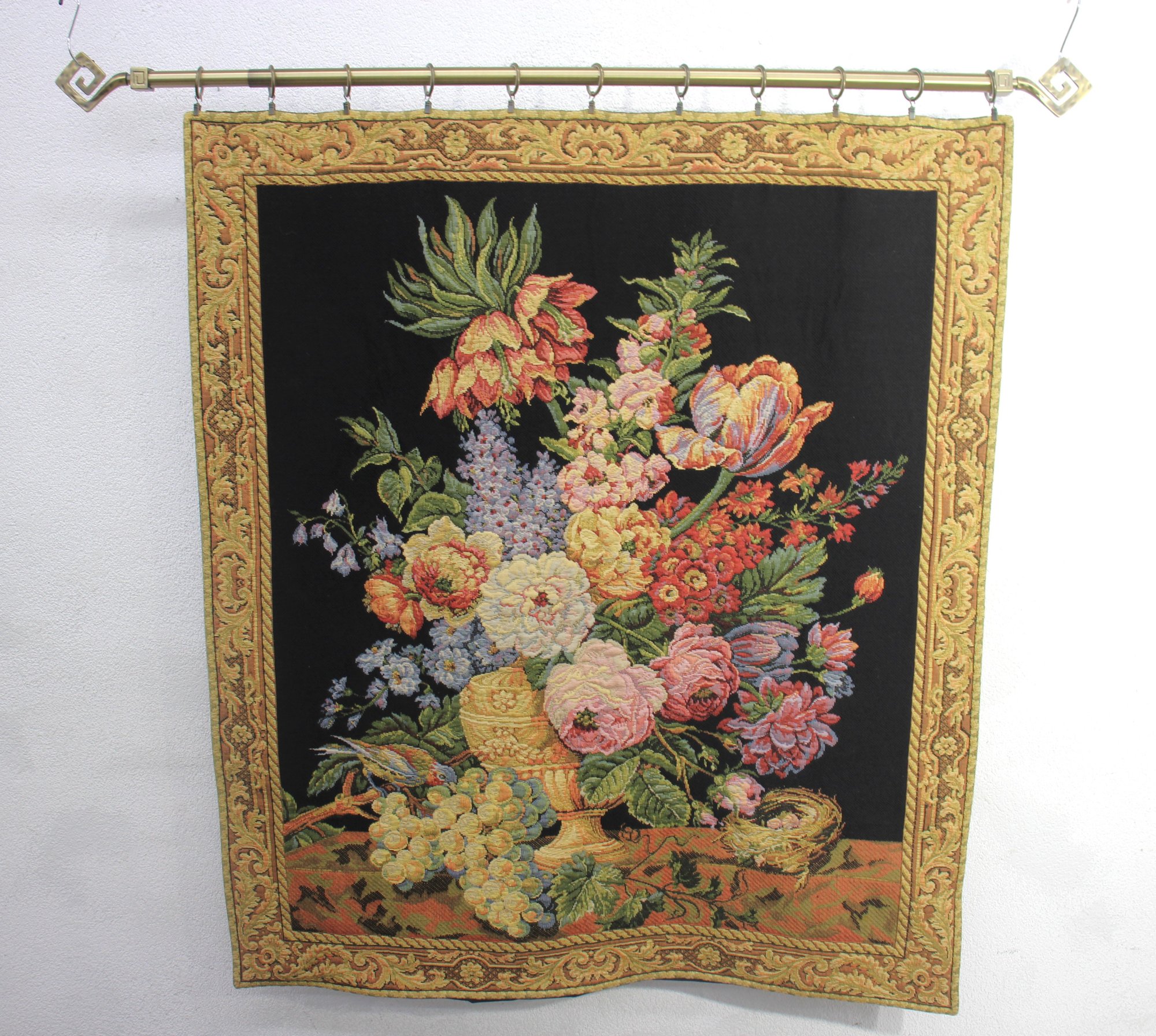 The tapestry is bordered by a golden decorative frame pattern, adding a touch of classic elegance. It is mounted on a sturdy metal rod with ornamental finials and rings, making it easy to hang and display. The back is lined with a black fabric for added durability.