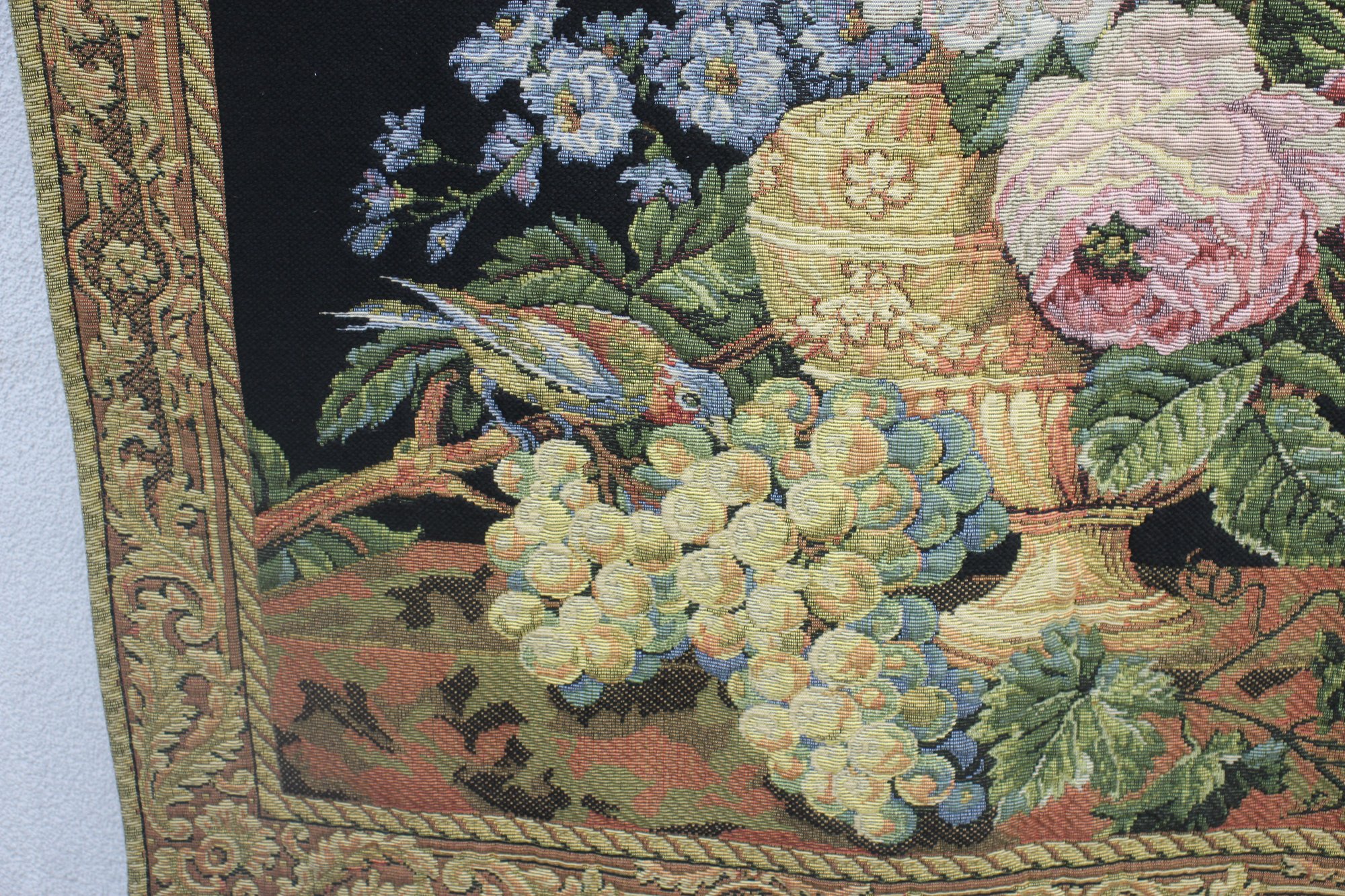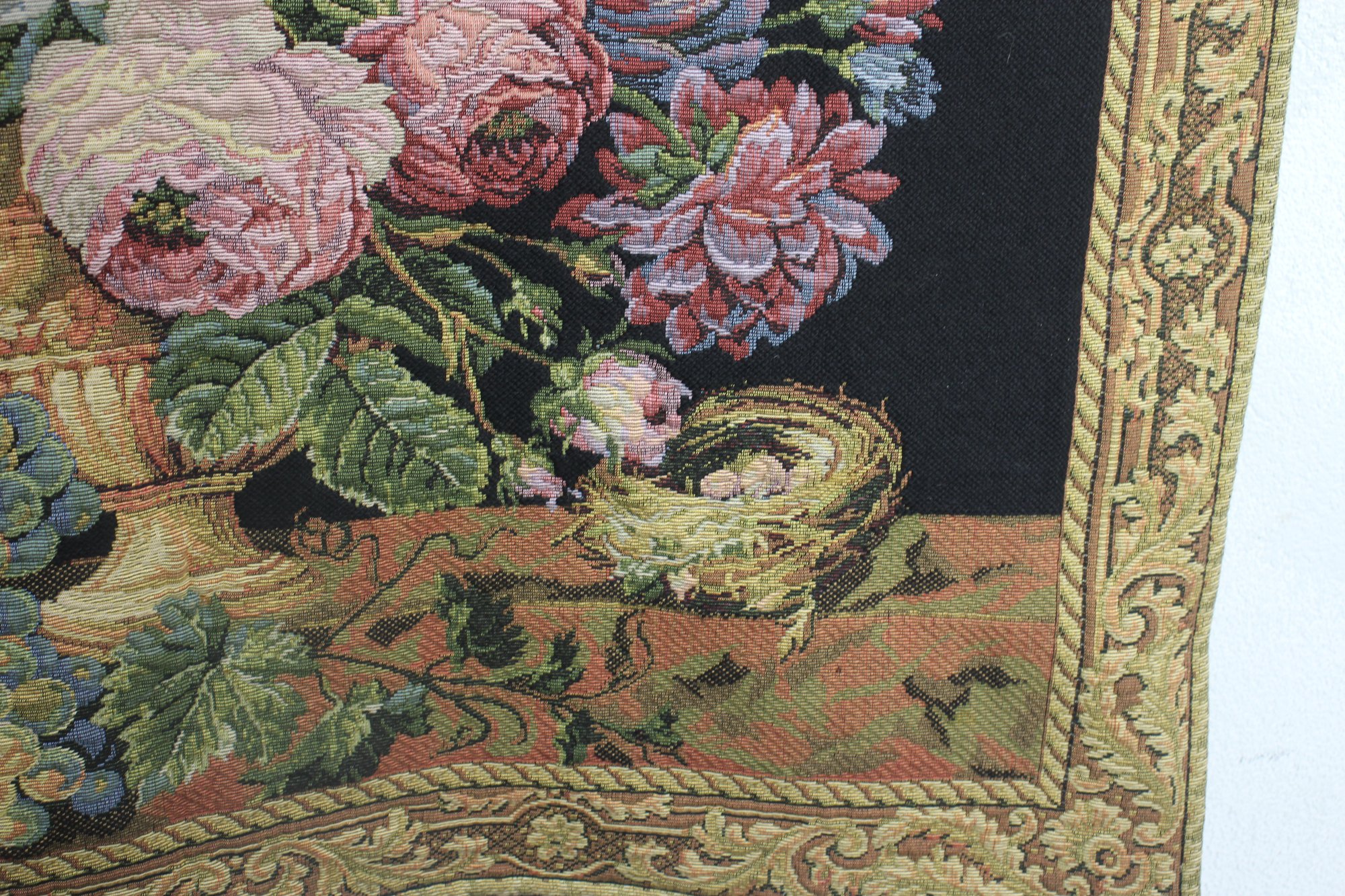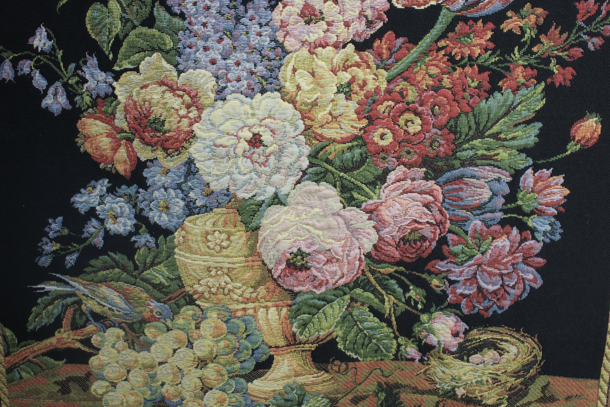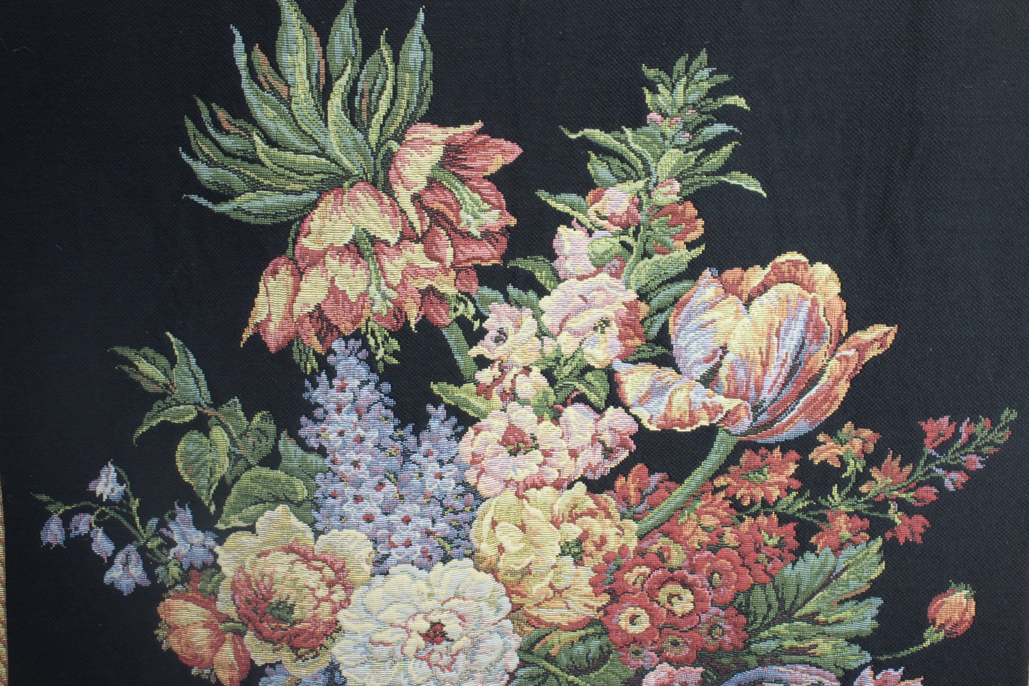 this stunning vintage floral tapestry wall hanging, featuring an exquisite Baroque-style floral arrangement on a rich black background. This piece is a true work of art, skillfully woven with intricate details and vibrant colors, creating a luxurious statement for any space.