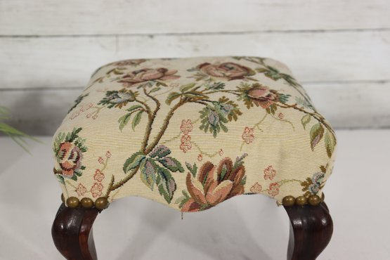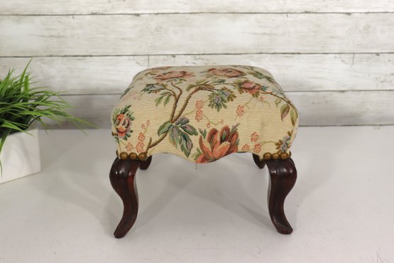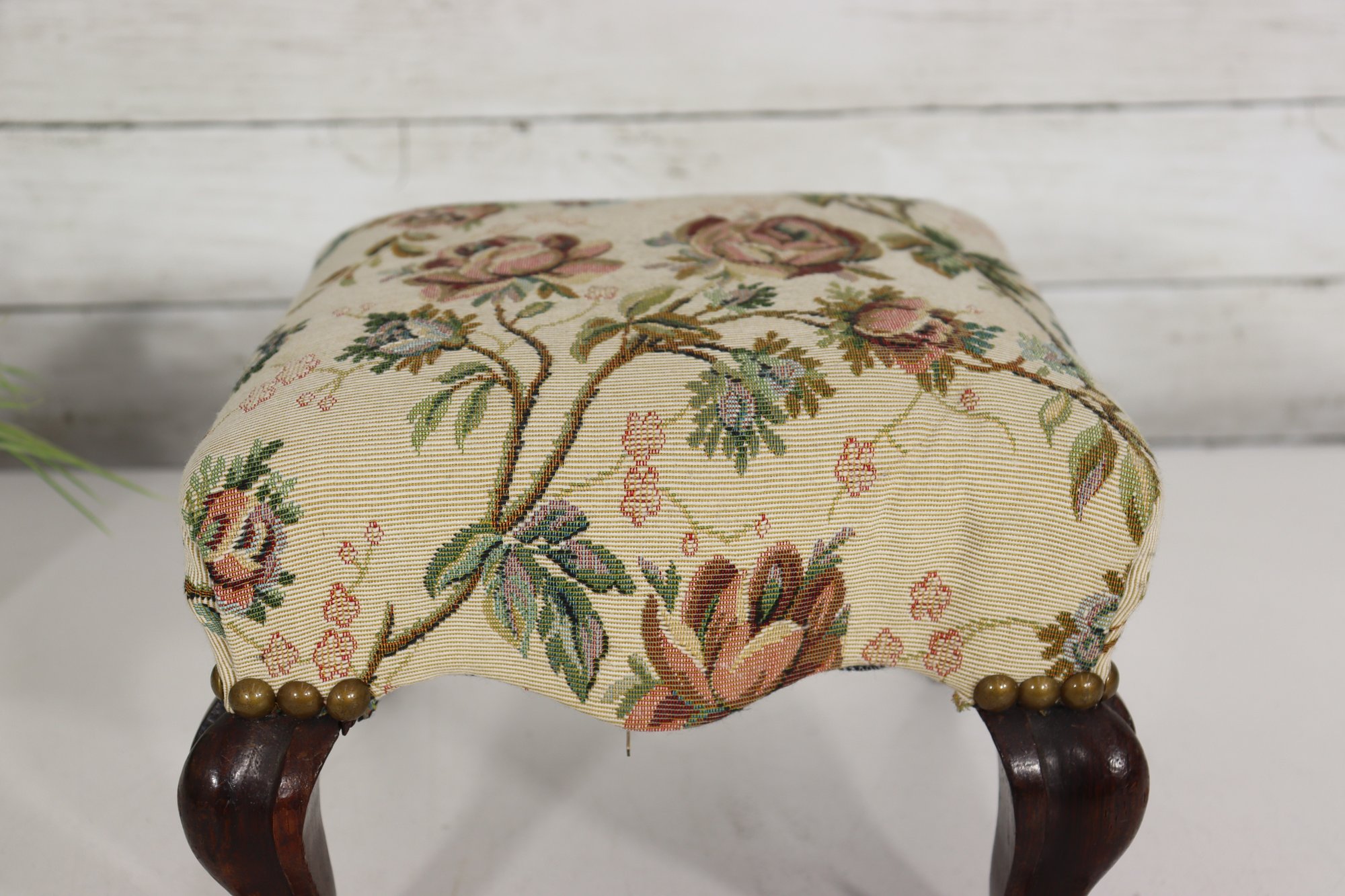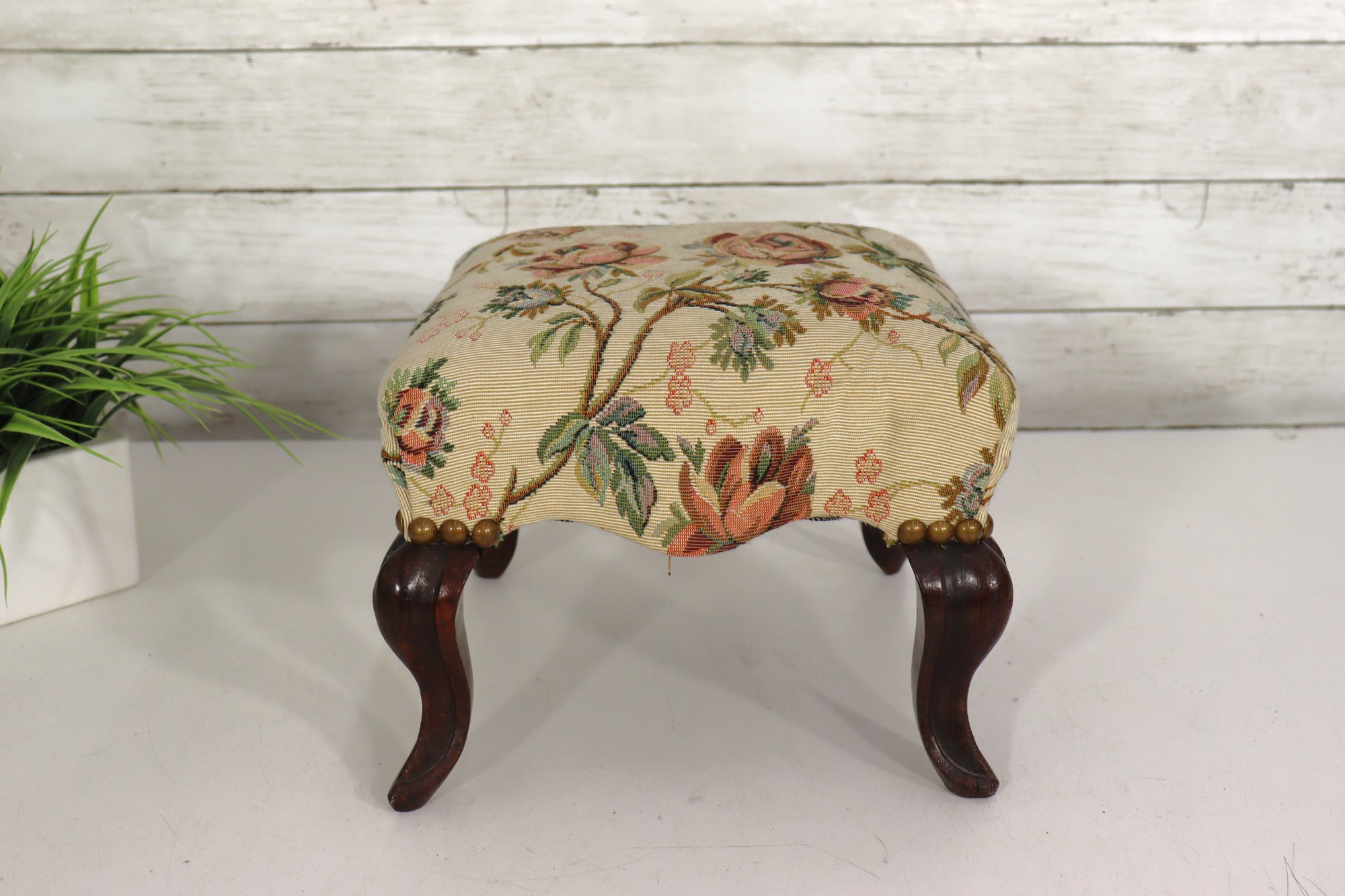 Charming vintage petite footstool featuring beautiful floral tapestry-style upholstery and wooden cabriole legs. This small accent ottoman is perfect for use as a decorative furniture piece, display riser, doll furniture prop, or footrest for a vanity or reading nook.