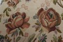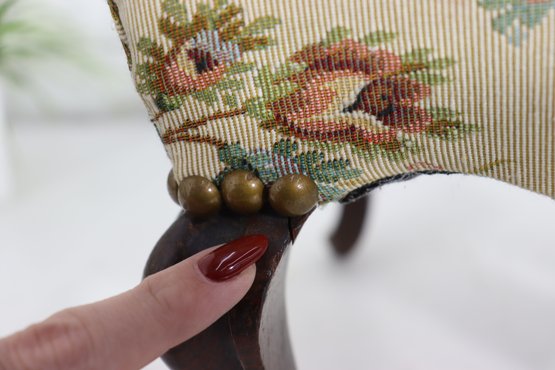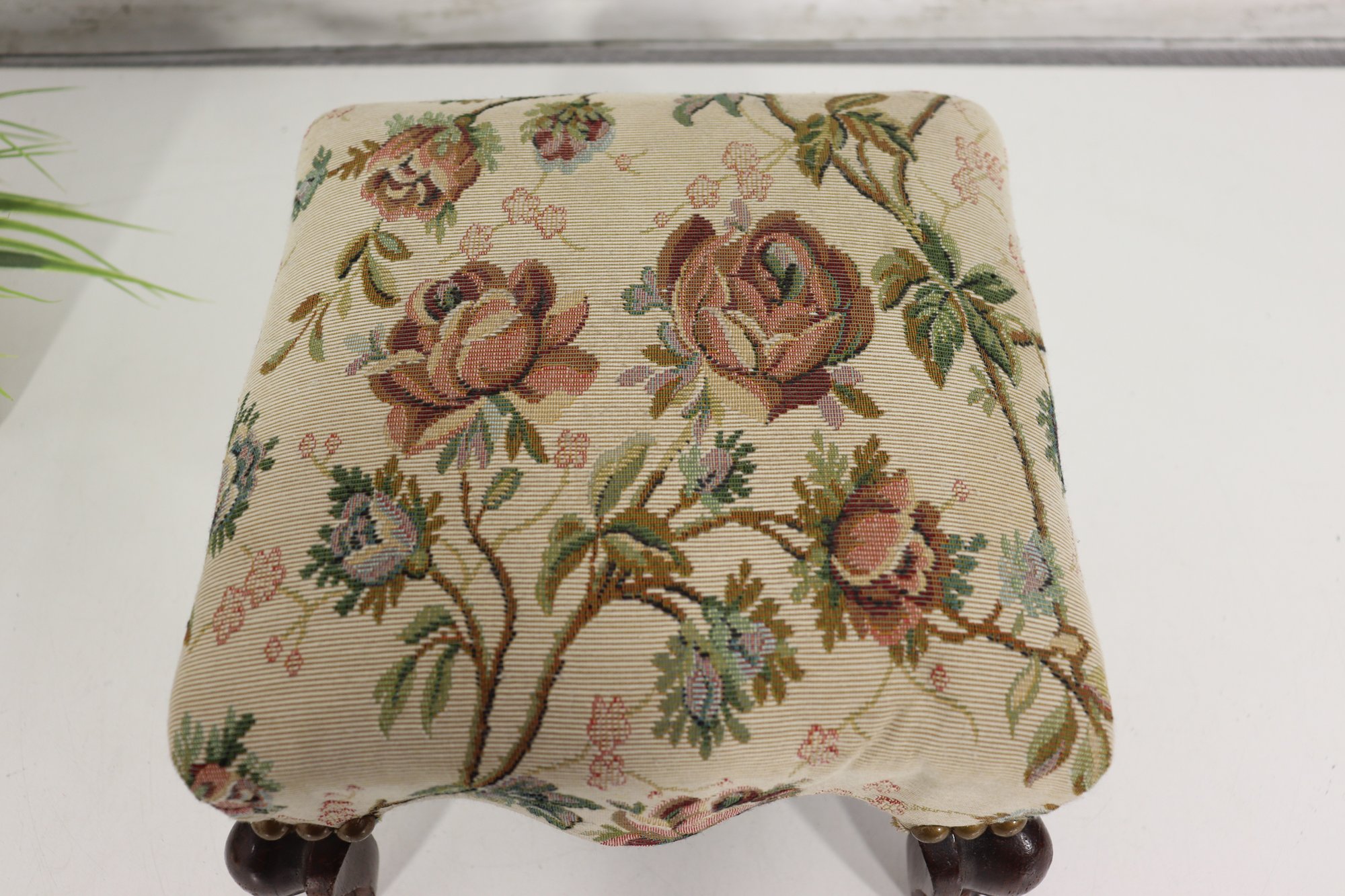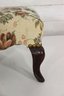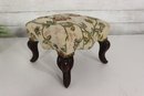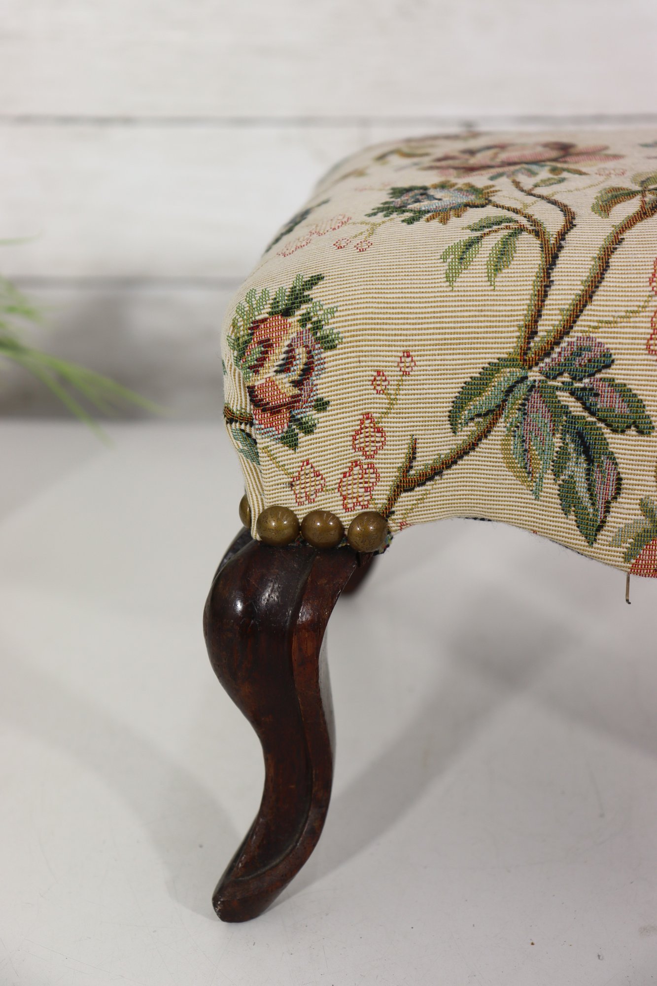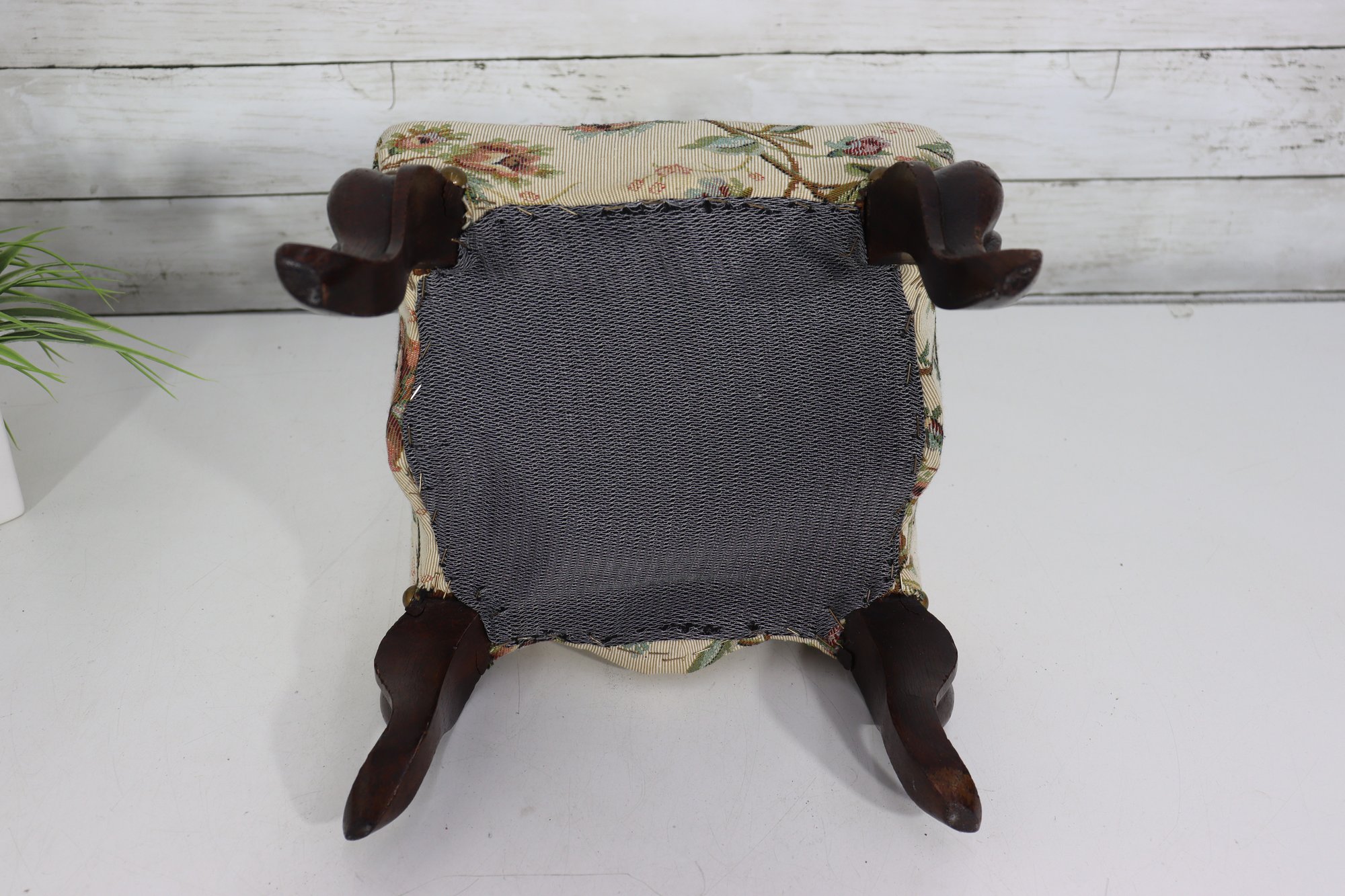 Charming vintage petite footstool featuring beautiful floral tapestry-style upholstery and wooden cabriole legs. This small accent ottoman is perfect for use as a decorative furniture piece, display riser, doll furniture prop, or footrest for a vanity or reading nook.