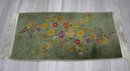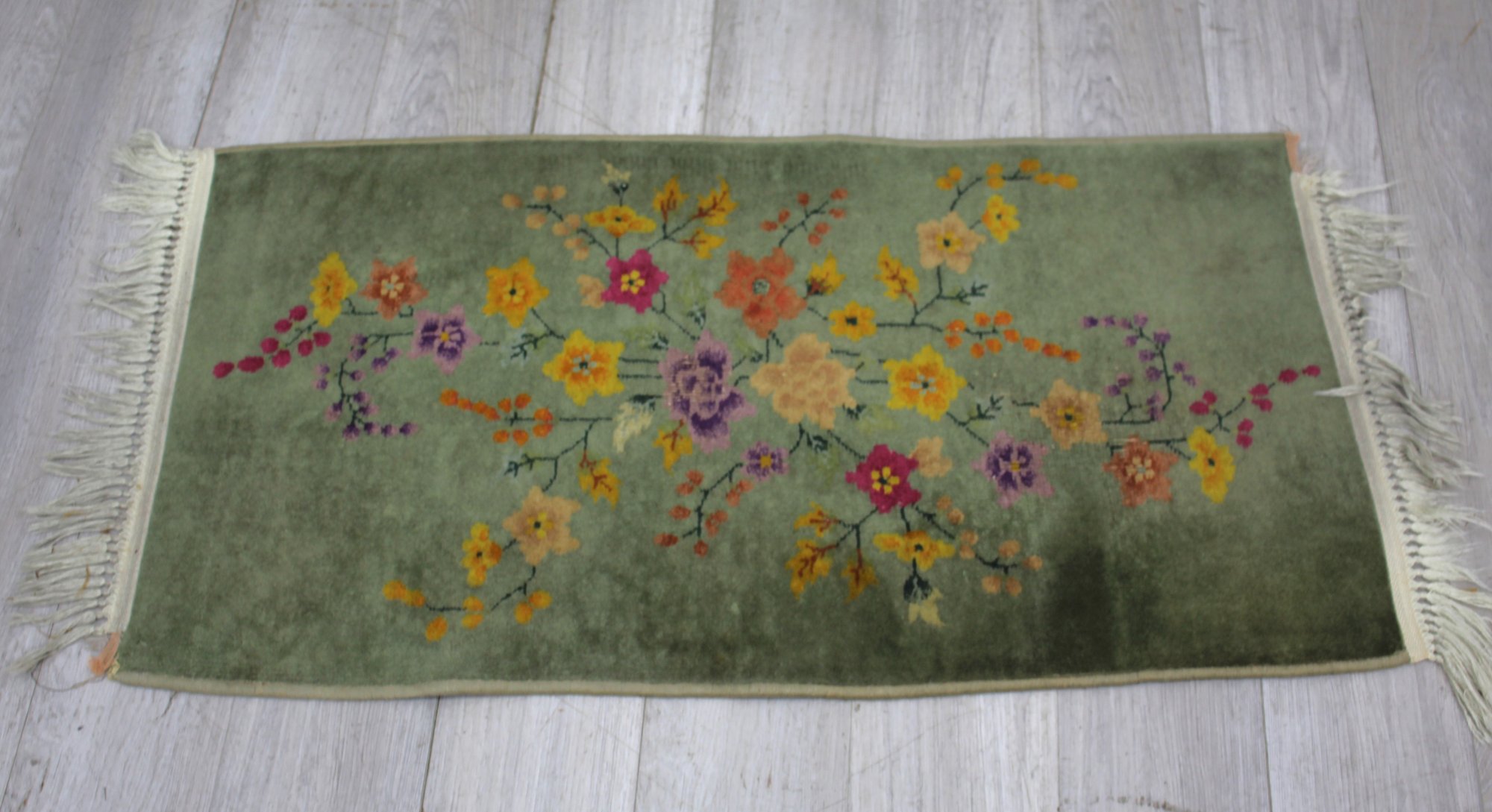 This charming vintage wool rug features a beautiful floral design in vibrant colors of yellow, orange, purple, and red against a soft green background. The delicate floral motifs are woven with fine craftsmanship, creating an elegant, nature-inspired aesthetic this rug is ideal for adding a touch of vintage charm to small spaces such as entryways, bedrooms, or living areas. It comes complete with fringe on both ends, adding a traditional touch.