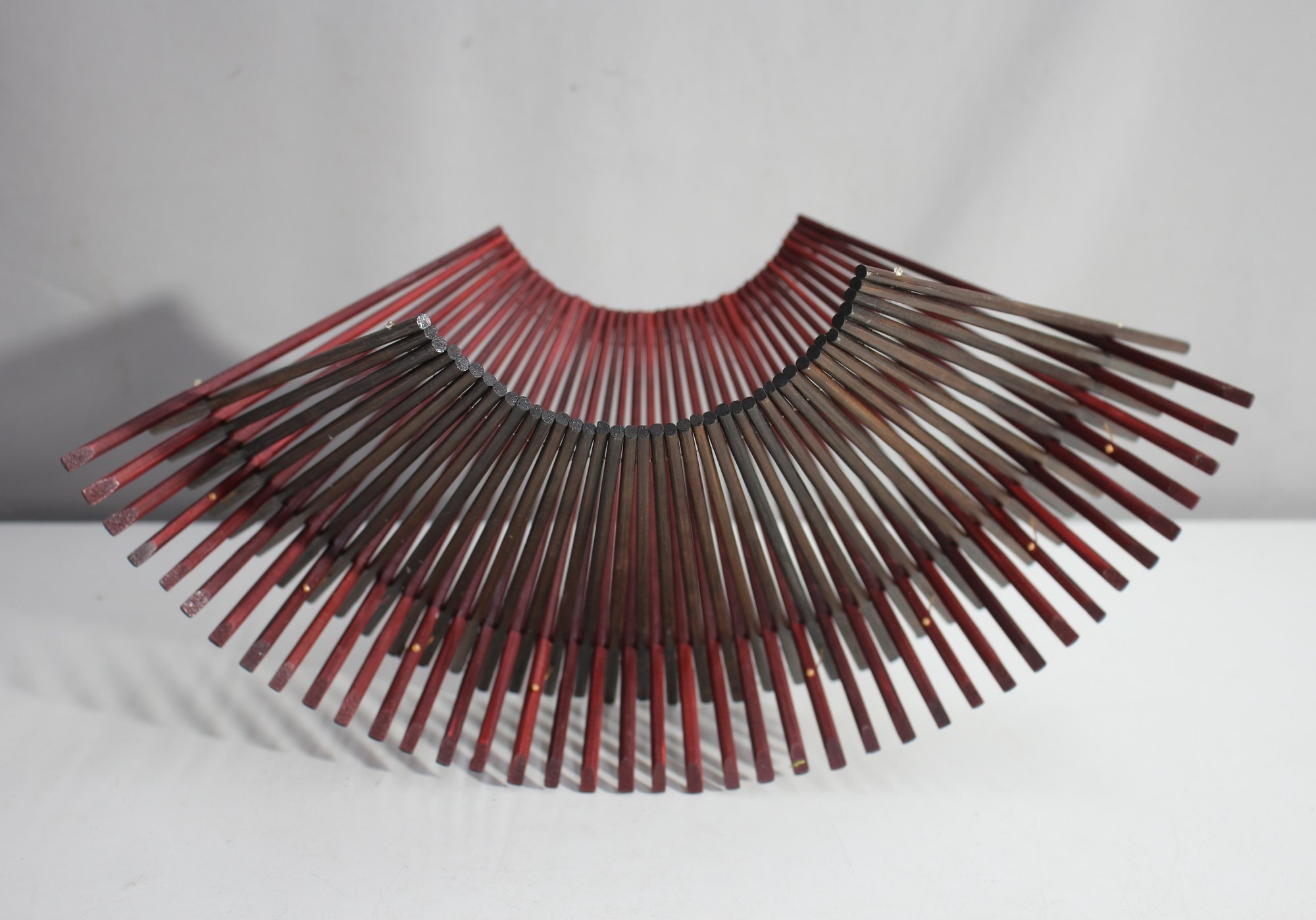 A unique and versatile vintage folding wood basket designed in a mid-century modern (MCM) Asian-inspired style. Crafted to resemble interconnected chopsticks, this basket can be elegantly fanned open for use as a fruit or bread holder or compactly folded for storage. Its intricate design and warm wood tones make it a functional yet decorative piece, perfect for adding a touch of retro charm to your dining or display area. In excellent vintage condition, this piece is both practical and a conversation starter. A must-have for collectors or lovers of unique home décor!