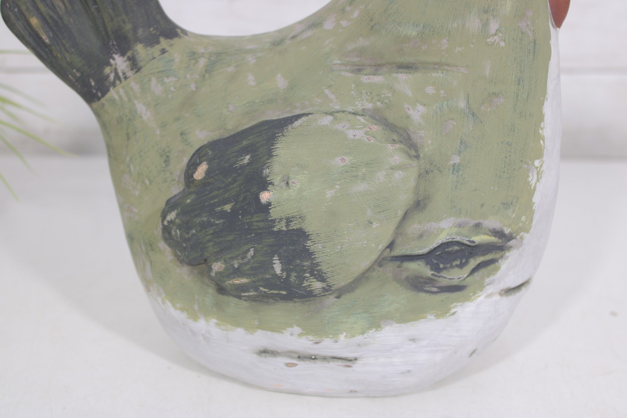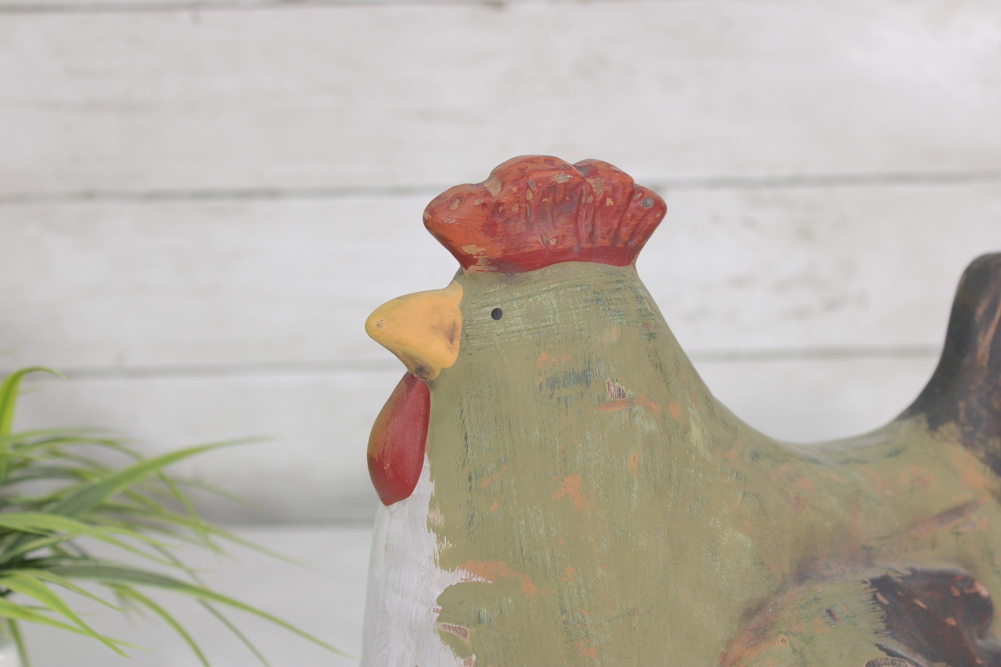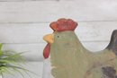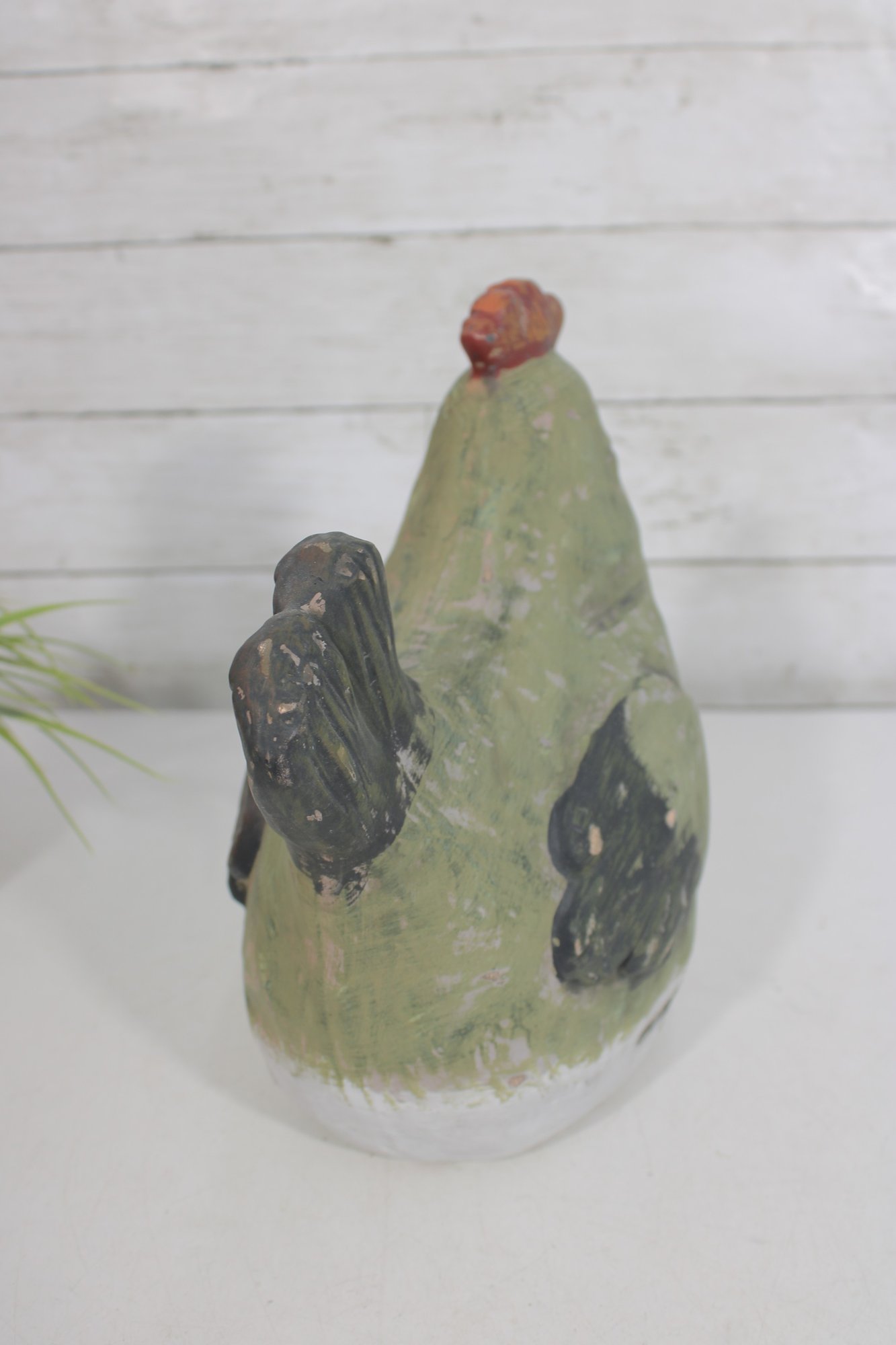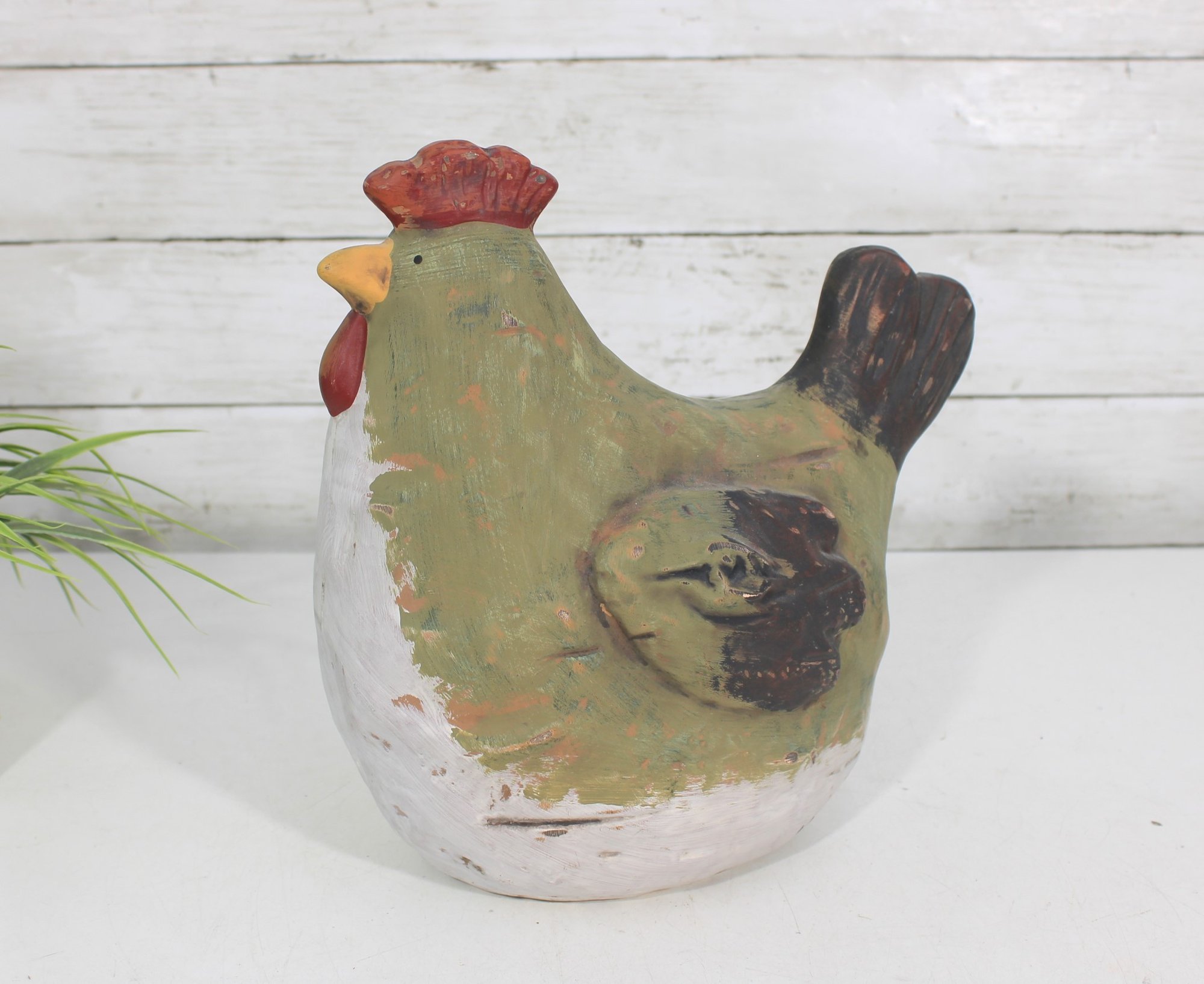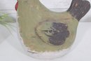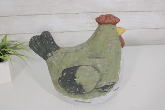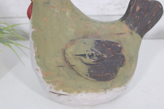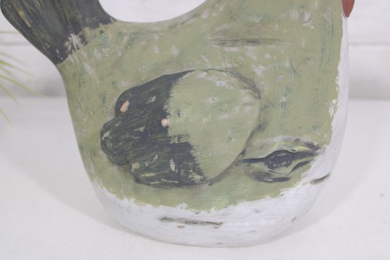 The hen form is sculptural and full of character, with textured brushwork and a slightly distressed finish that enhances its folk art appeal. The hollow interior allows for use as a vase or decorative container, while the piece also stands beautifully on its own as a display accent.