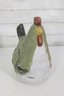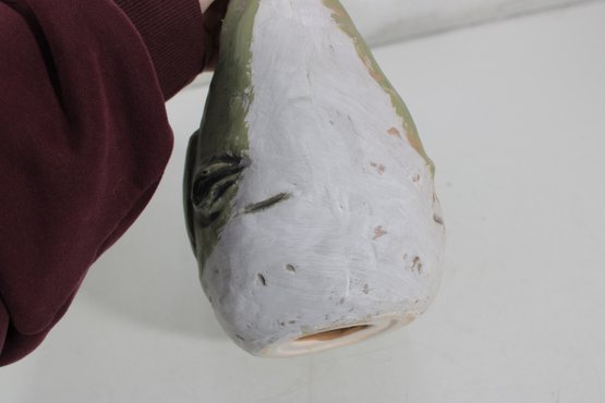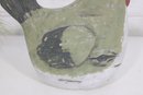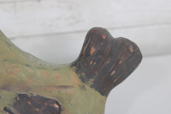 charming vintage folk art pottery vase in the form of a hen, standing approximately 10 inches tall. This whimsical piece features a hand-painted finish with earthy tones of green, brown, cream, and red, giving it a rustic, farmhouse aesthetic.