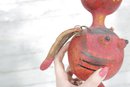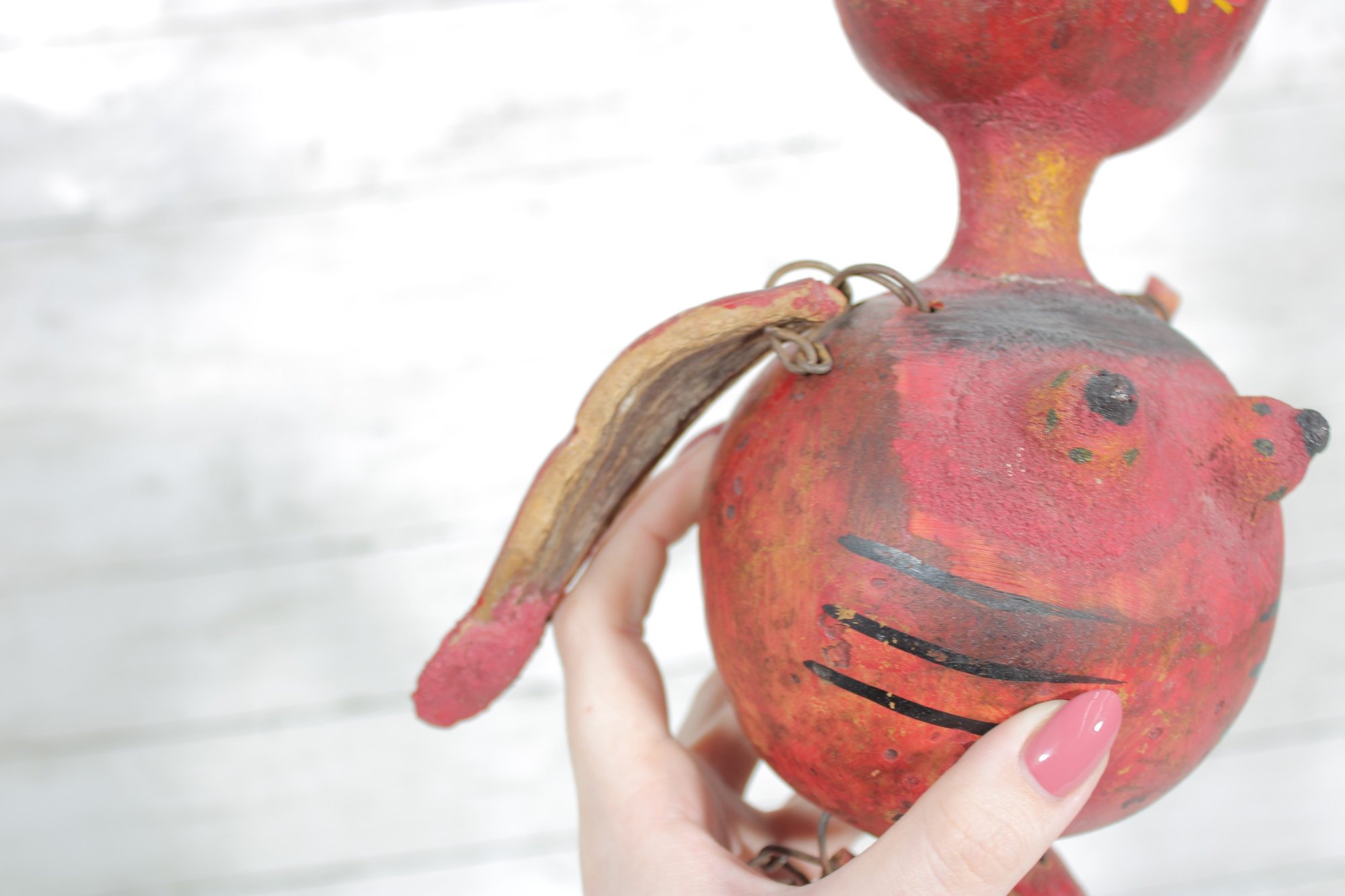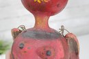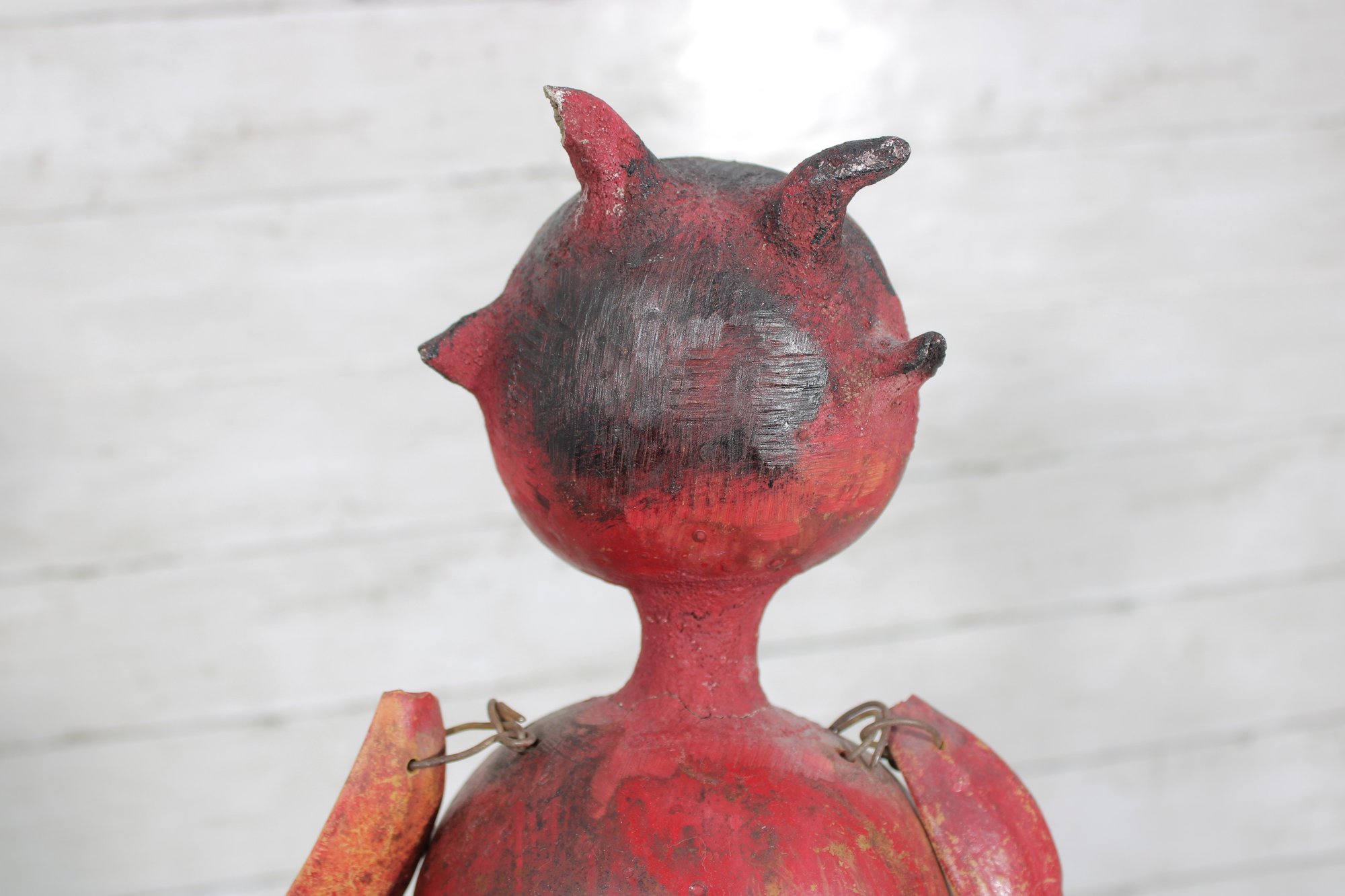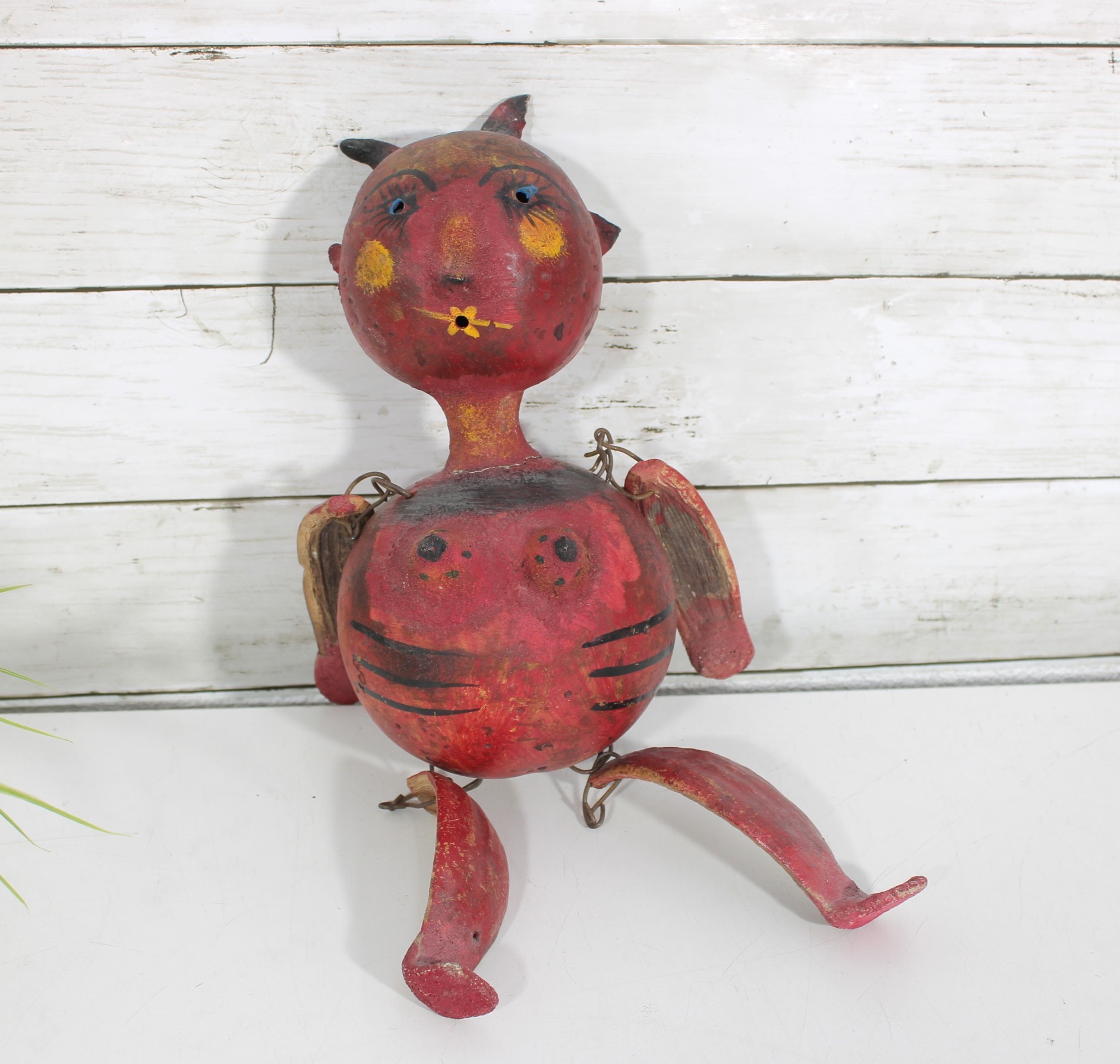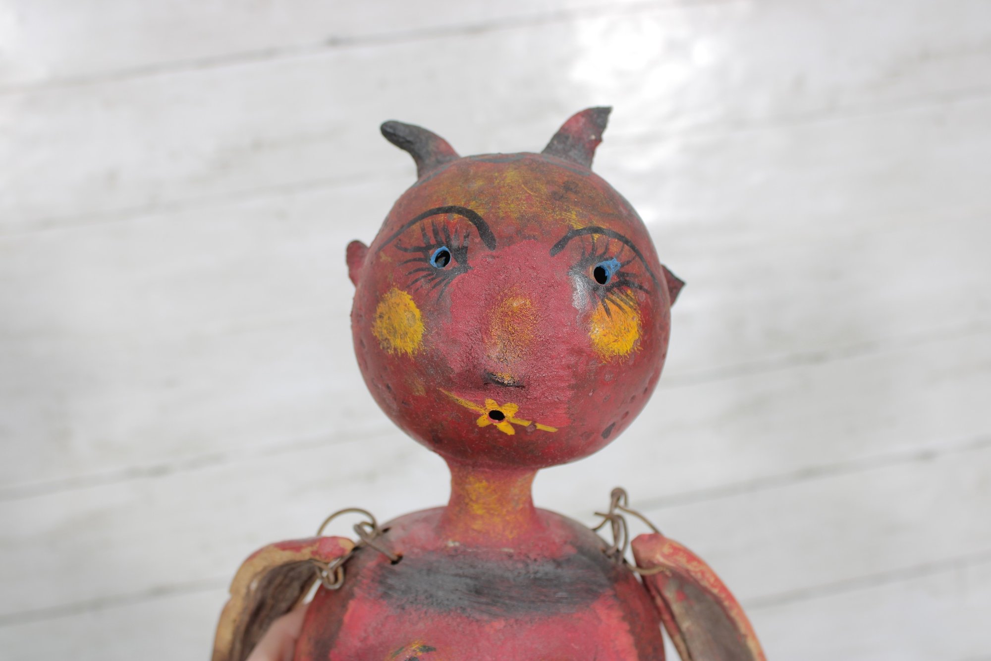 a unique vintage folk art devil or imp figure, featuring a whimsical hand-painted design and articulated construction. The piece displays a charming primitive style with small horns, expressive facial features, and a bright red painted body accented with yellow cheeks and decorative details.