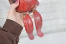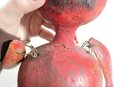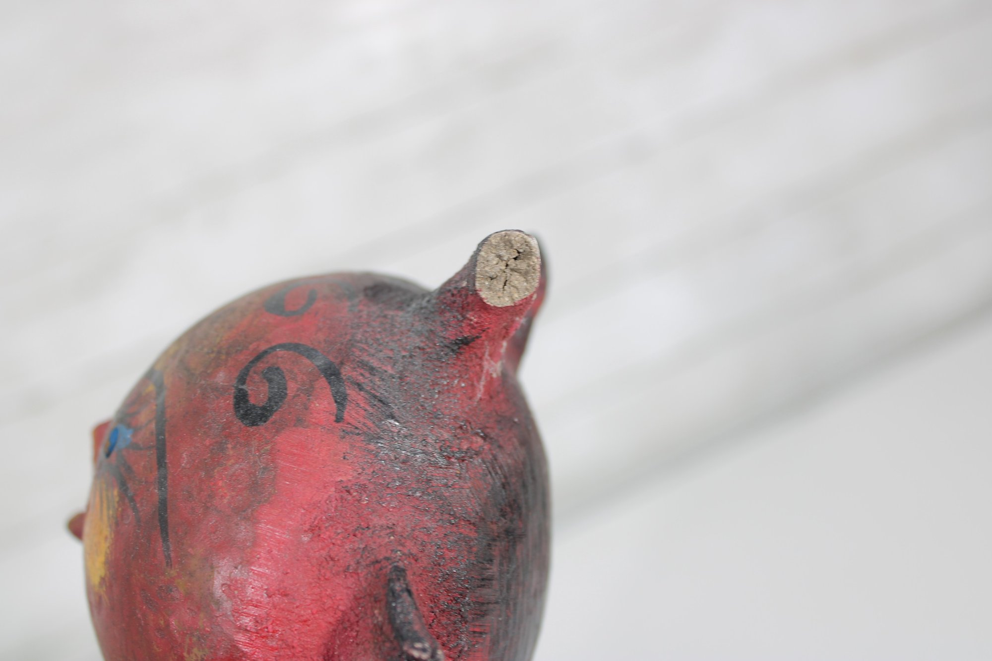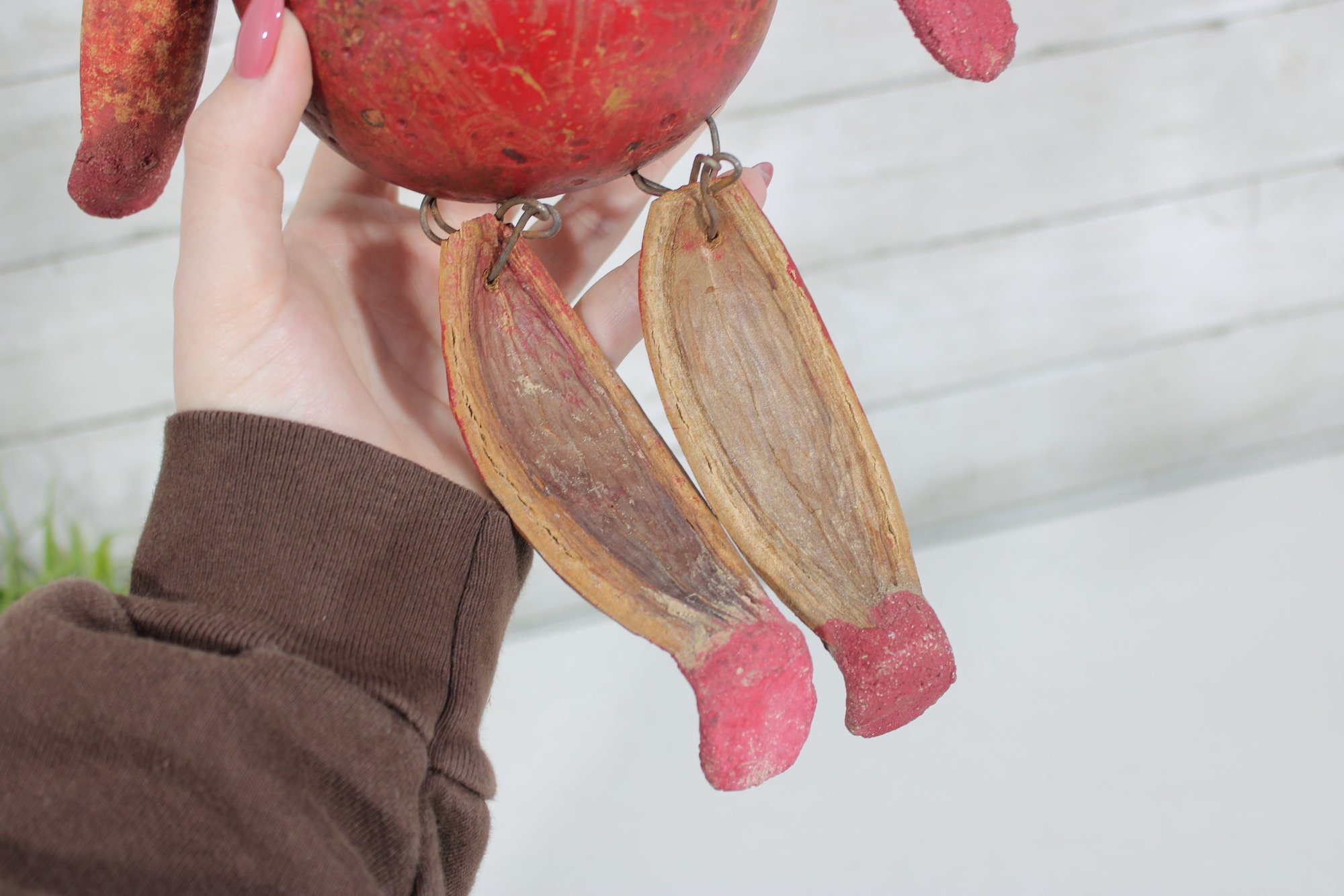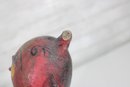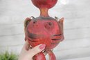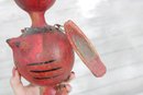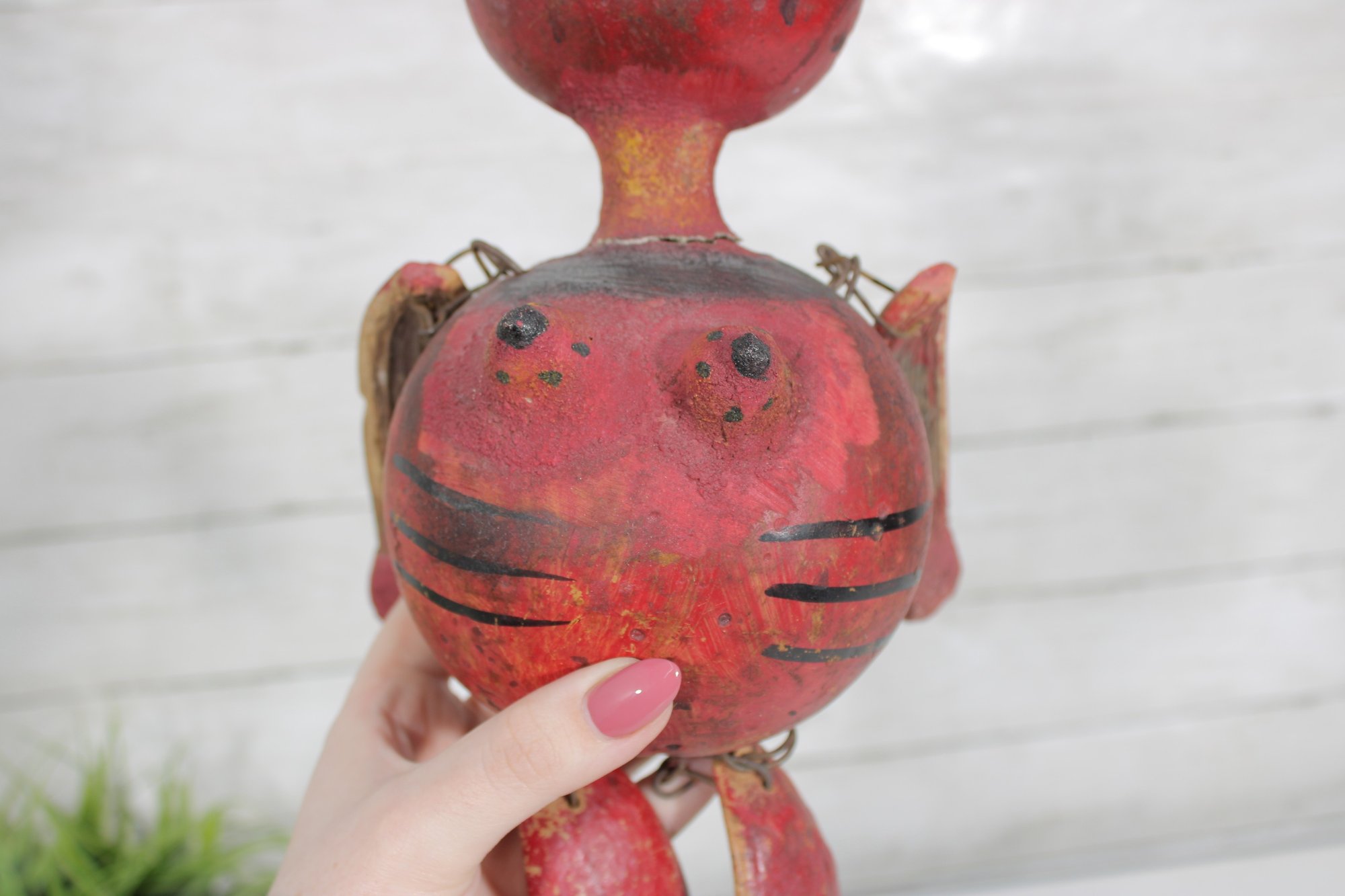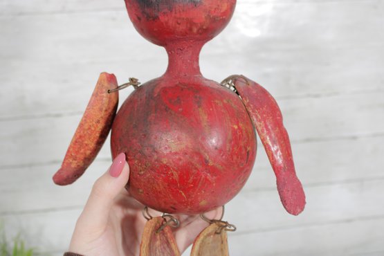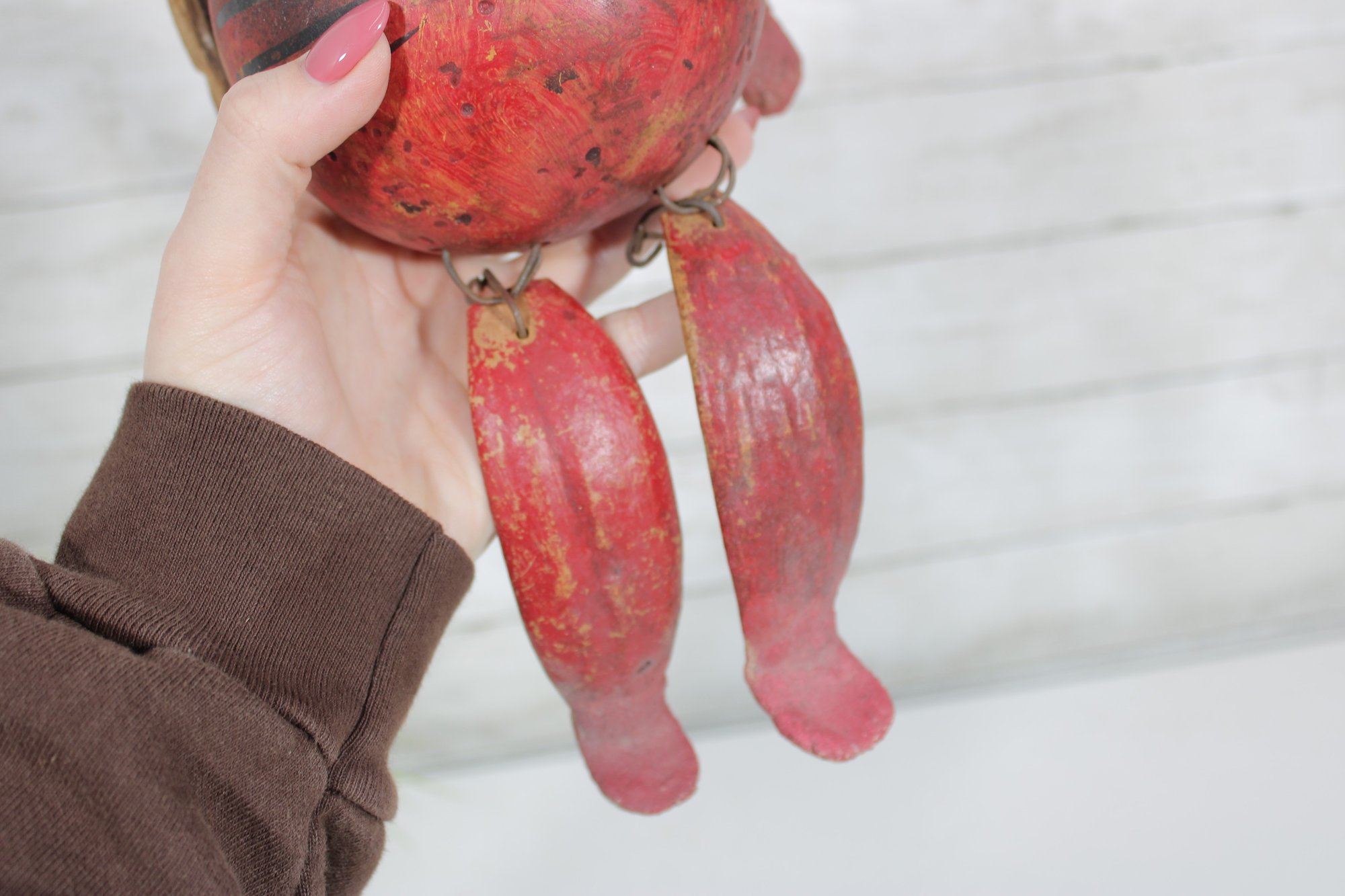 a unique vintage folk art devil or imp figure, featuring a whimsical hand-painted design and articulated construction. The piece displays a charming primitive style with small horns, expressive facial features, and a bright red painted body accented with yellow cheeks and decorative details.