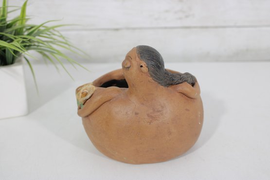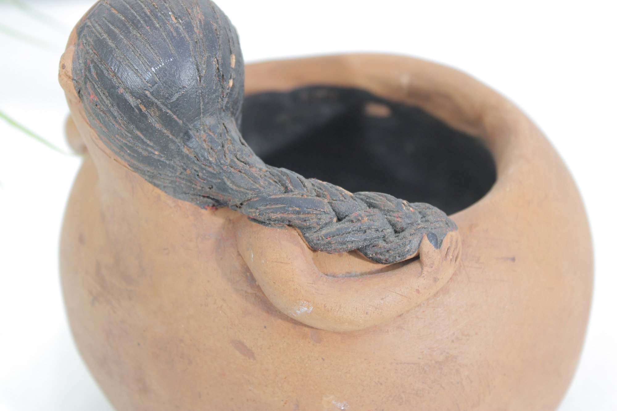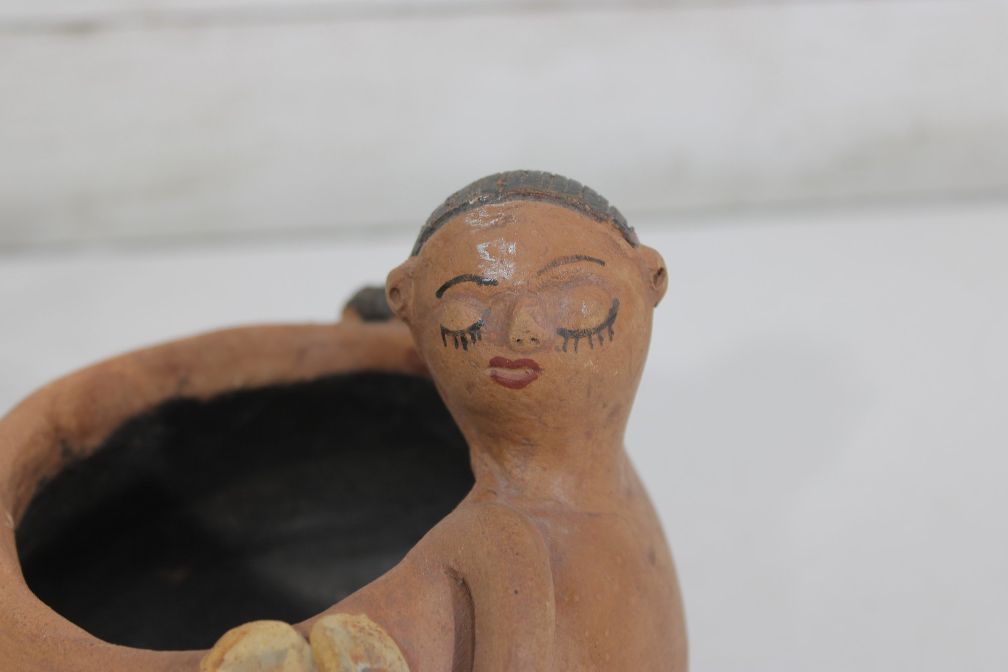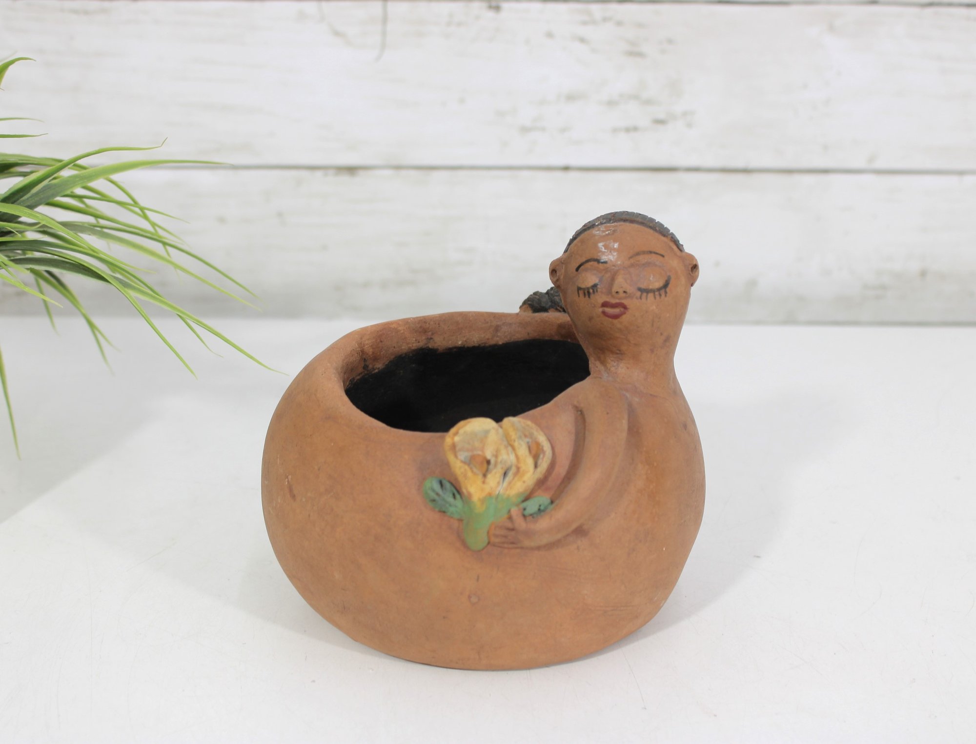 charming vintage folk art pottery planter featuring a stylized female figure emerging from a rounded vessel form. The piece measures approximately 5.5 inches high by 5.5 inches wide and is crafted in earthy terracotta-toned pottery.