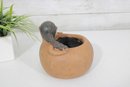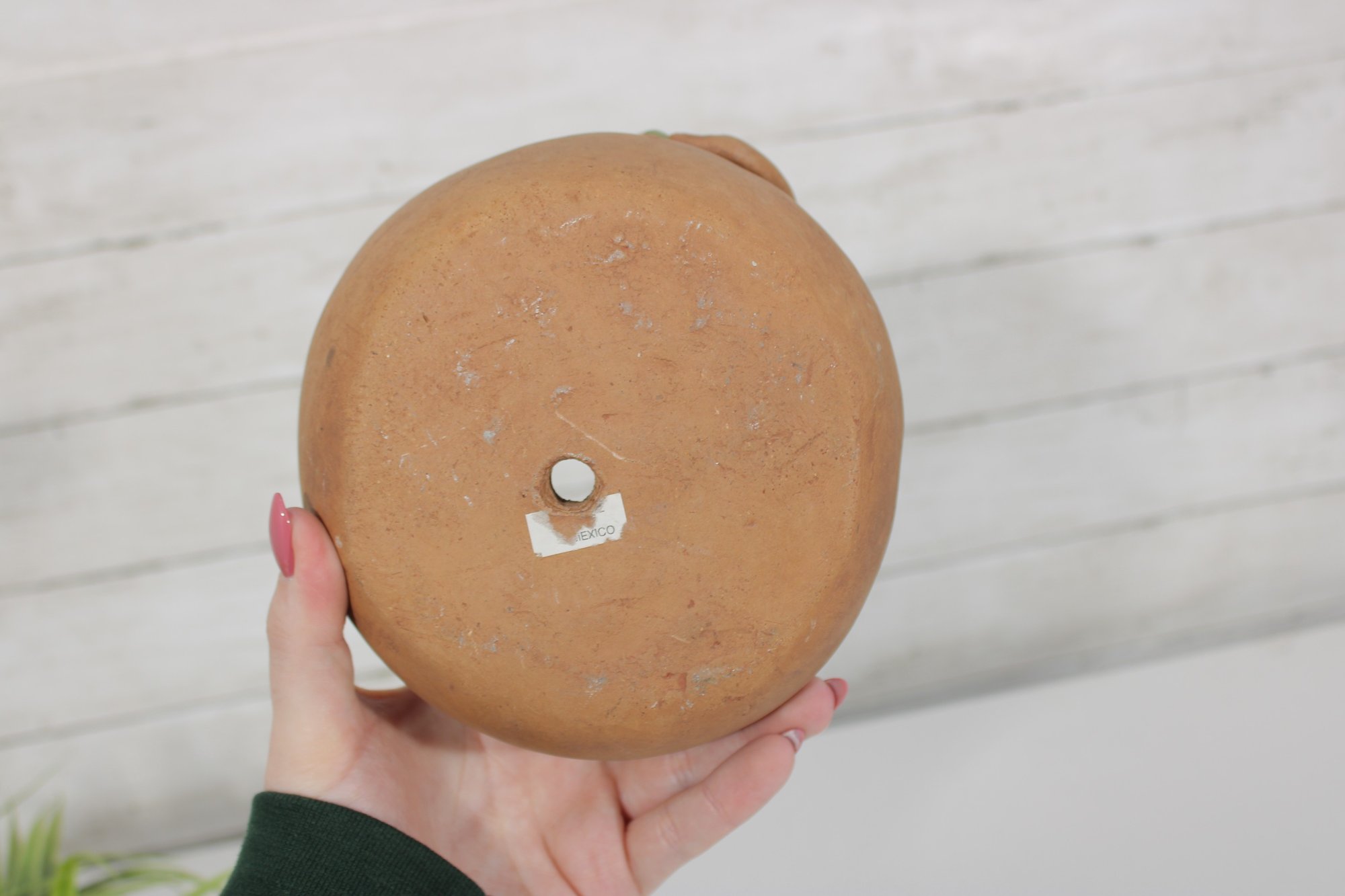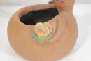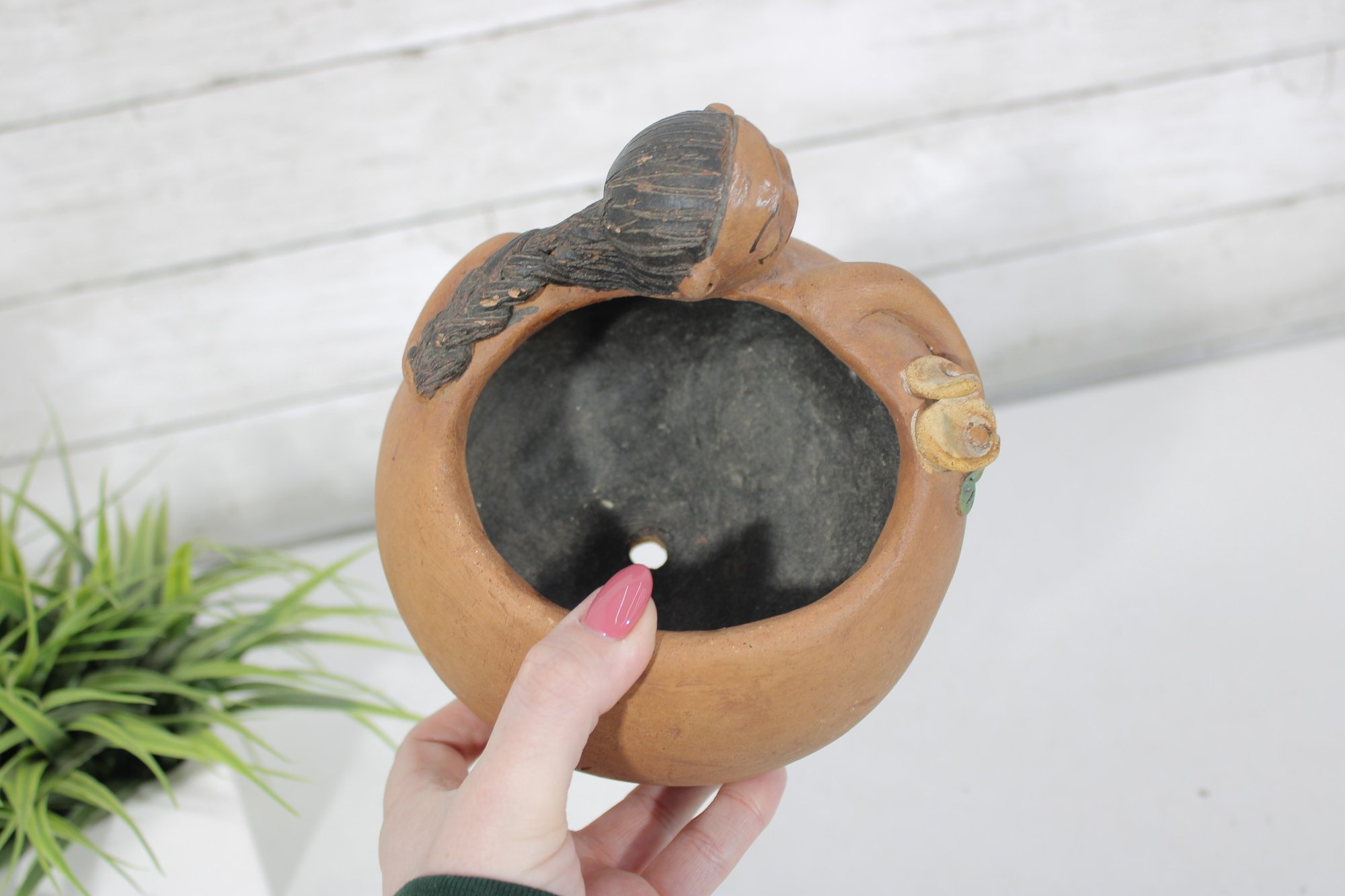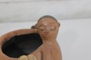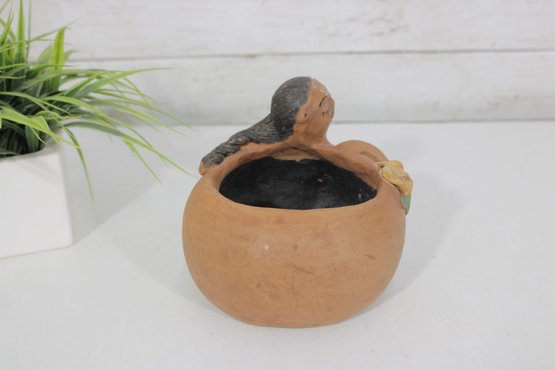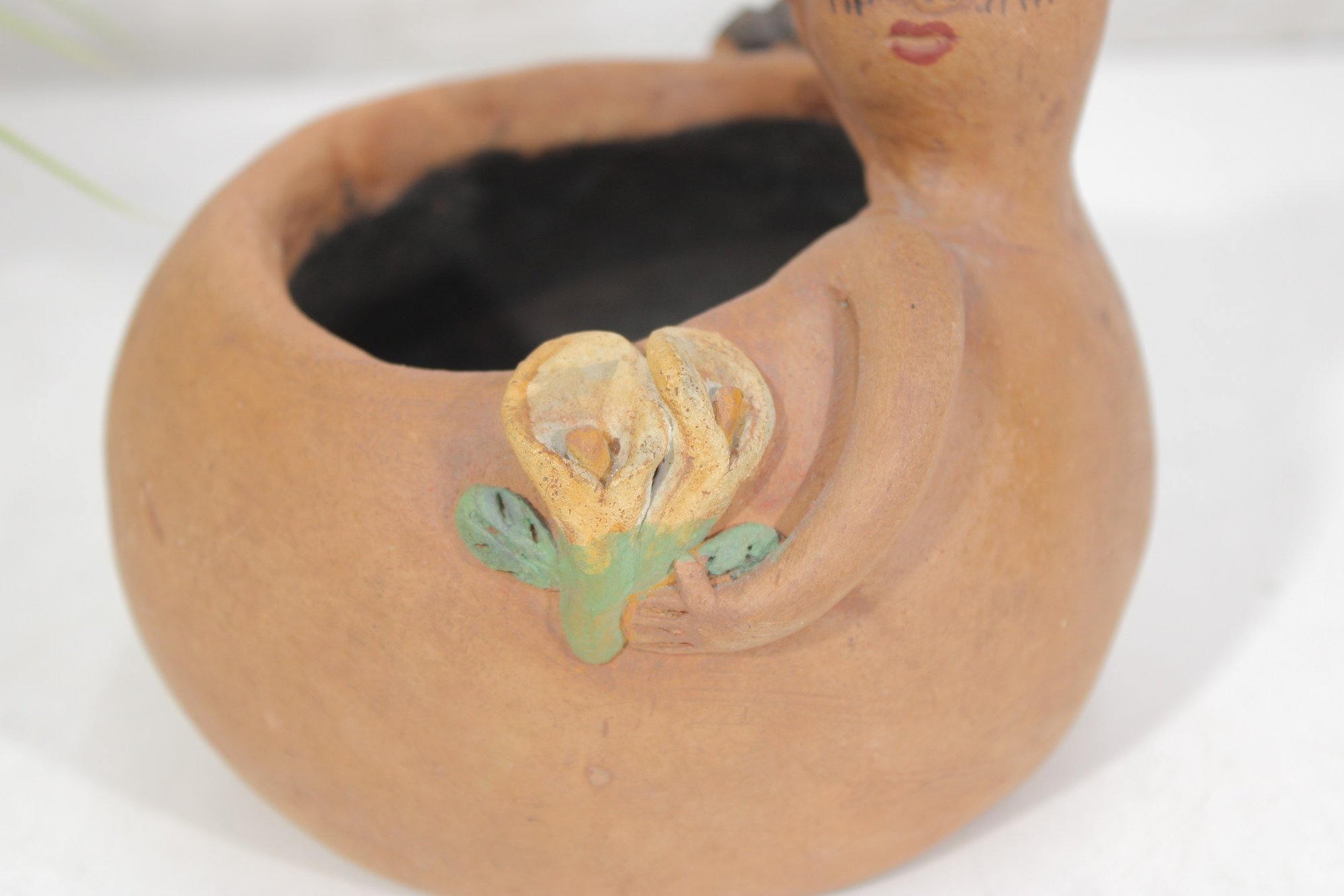 charming vintage folk art pottery planter featuring a stylized female figure emerging from a rounded vessel form. The piece measures approximately 5.5 inches high by 5.5 inches wide and is crafted in earthy terracotta-toned pottery.