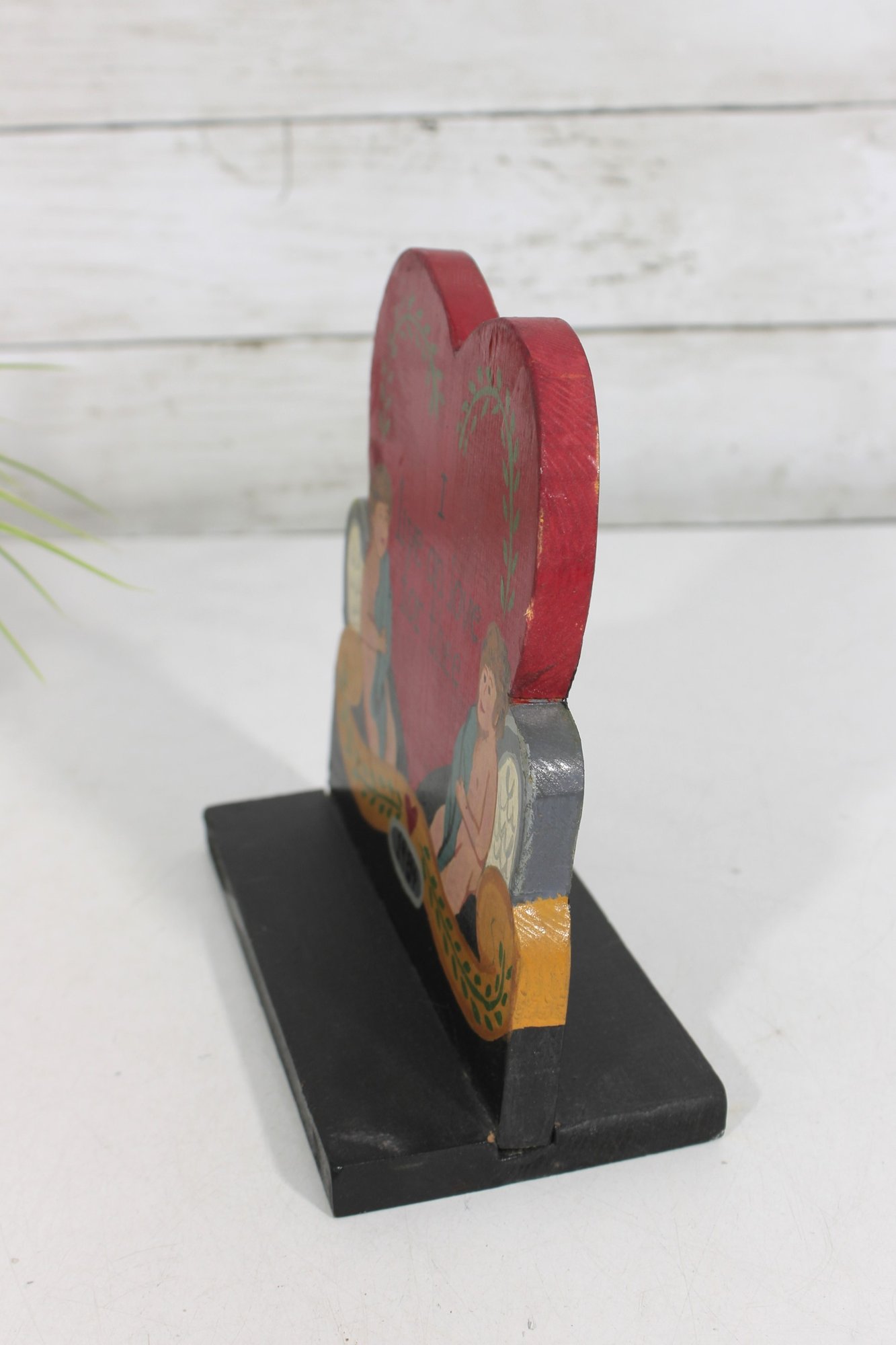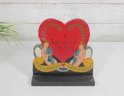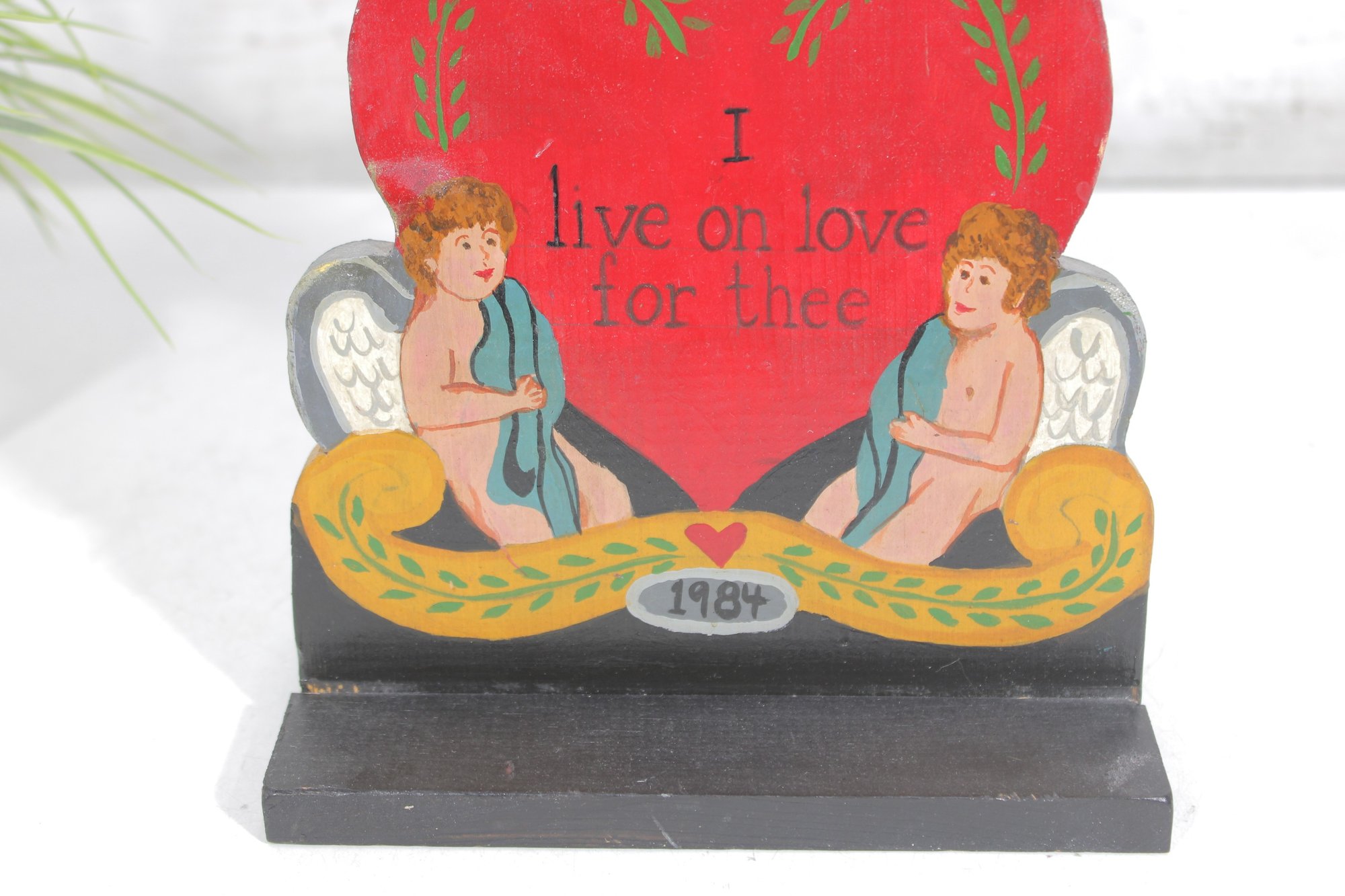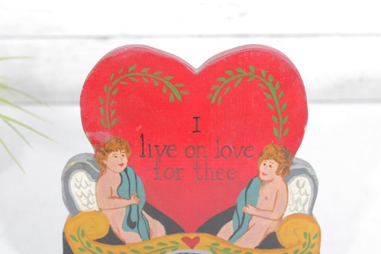 Charming vintage folk art Valentine display sign featuring a bright red heart with the romantic phrase “I Live On Love For Thee.” The design includes two sweet cherub figures seated on either side of the heart, creating a classic romantic motif.