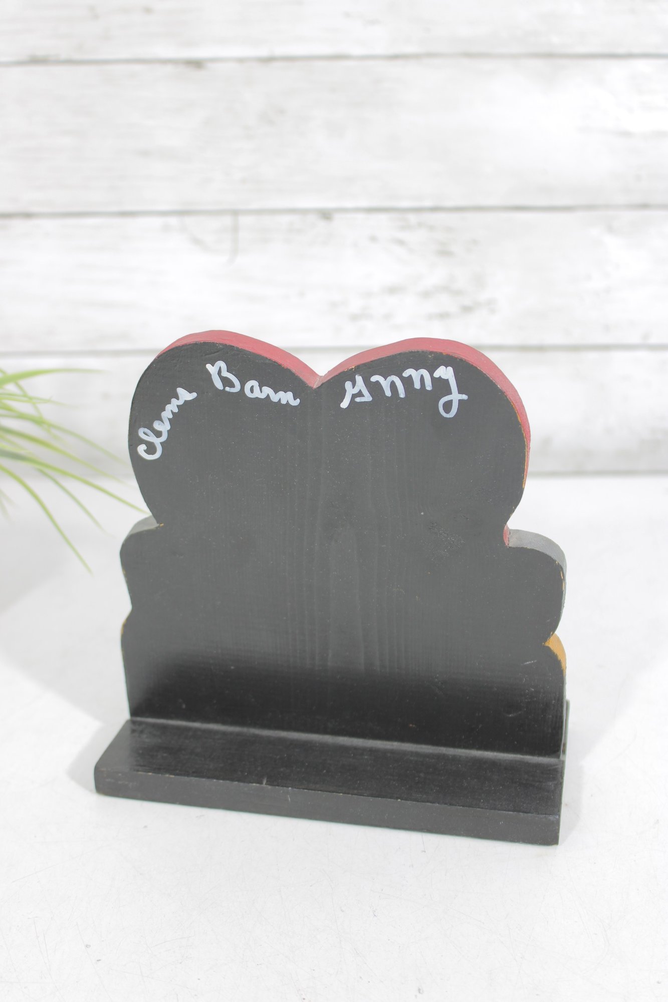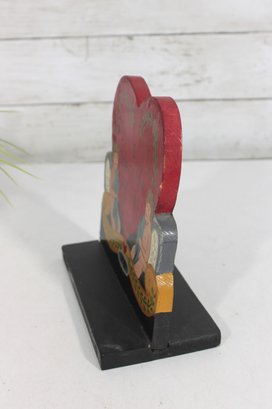 The piece is hand-painted with vibrant colors and mounted on a black wooden base, allowing it to stand upright for display. A small “1987” marking appears on the front, suggesting it may have been made as a folk art or decorative commemorative piece.
