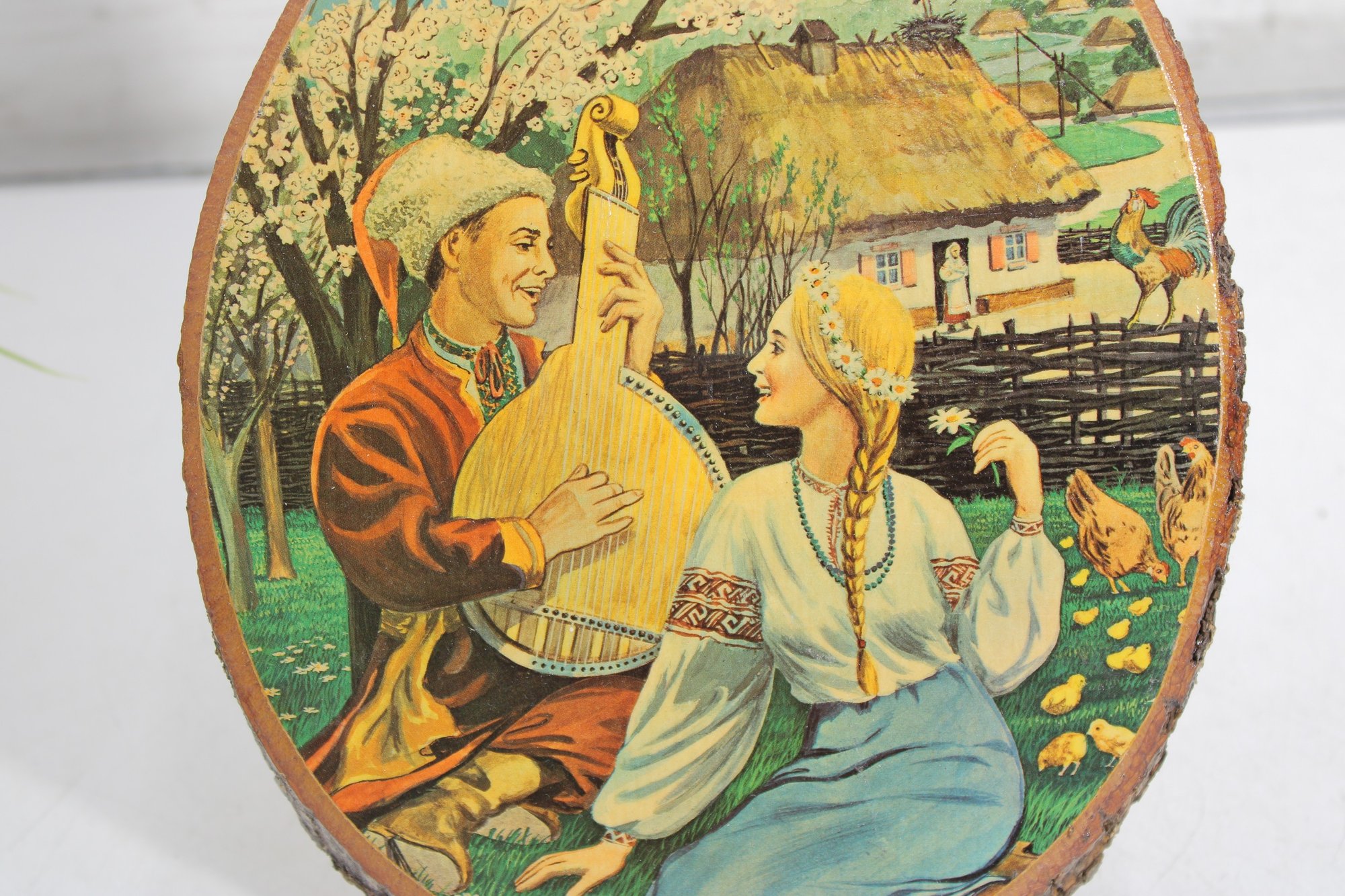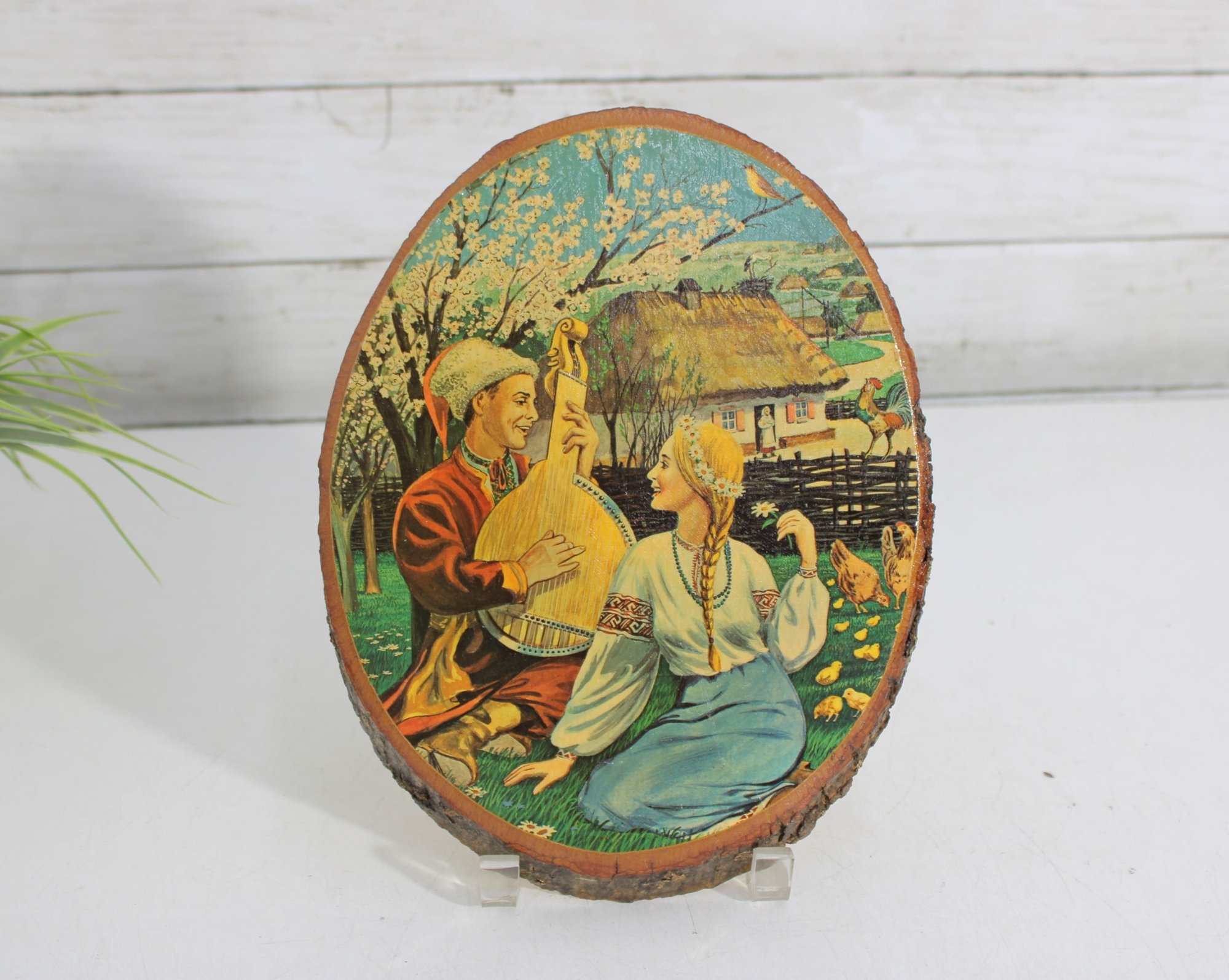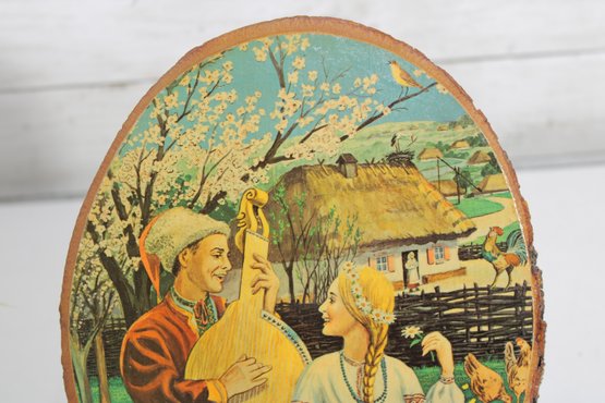 The image depicts a traditional countryside setting with a man playing a stringed instrument beside a woman in classic folk dress, set near a cottage, trees, and farmyard details. The artwork is mounted on a real wood slice, complete with natural bark edge, giving it wonderful texture and authentic rustic appeal.