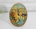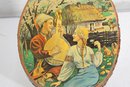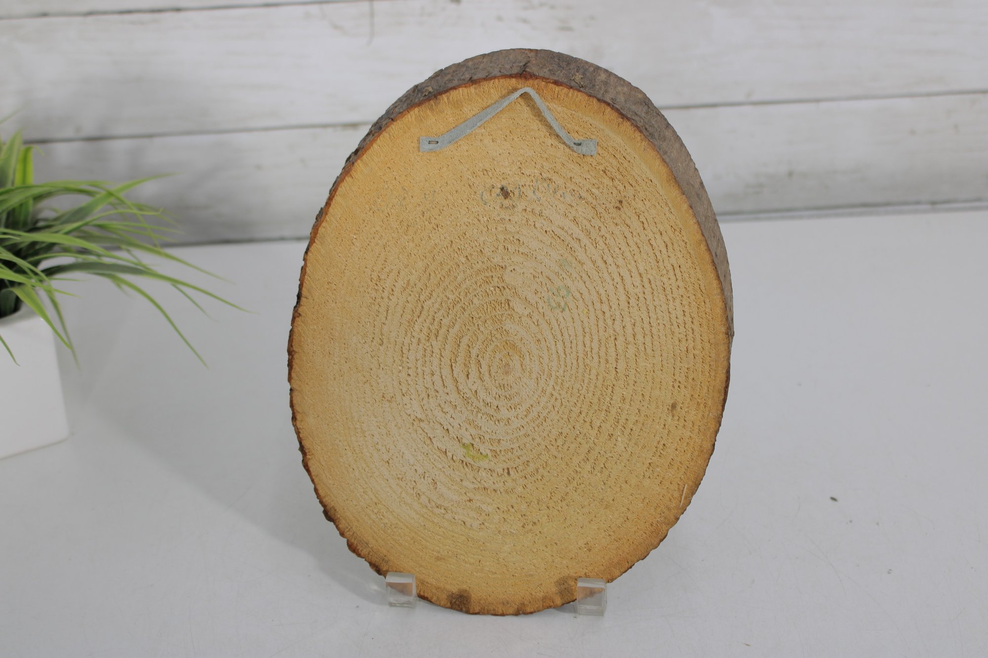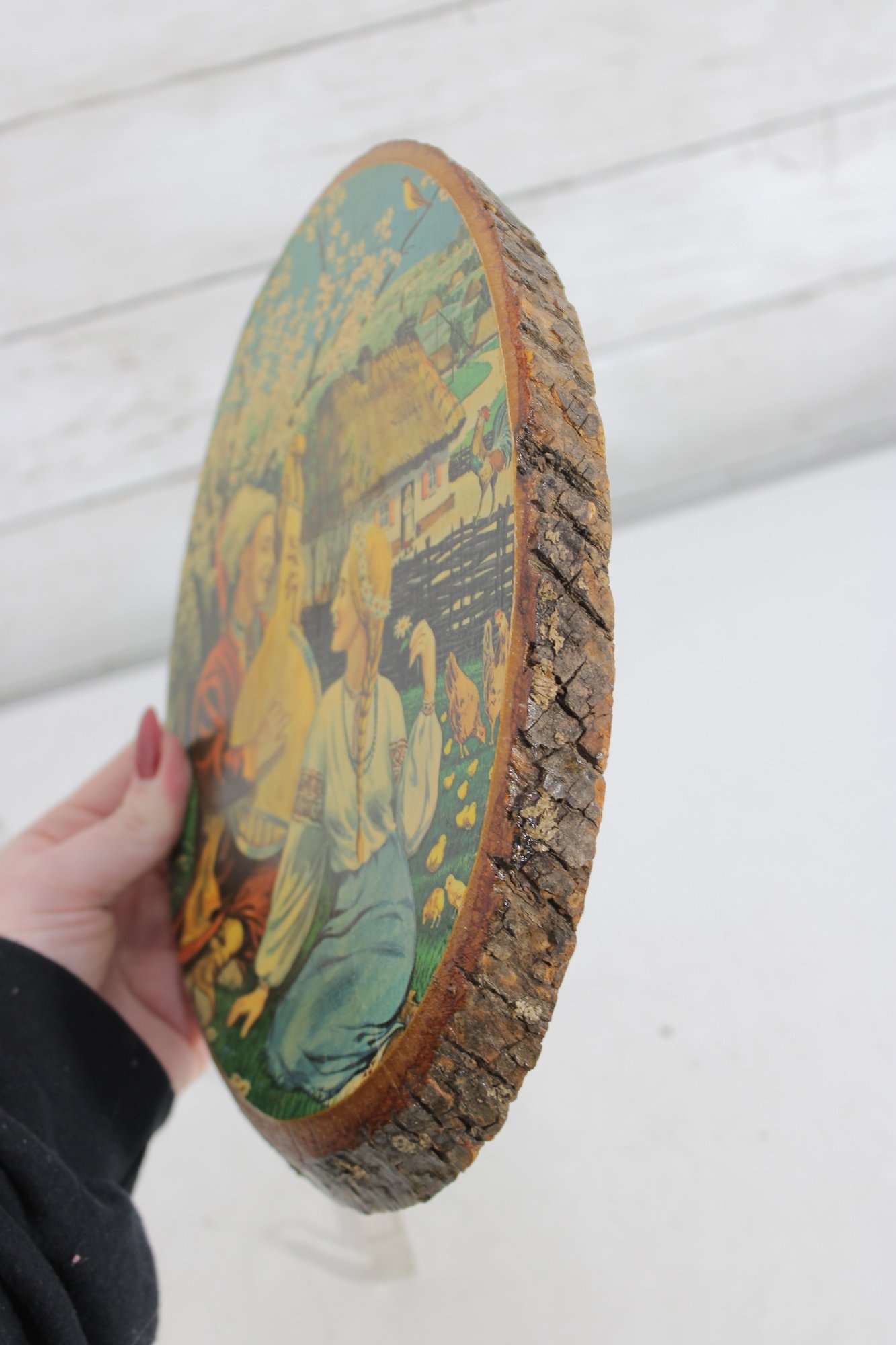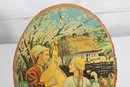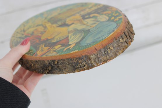 warmth and old-world charm to your home with this vintage folk art wood slice wall plaque, featuring a beautifully illustrated pastoral scene. Measuring 10” high x 8” wide, this piece combines rustic natural materials with colorful storytelling art.