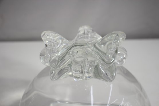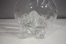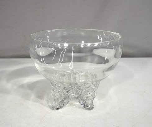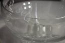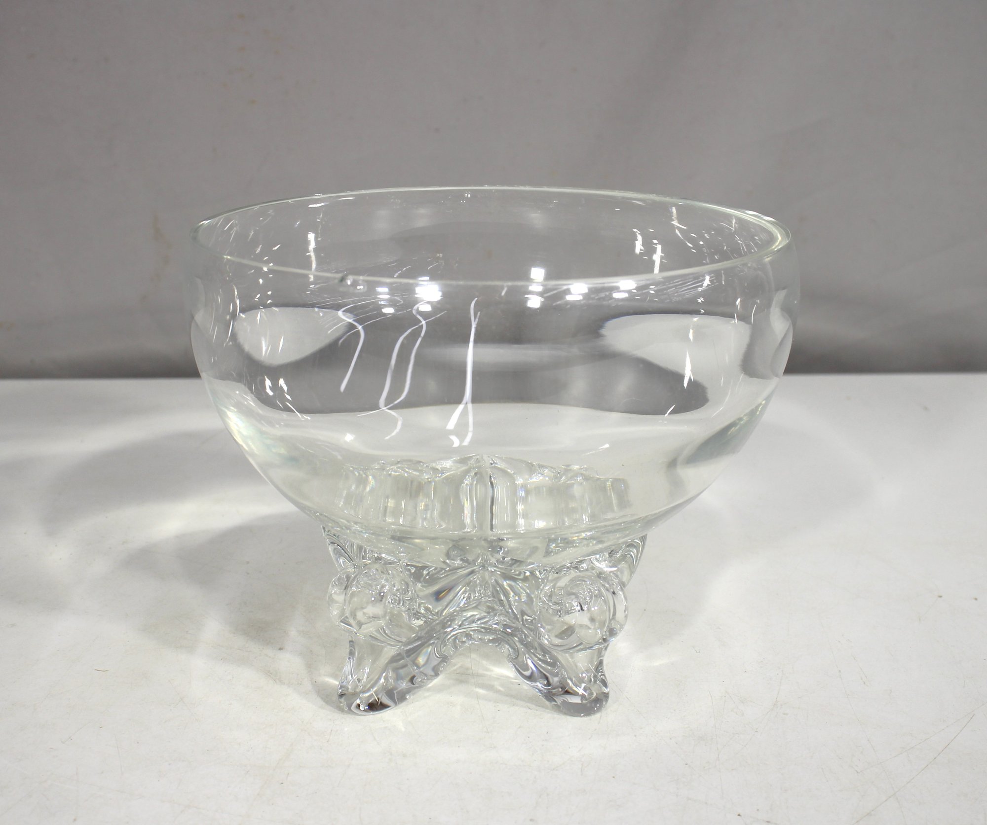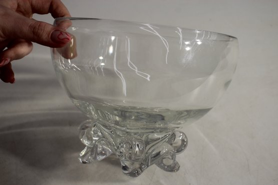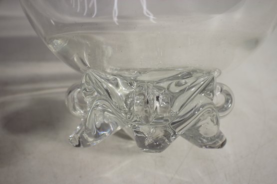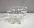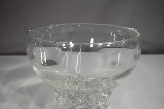 vintage footed glass bowl stands 6 inches tall and 8 inches in diameter, making it a perfect piece for serving punch, fruit, or displaying decorative accents. The bowl features a thick, clear glass construction with a rounded, slightly flared rim and a beautifully sculpted footed base adorned with intricate detailing.