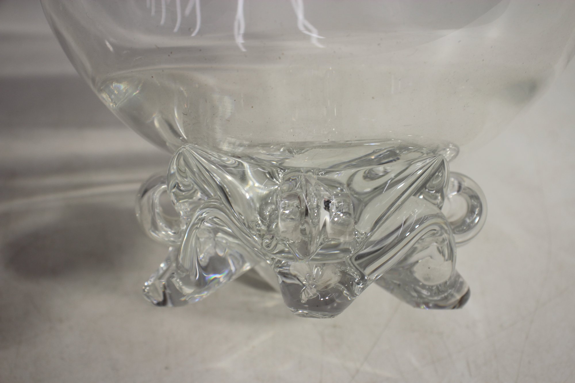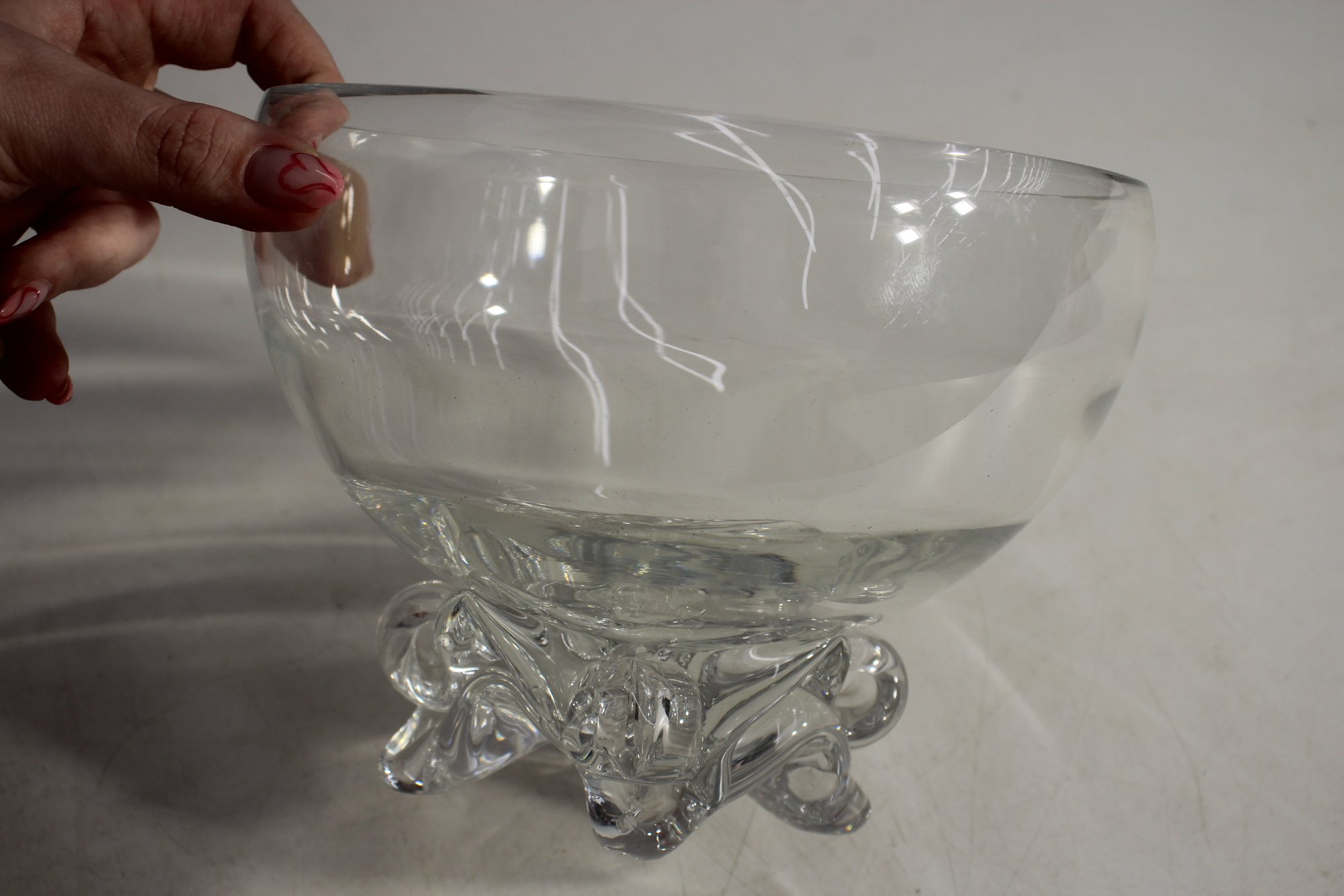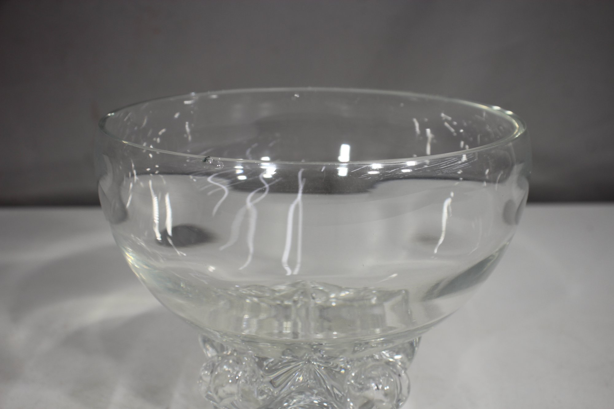 Its ornate, raised base design provides both stability and a touch of vintage charm. The glass has a smooth, slightly wavy texture, adding character to the bowl’s reflective quality. A small imperfection on the rim (as pictured) does not detract from its beauty and usability.