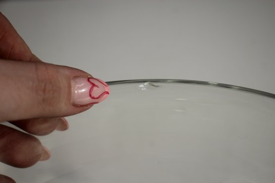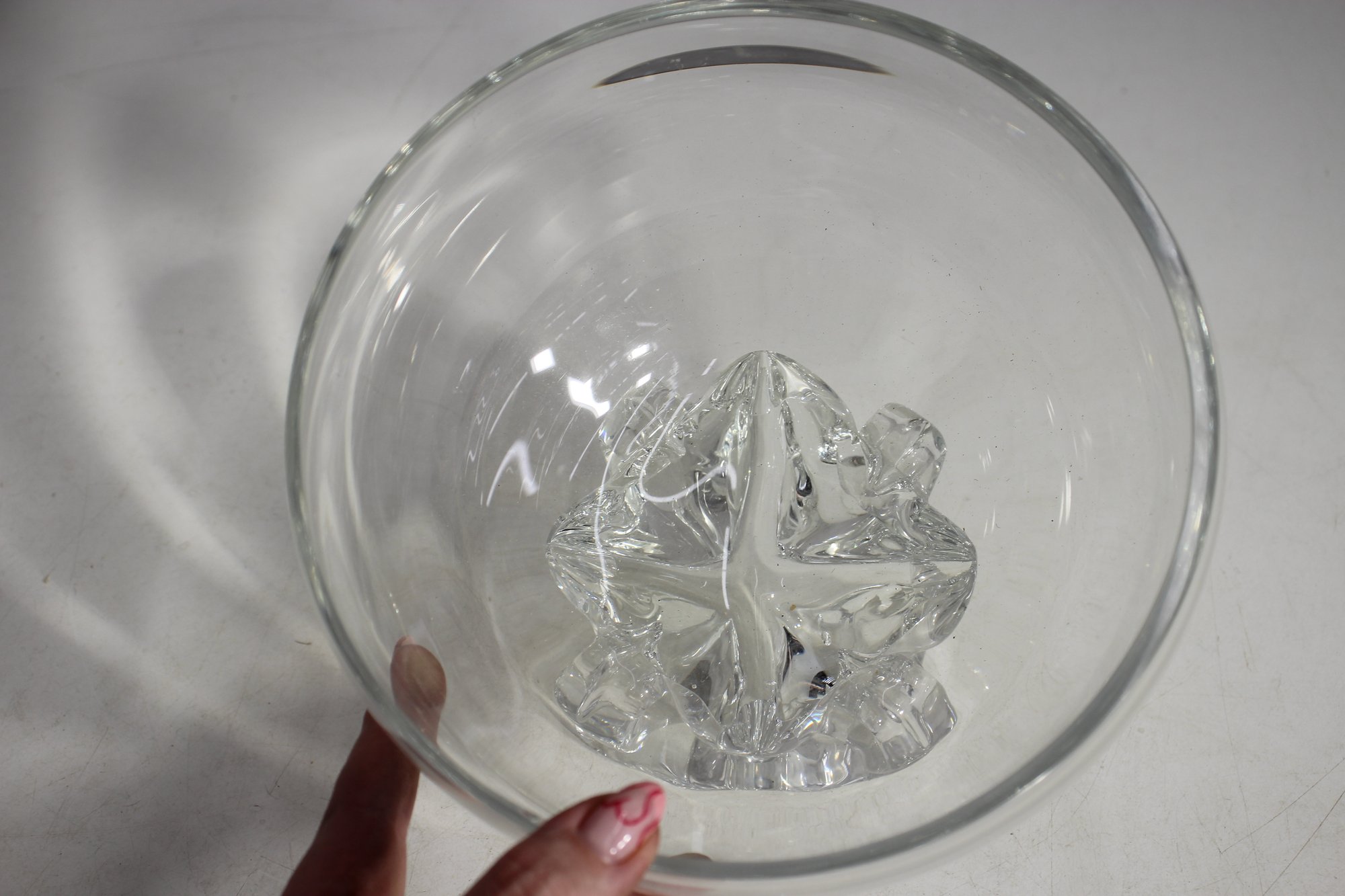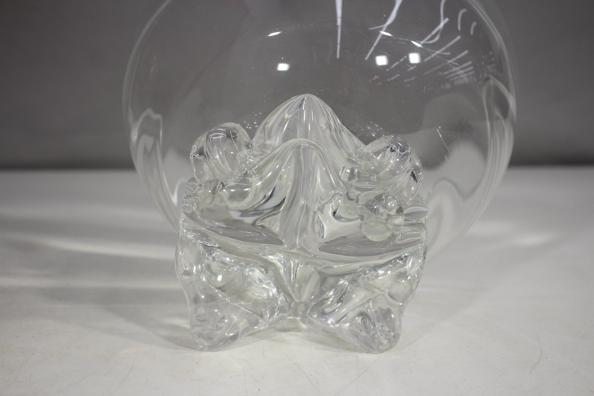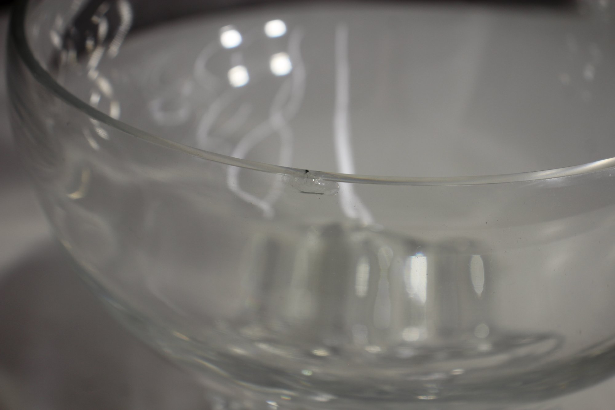 Its ornate, raised base design provides both stability and a touch of vintage charm. The glass has a smooth, slightly wavy texture, adding character to the bowl’s reflective quality. A small imperfection on the rim (as pictured) does not detract from its beauty and usability.