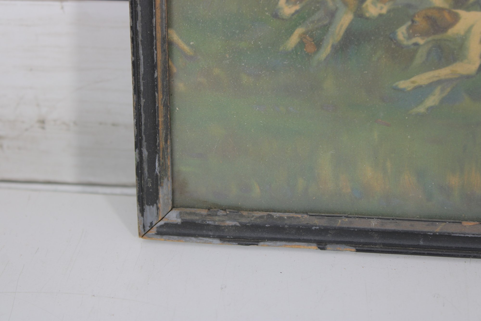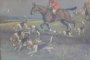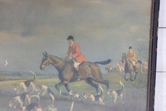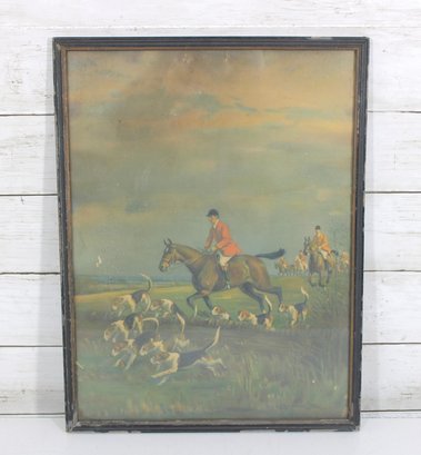 A vintage fox hunting sporting print depicting riders on horseback in traditional red hunting coats leading a pack of hounds across open countryside. The scene captures the excitement of the hunt as the lead rider guides the hounds while other riders follow behind.