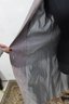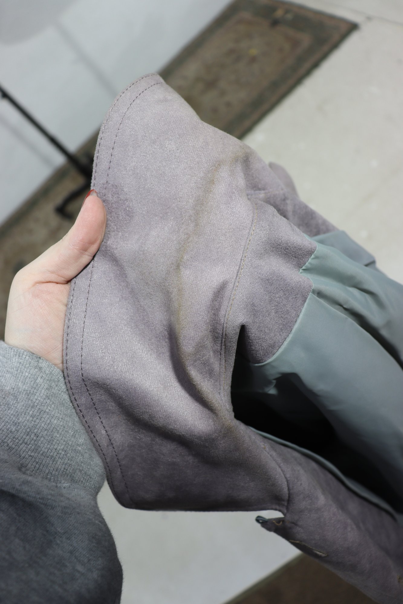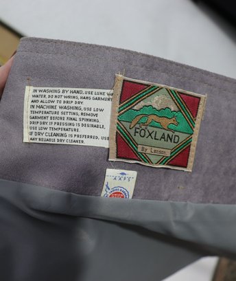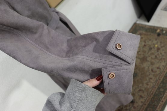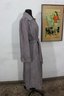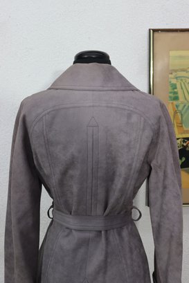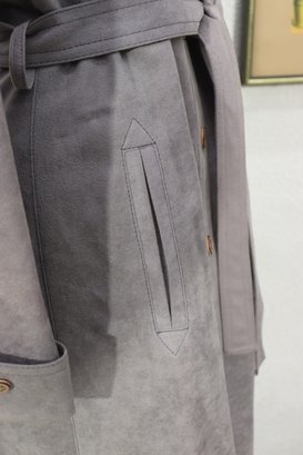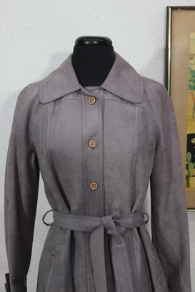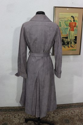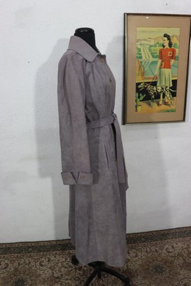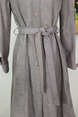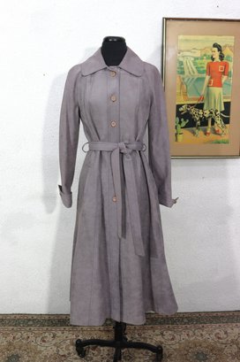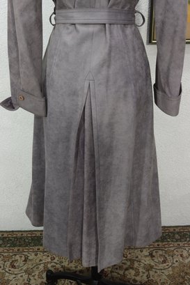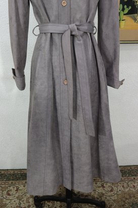 a vintage Foxland by Loden women’s long coat in size Small. This beautiful lightweight trench-style long coat features a gray suede-look exterior with matching belt tie waist and button front closure. Feminine tailored shape with a classic 1970s / early 80s styling feel to it.