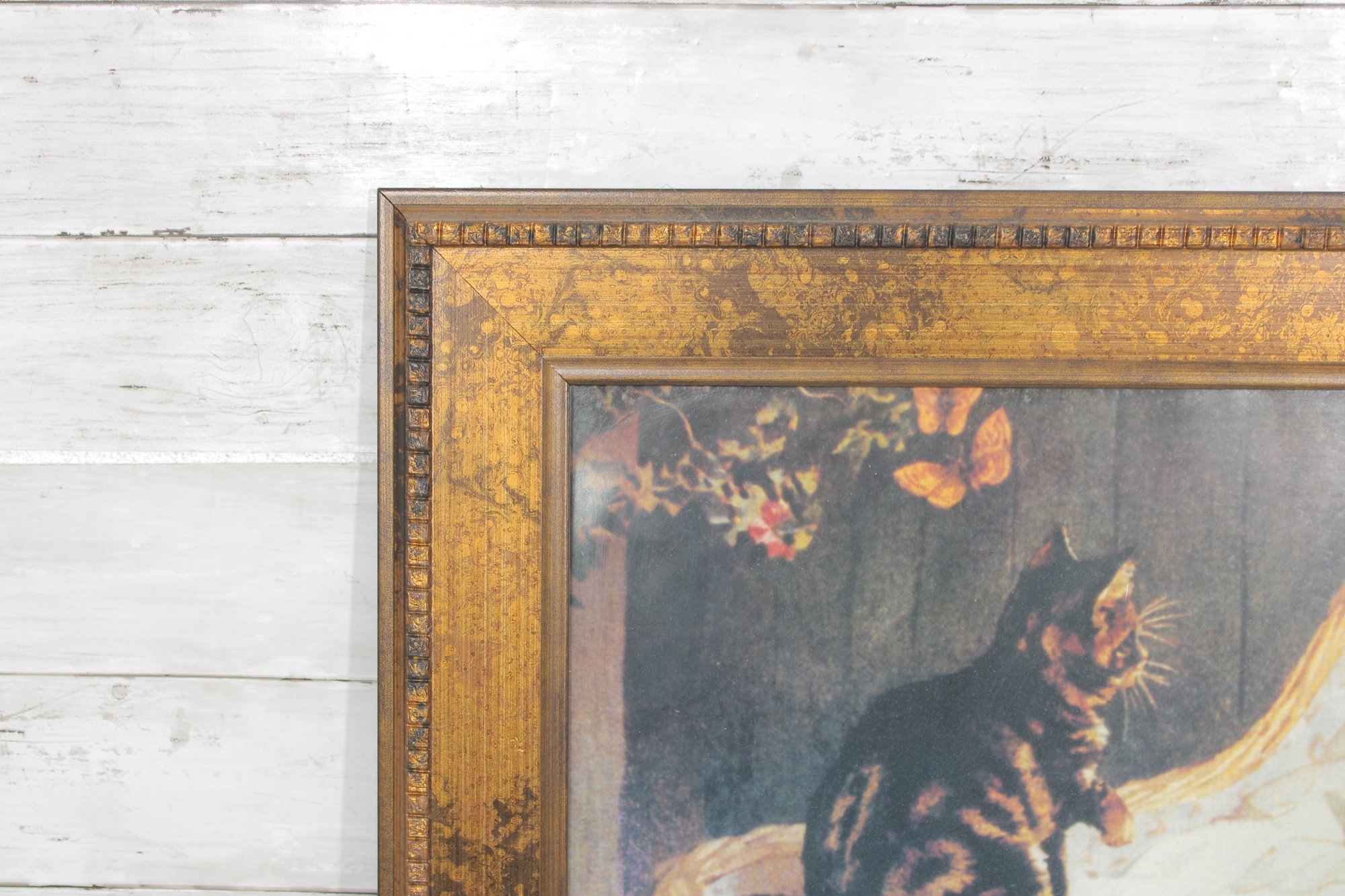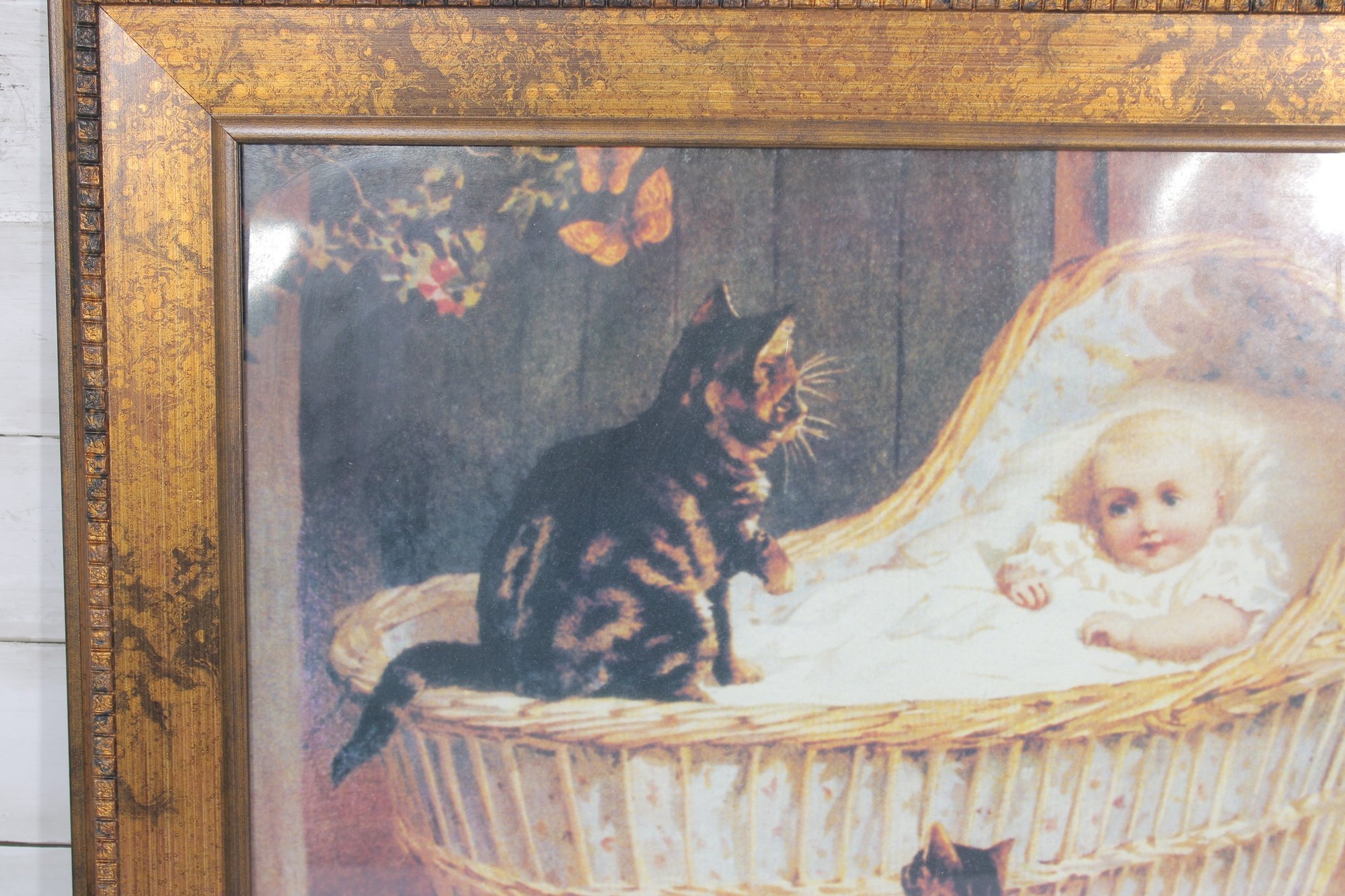 The artwork shows a smiling baby resting in a bassinet while two kittens curiously interact nearby. Soft florals and butterflies enhance the gentle, sentimental atmosphere of the scene. The print is housed in an ornate gold-tone frame with decorative detailing that complements the warmth of the artwork.