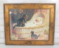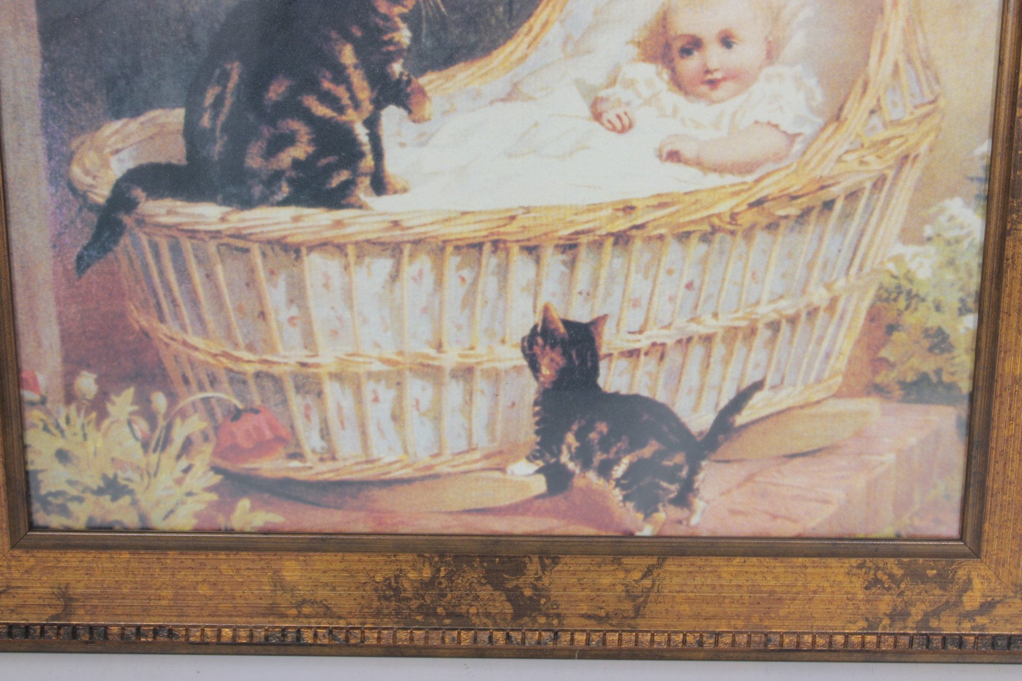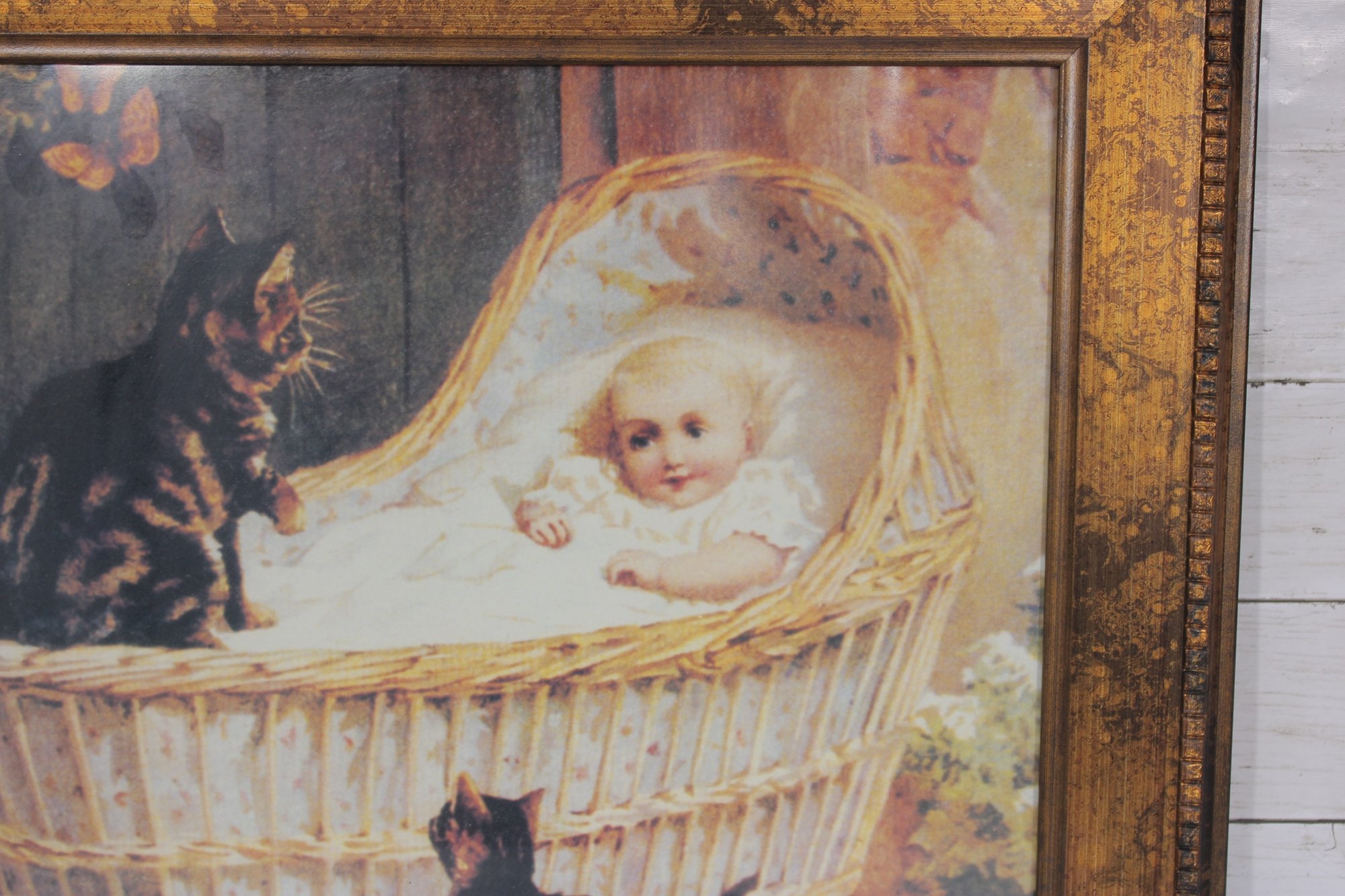 a charming vintage framed print depicting a sweet nursery scene featuring a baby in a wicker bassinet with playful kittens. The warm tones and nostalgic subject matter give this piece wonderful vintage appeal.