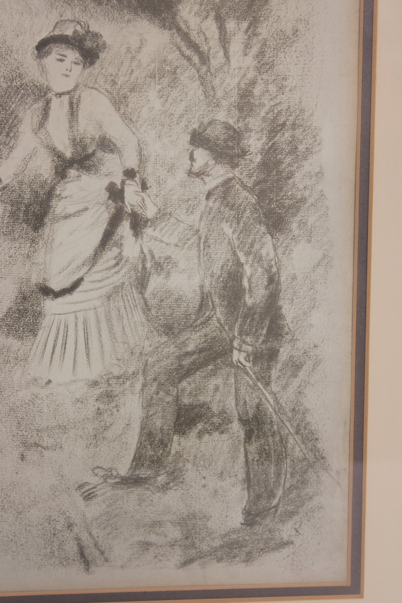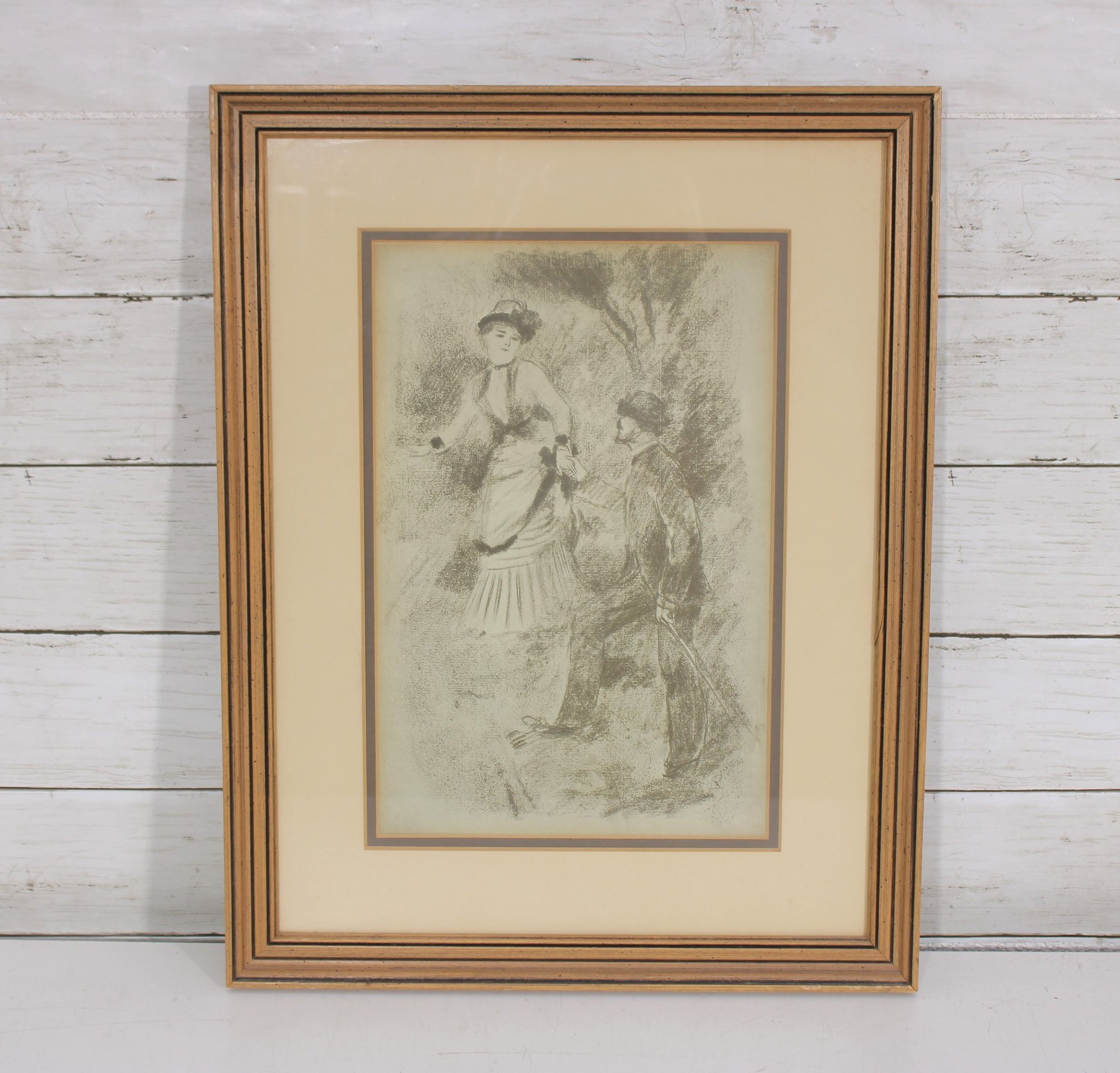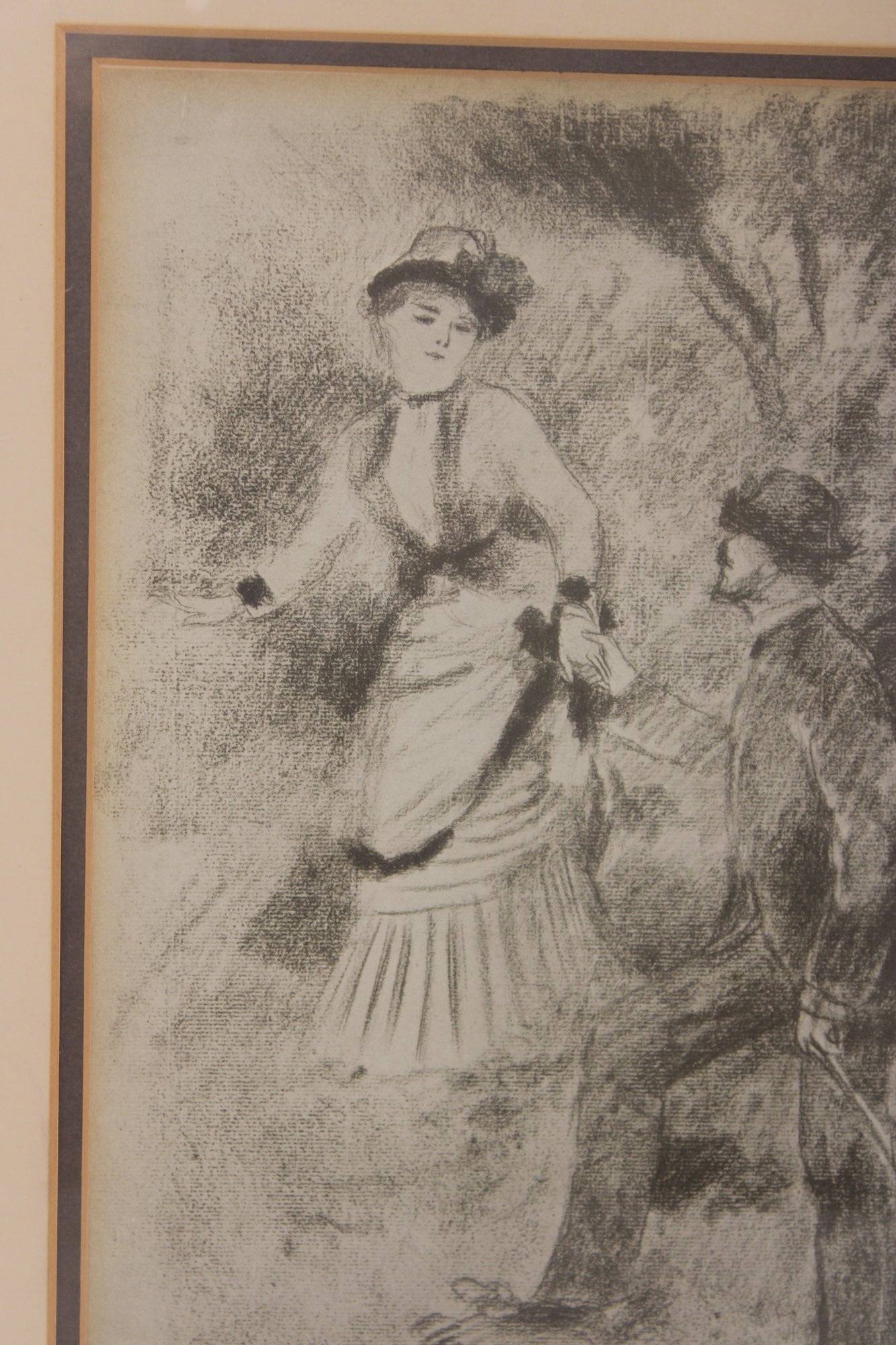 framed print features a charming black-and-white illustration of a Victorian-era couple strolling through a pastoral setting. The woman, dressed in a flowing skirt and hat, is accompanied by a gentleman at her side, capturing a romantic moment in time with fine linework and period detail.