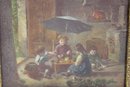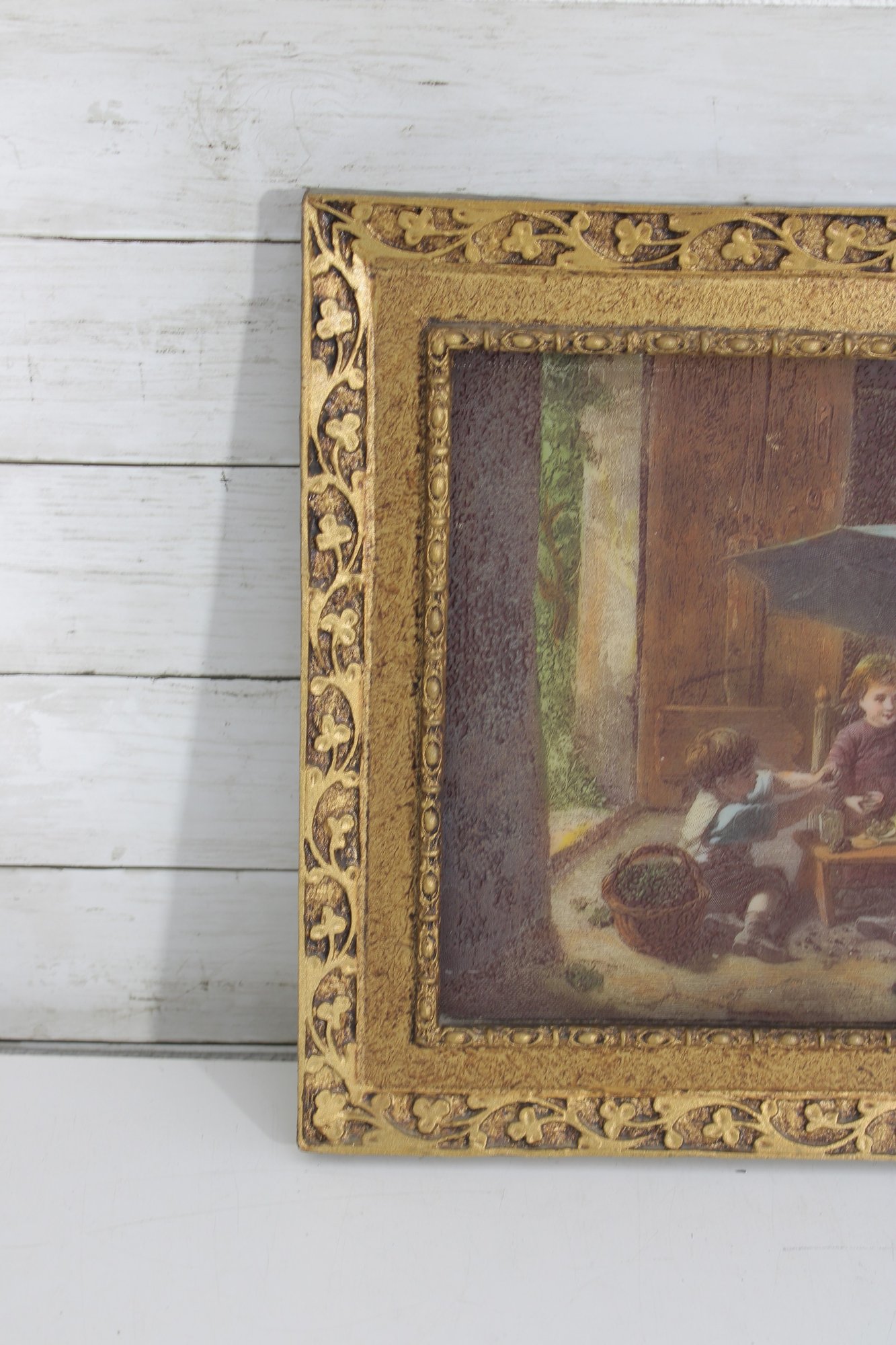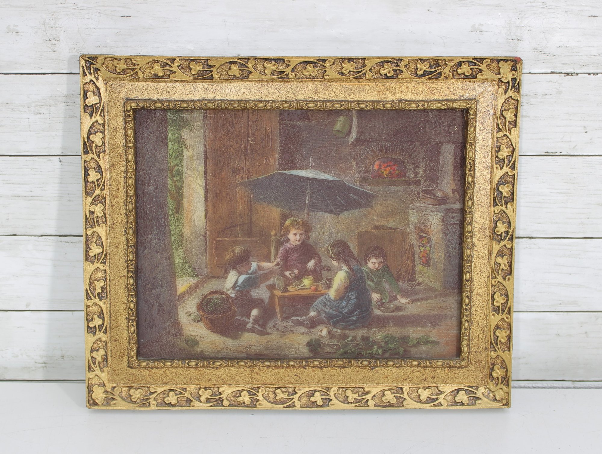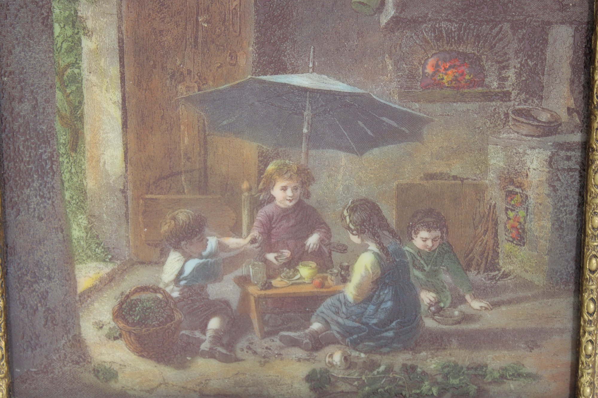 vintage art print depicts a warm, nostalgic scene of children gathered around a small table beneath an umbrella, set in a cozy, old-world interior. Rendered in soft, painterly tones, the image captures a sense of innocence and timeless storytelling that feels straight out of a classic storybook.