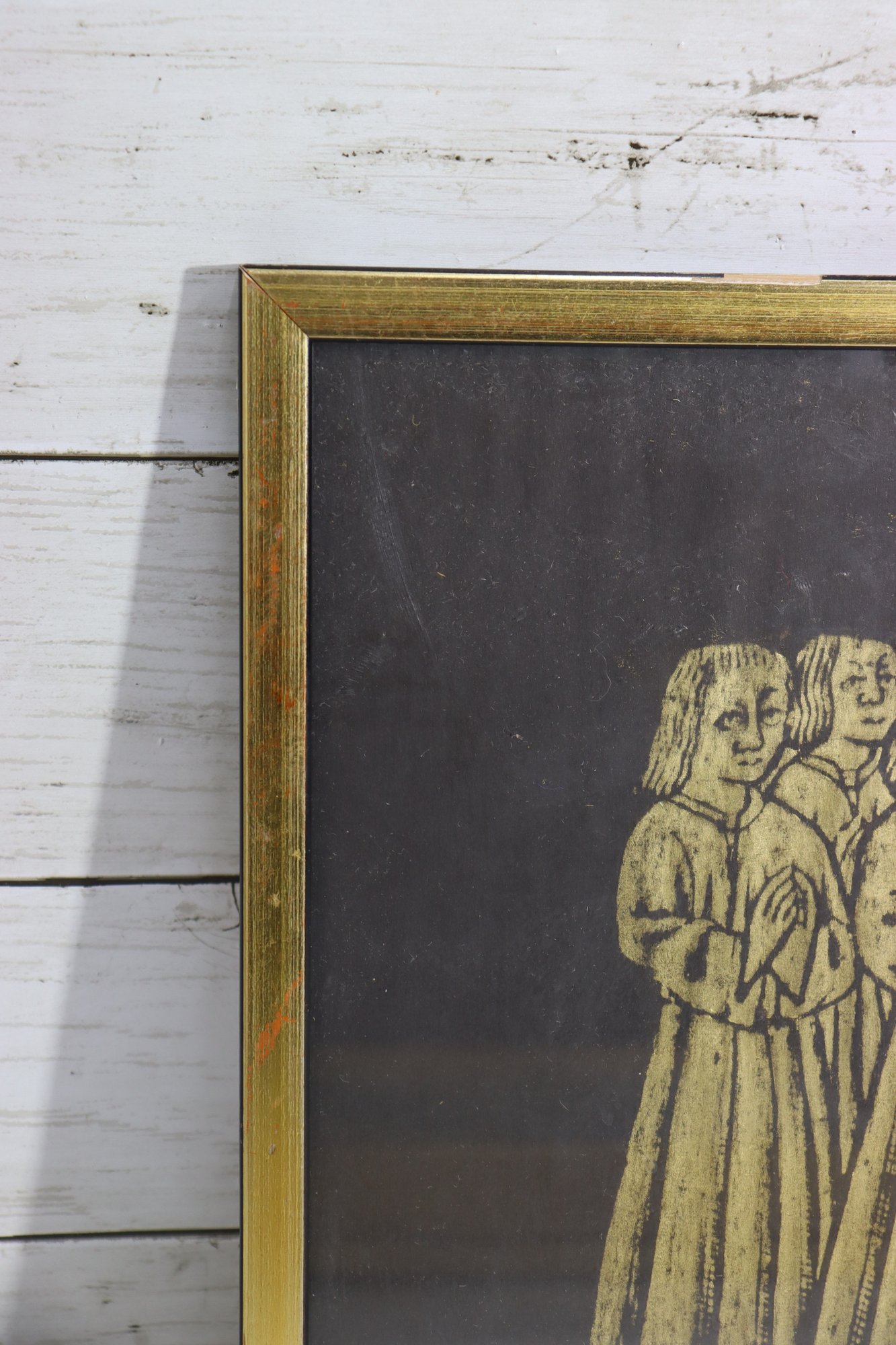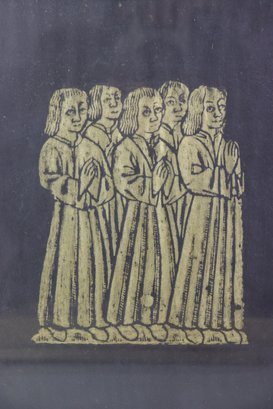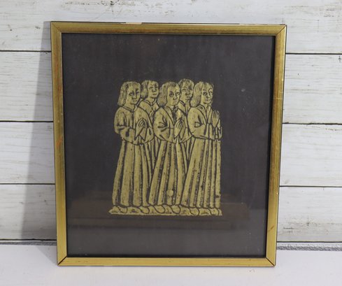 Offered here is a vintage framed rubbing style artwork of medieval era praying figures. This piece features six robed individuals standing side-by-side in prayer, rendered in a gold/ochre tone against a dark background. Very classical Old World / Gothic style imagery – great for antique, monastery style, history inspired décor.