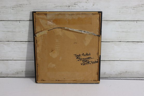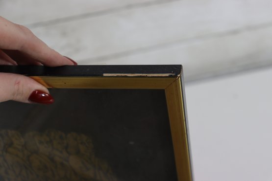 The art is framed behind glass in a simple gold tone metal frame and is ready to hang. This style of image is reminiscent of historical brass rubbings or church monument engravings.